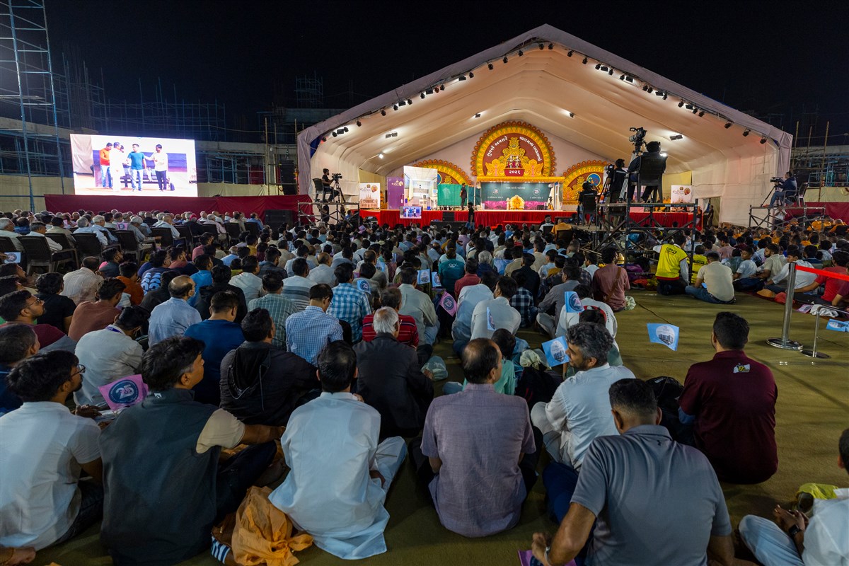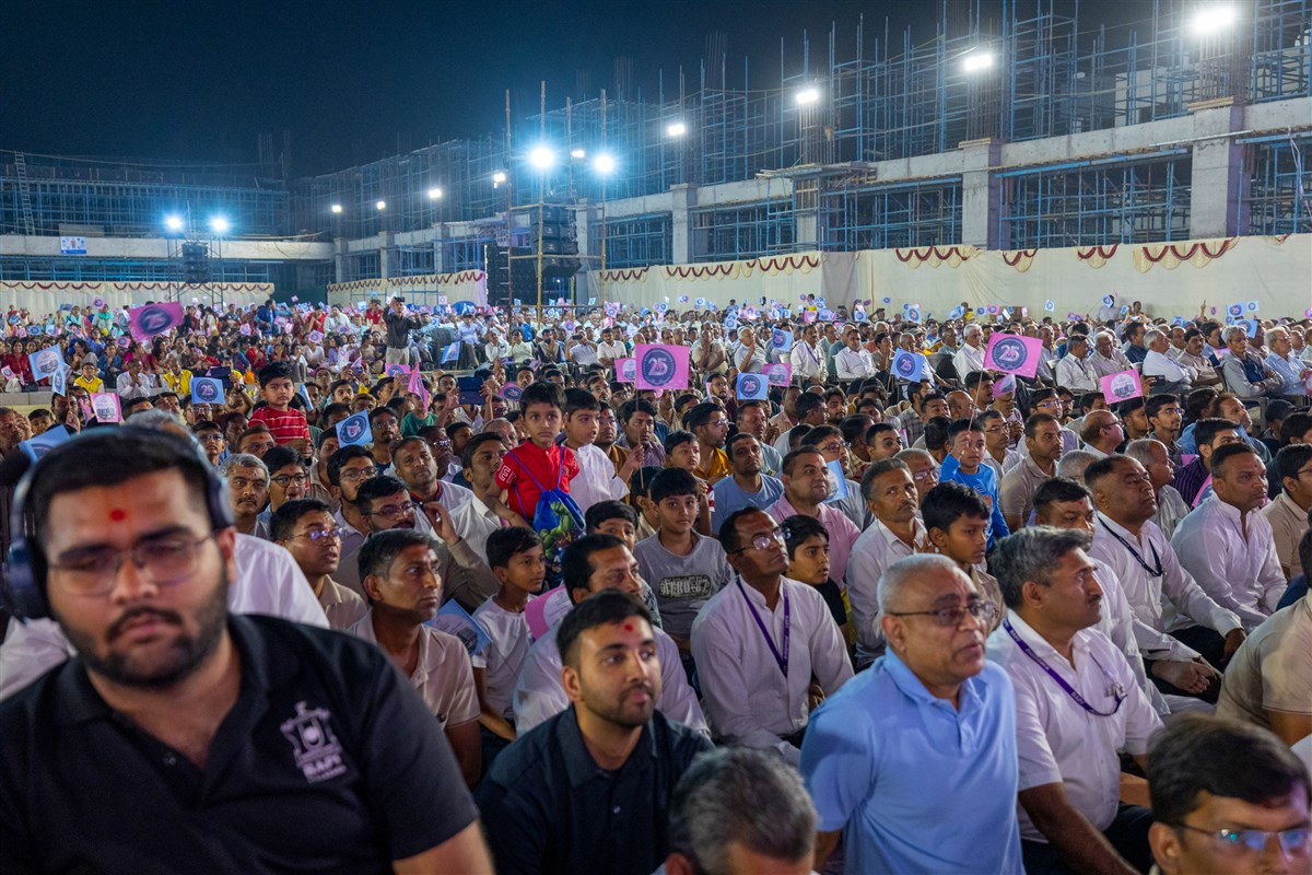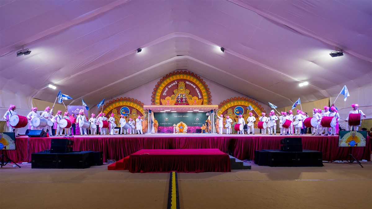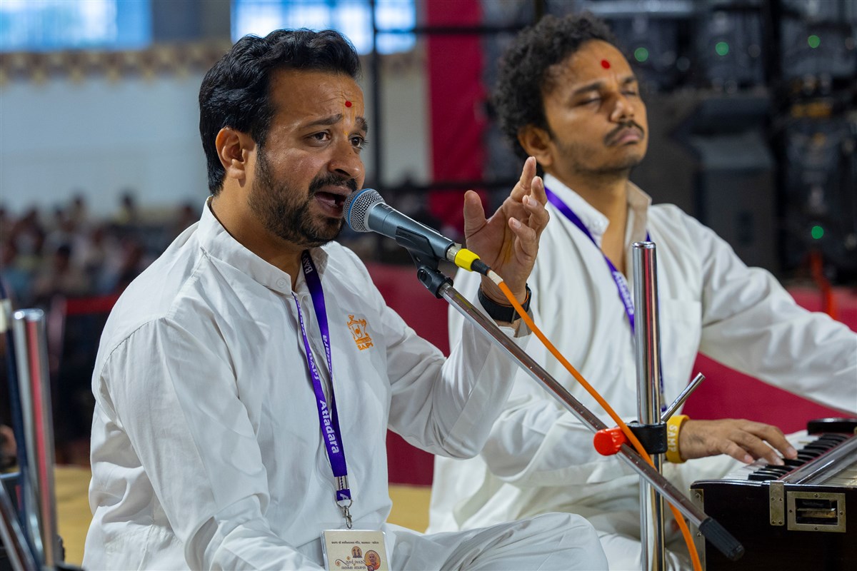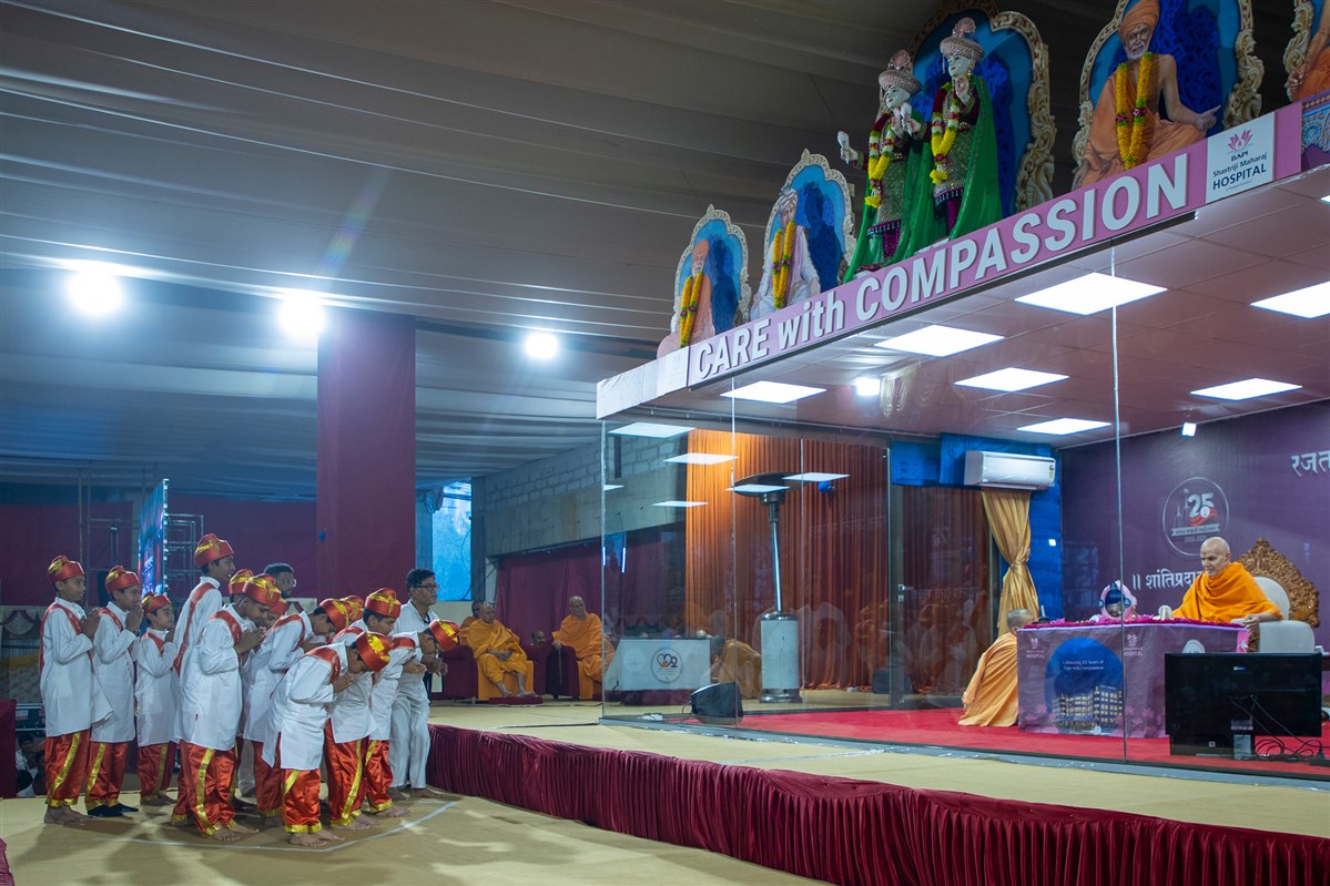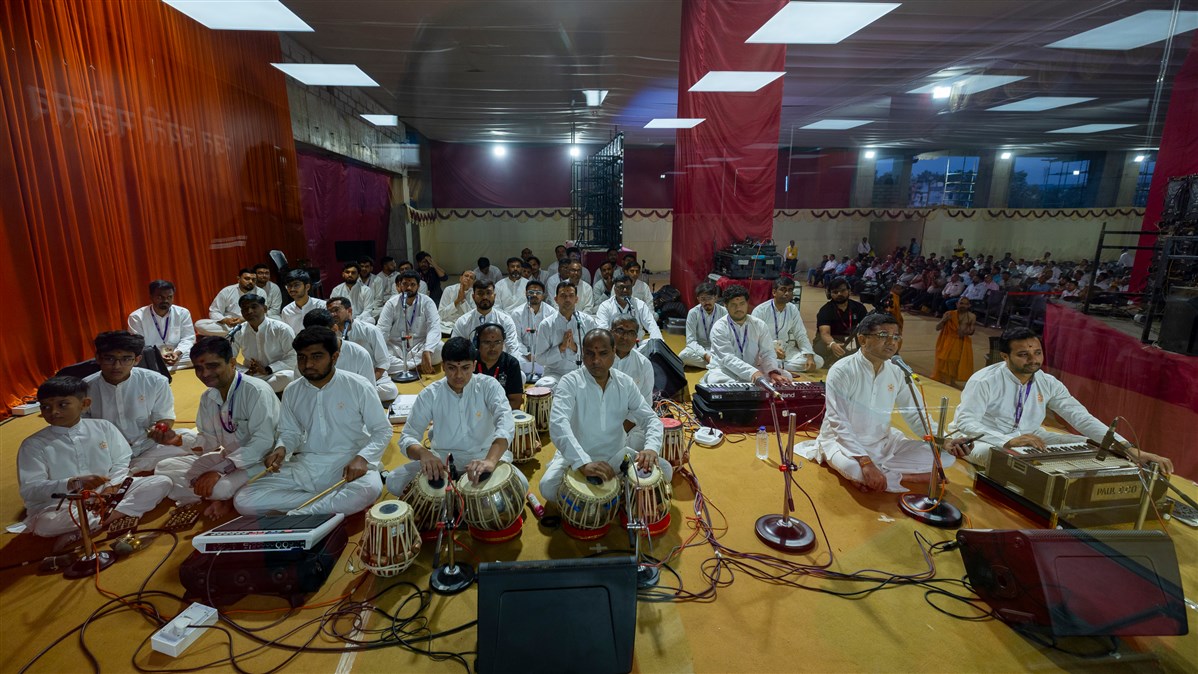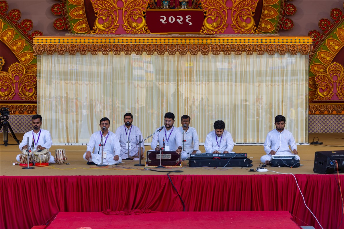 Yuvaks sing kirtans at the beginning of the 'Silver Jubilee Celebration of Shastriji Maharaj Hospital' assembly in the evening