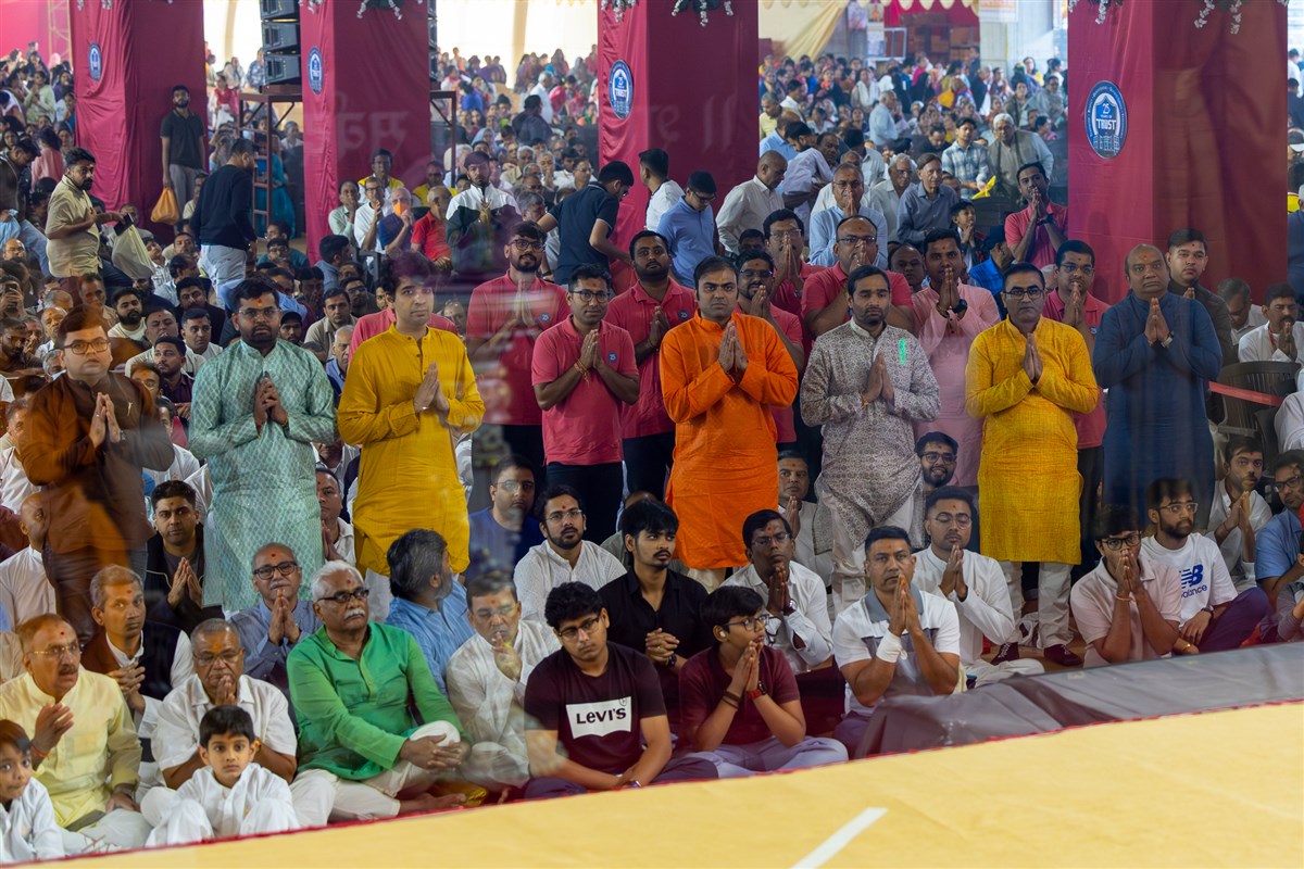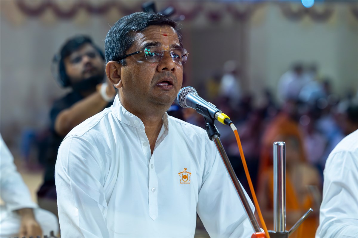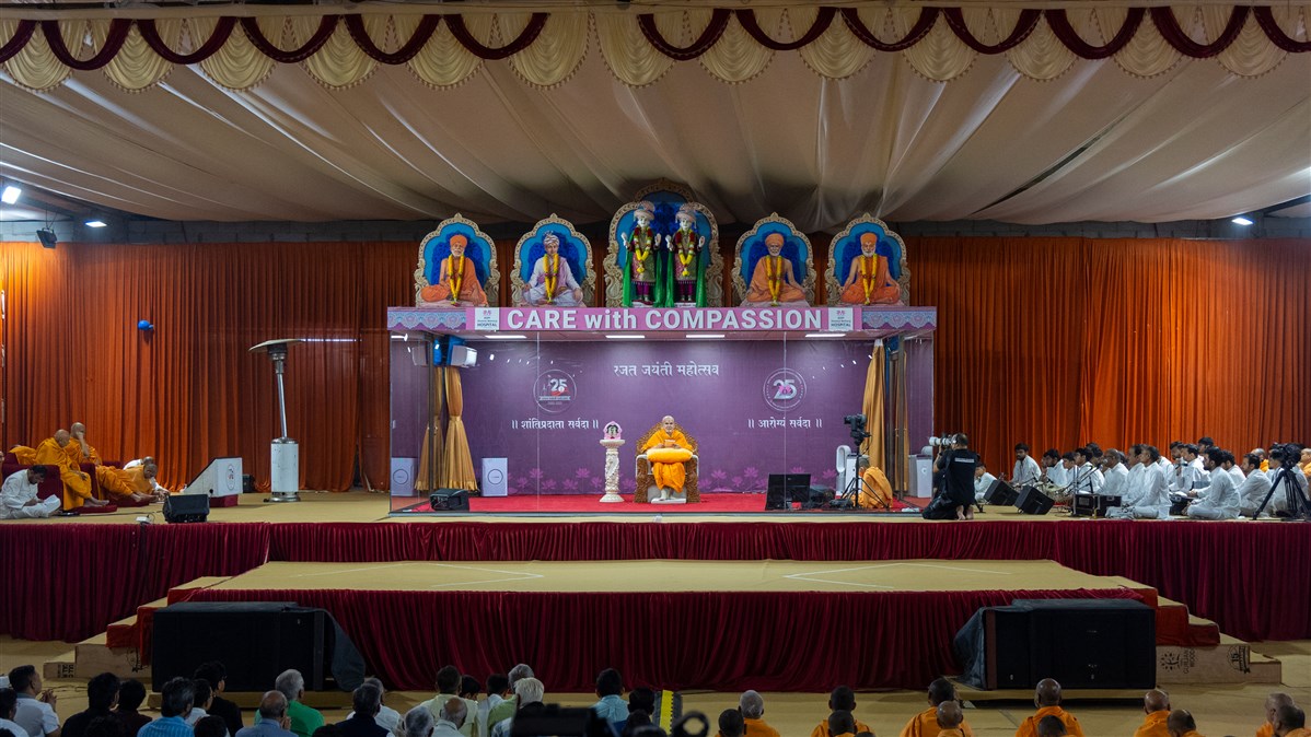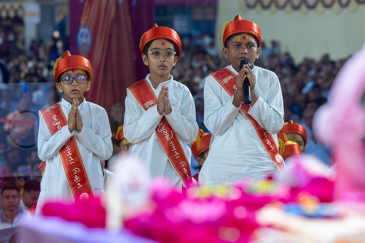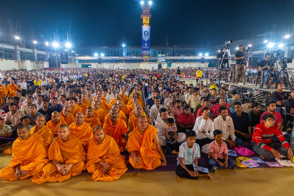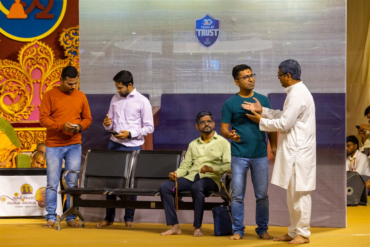 Yuvaks sing kirtans at the beginning of the 'Silver Jubilee Celebration of Shastriji Maharaj Hospital' assembly in the evening