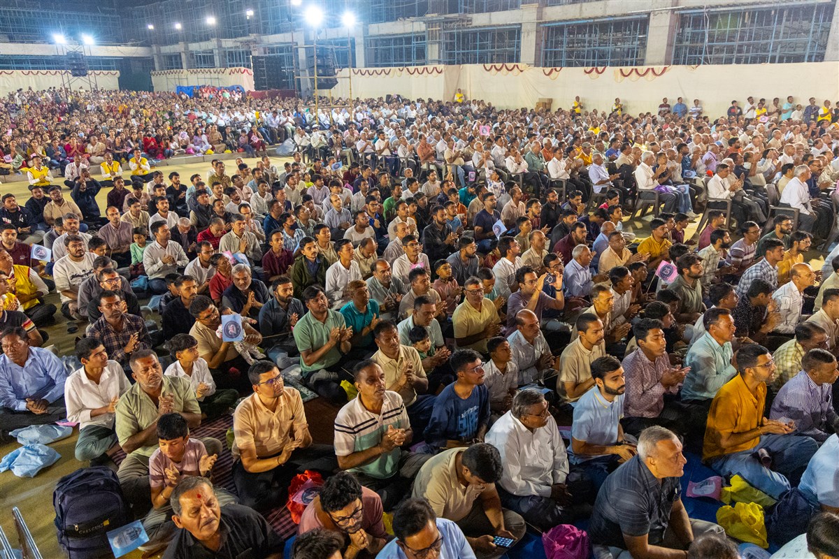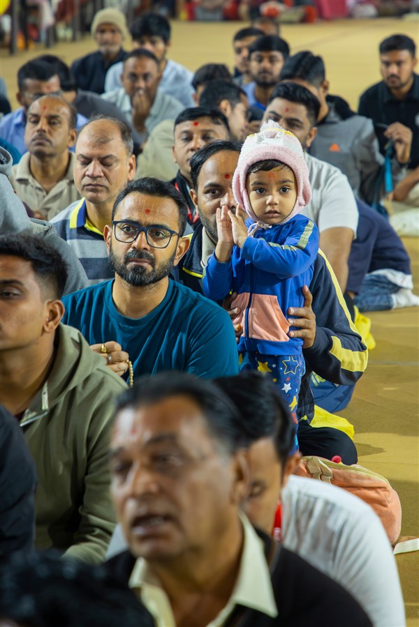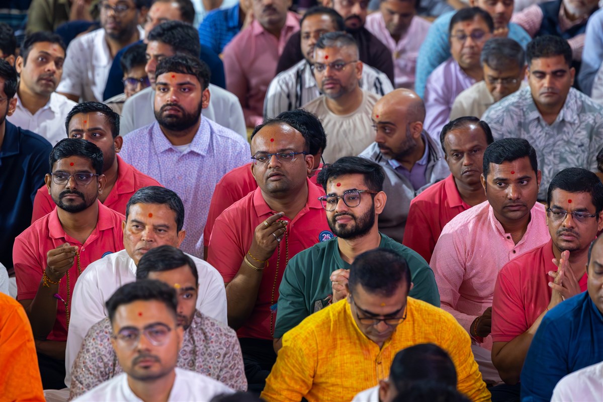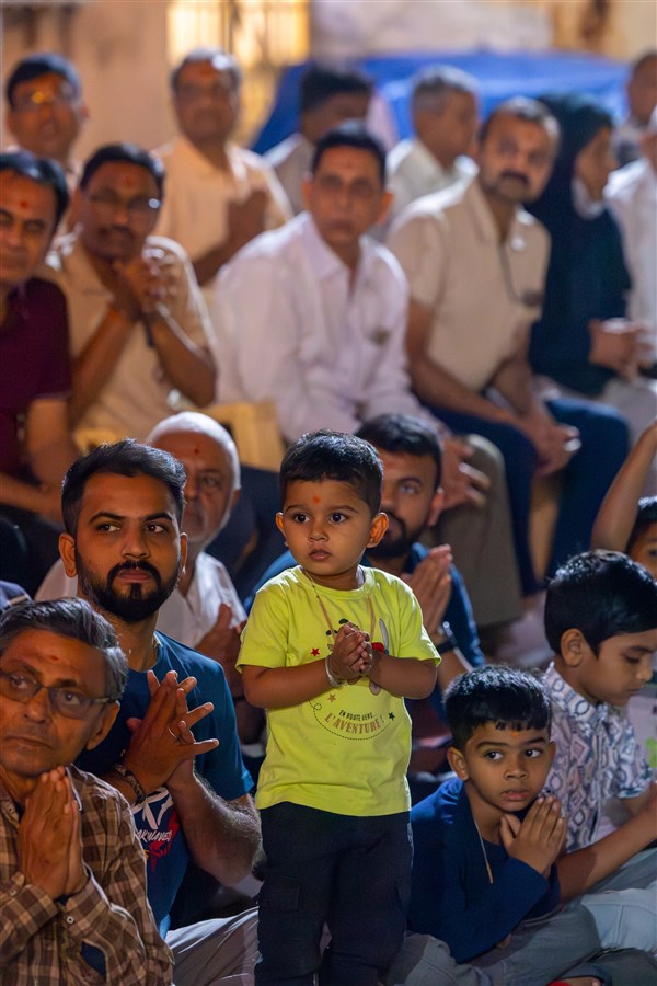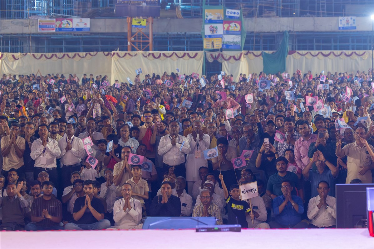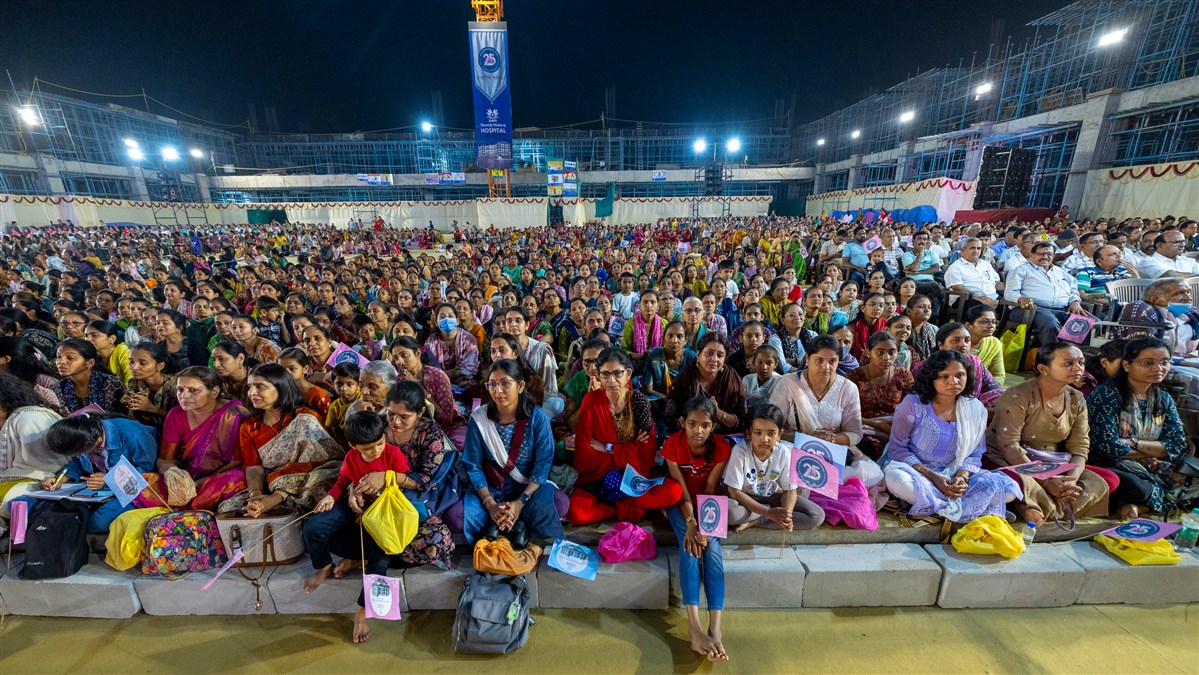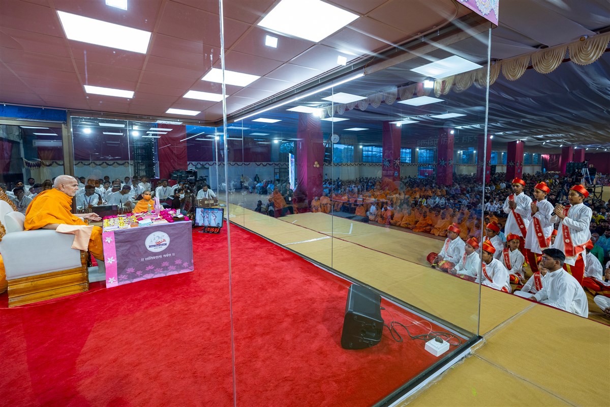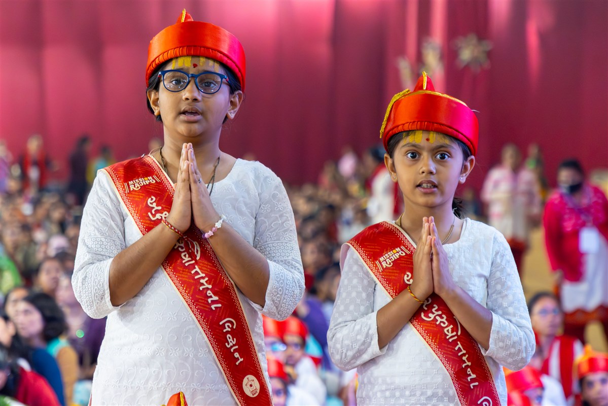 Yuvaks sing kirtans at the beginning of the 'Silver Jubilee Celebration of Shastriji Maharaj Hospital' assembly in the evening