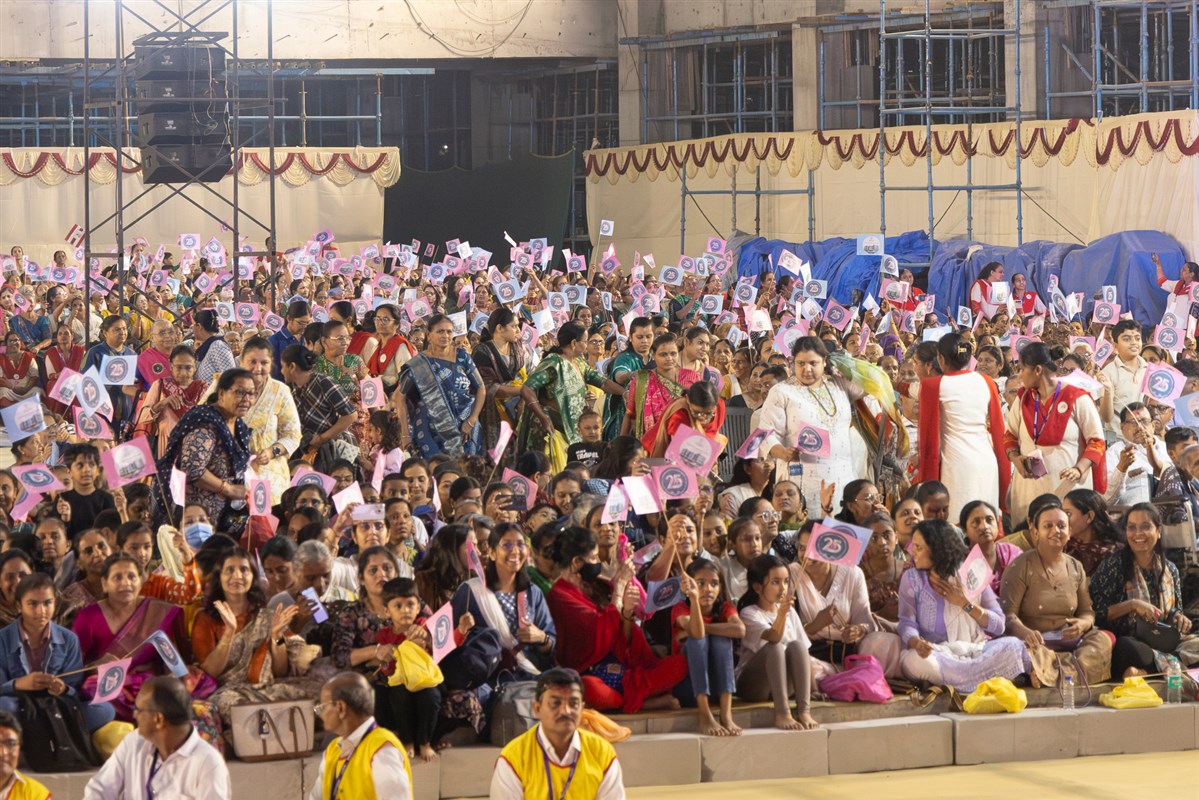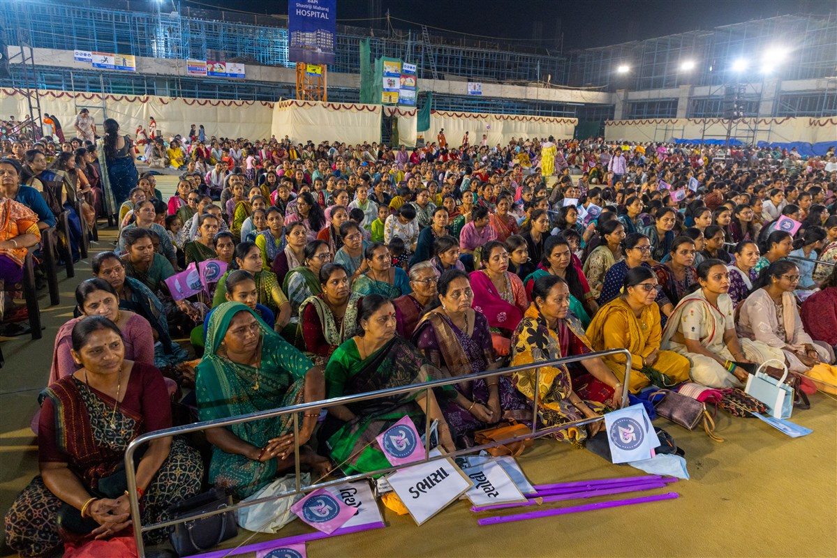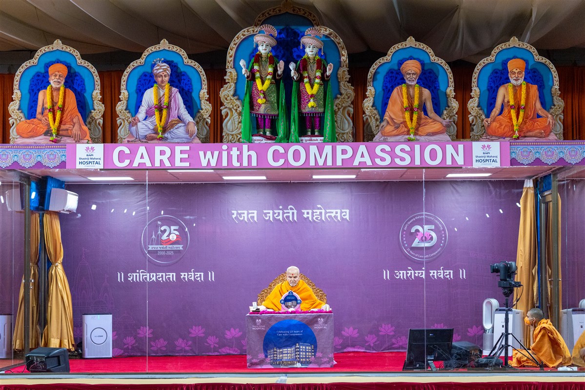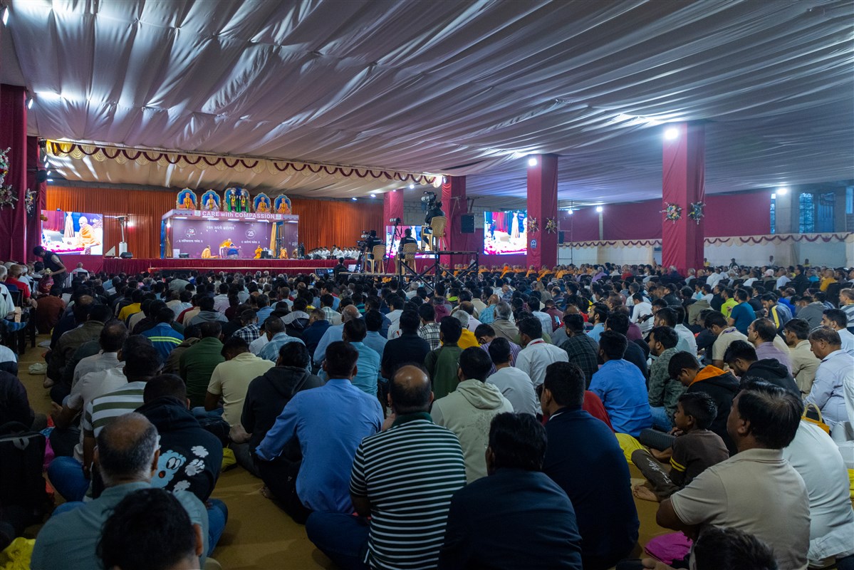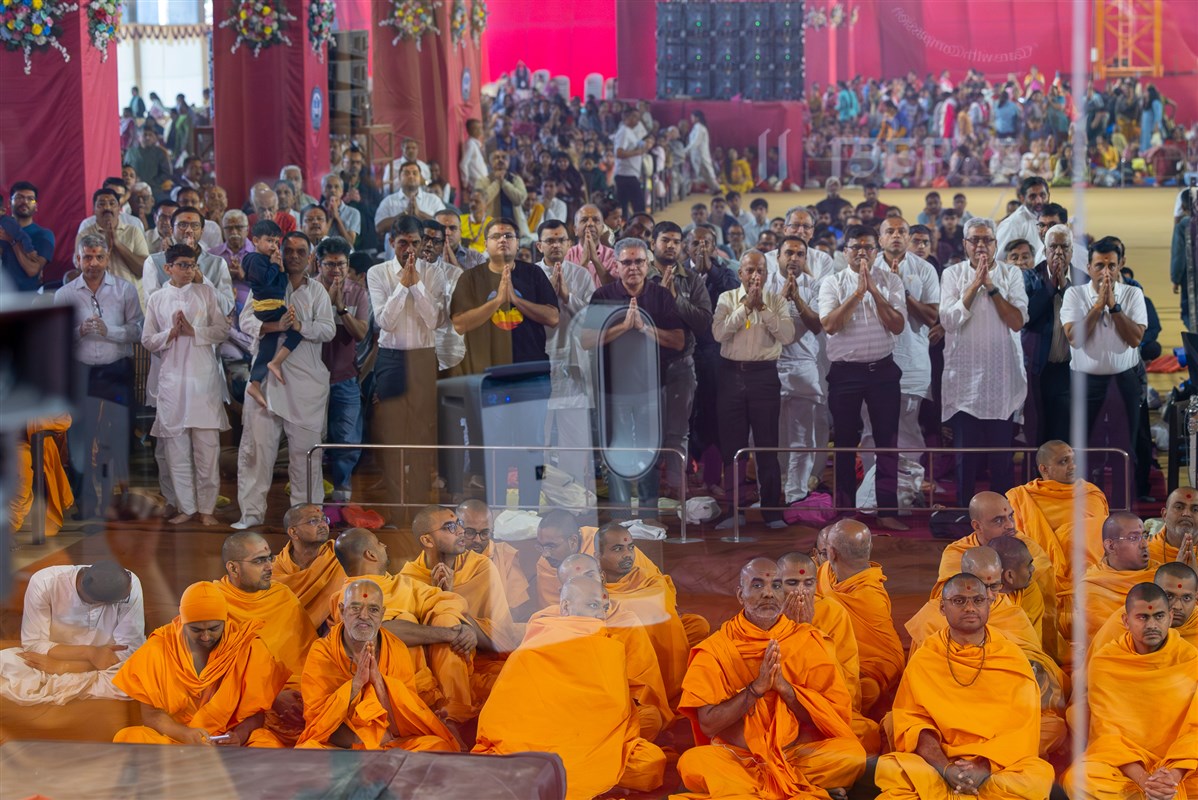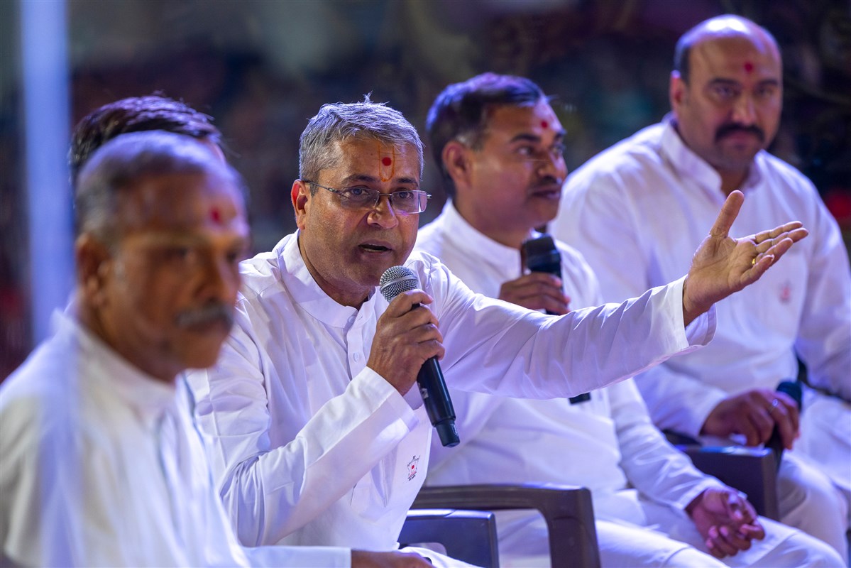 Yuvaks sing kirtans at the beginning of the 'Silver Jubilee Celebration of Shastriji Maharaj Hospital' assembly in the evening
