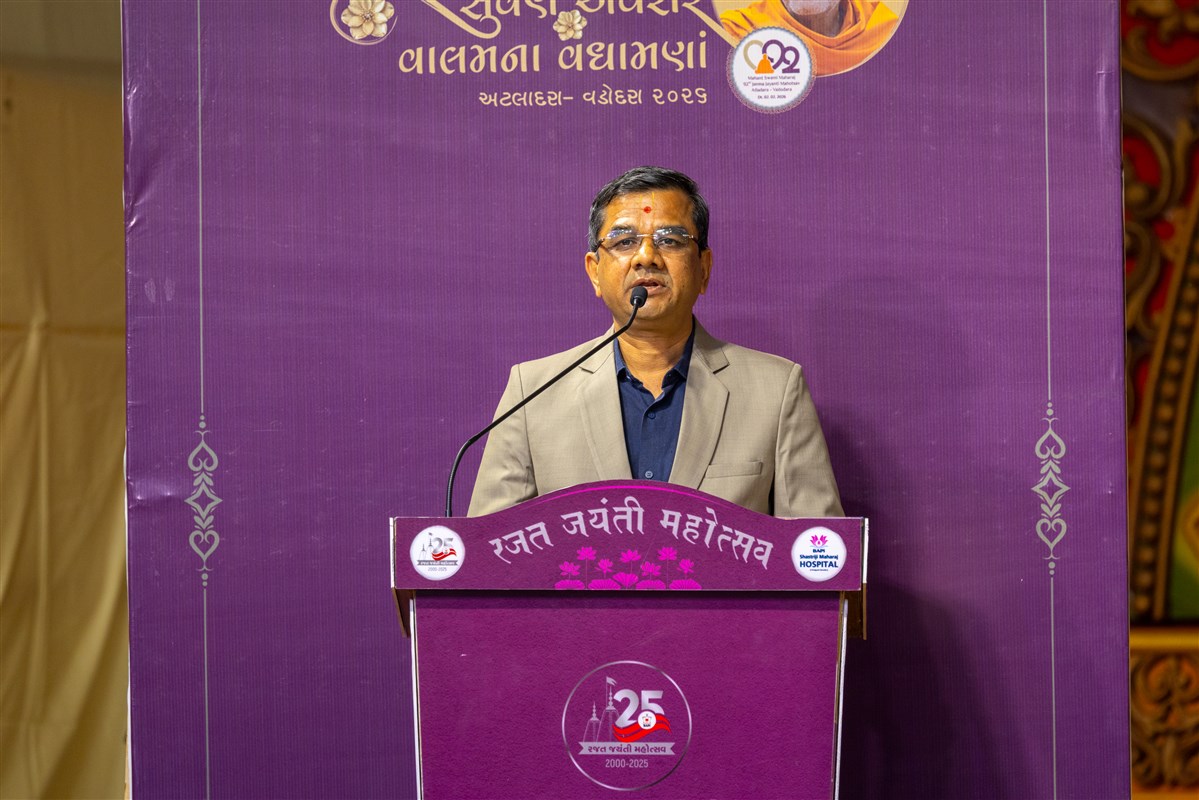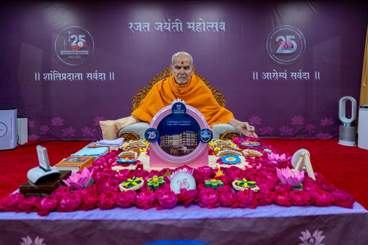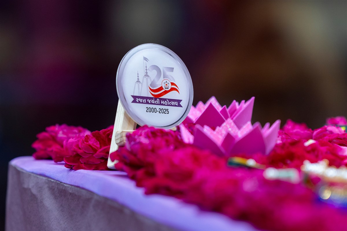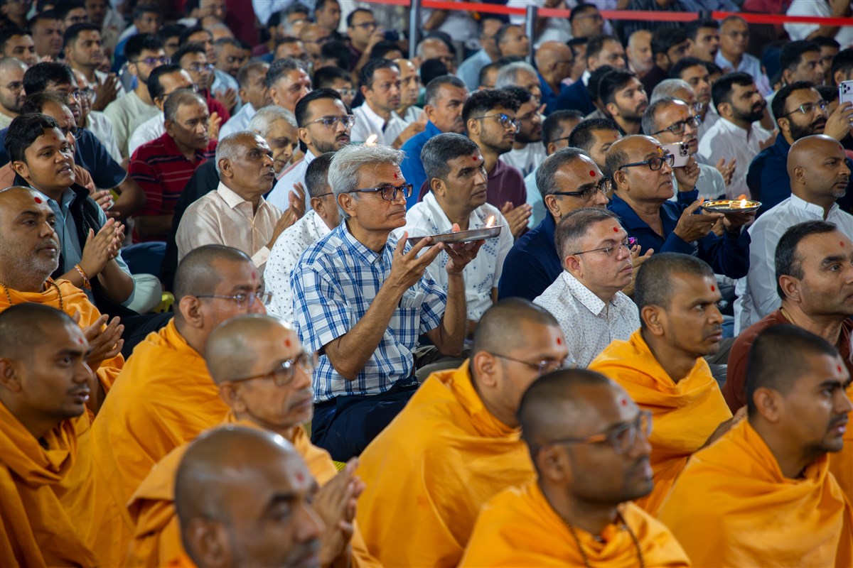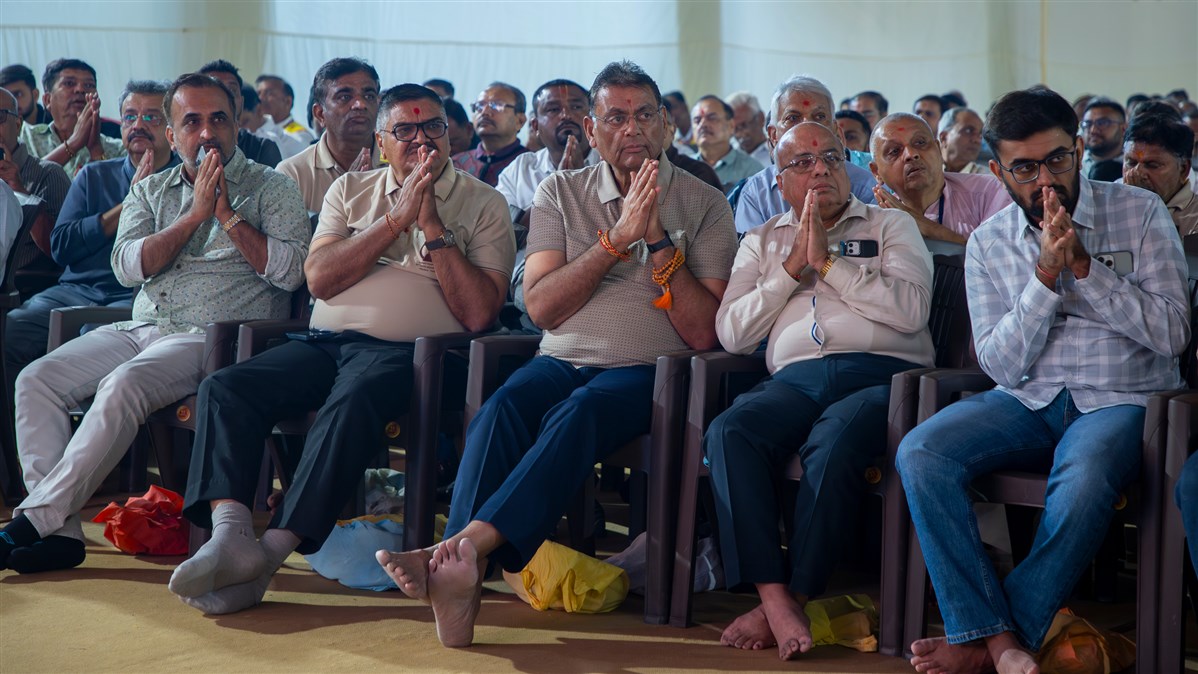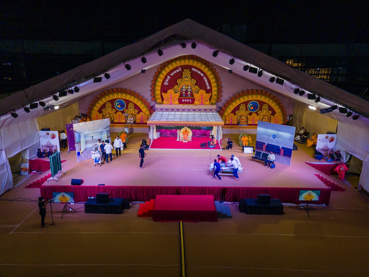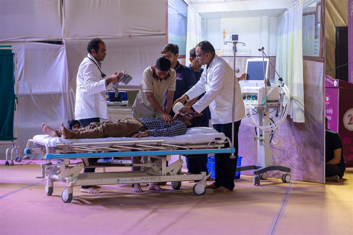Yuvaks sing kirtans at the beginning of the 'Silver Jubilee Celebration of Shastriji Maharaj Hospital' assembly in the evening