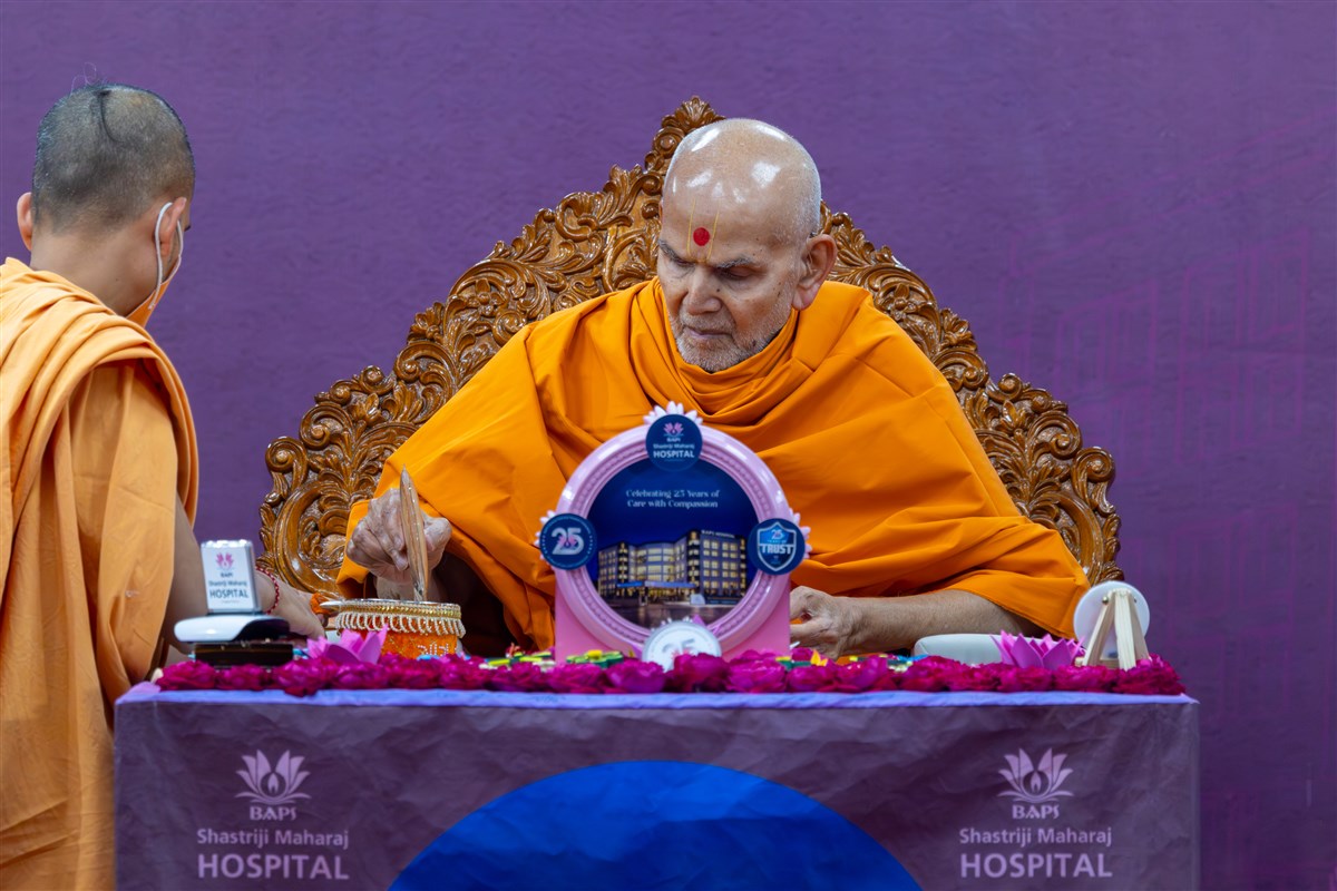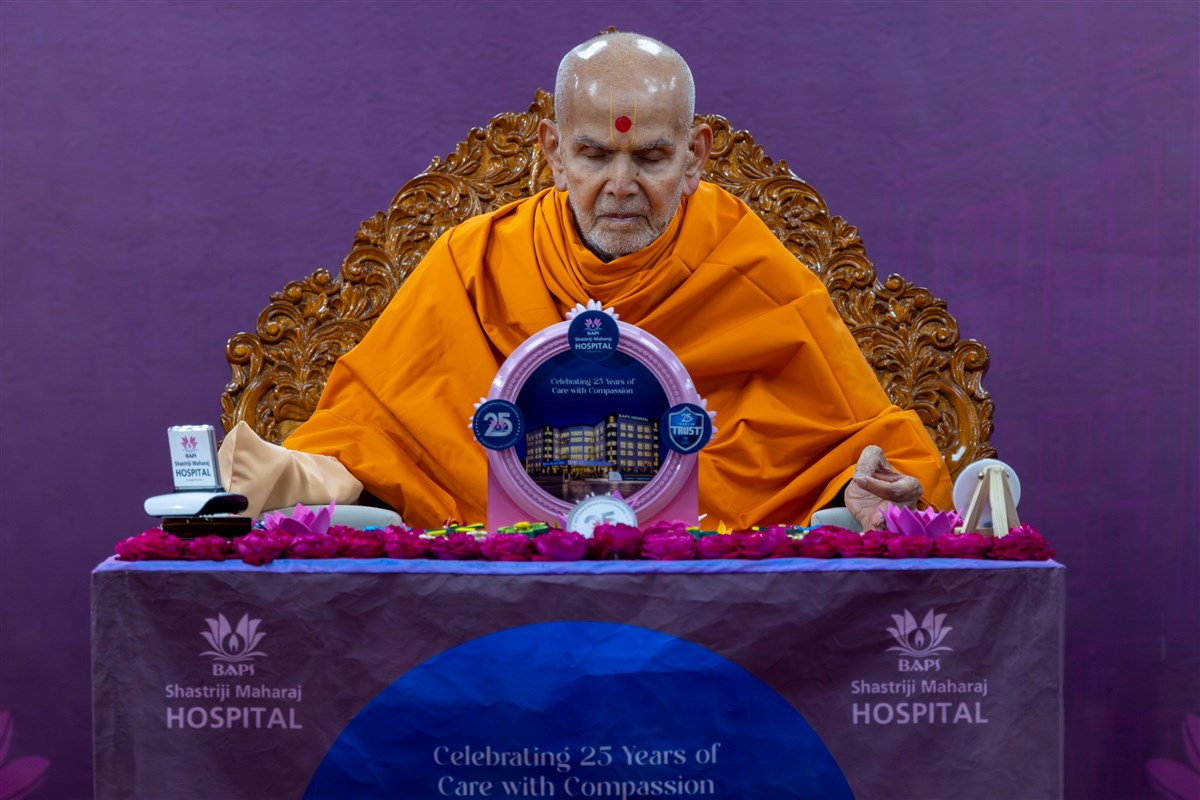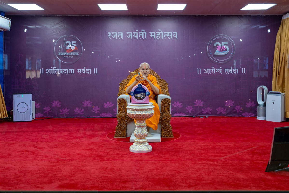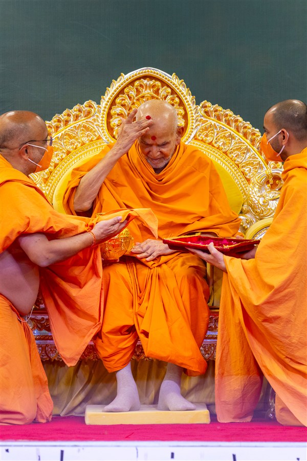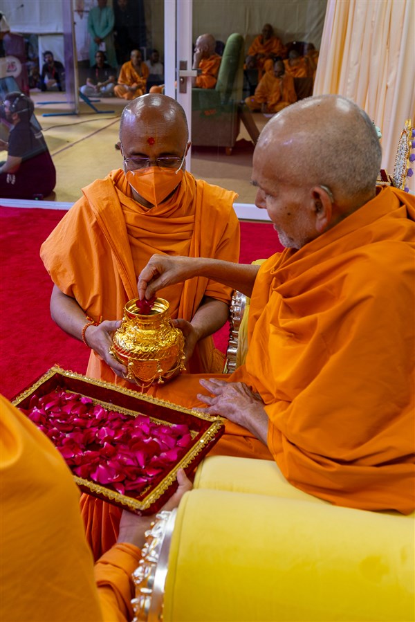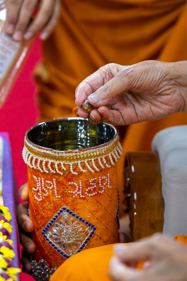 Swamishri sanctifies water with the holy relics of Bhagwan Swaminarayan and the Guru Parampara