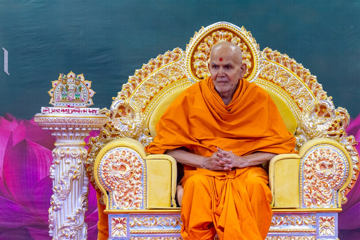 Swamishri engrossed in darshan of Shri Harikrishna Maharaj and Shri Lakshmi-Narayan Bhagwan