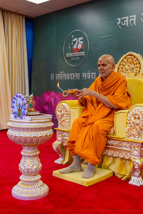 Swamishri offers thal to Shri Akshar-Purushottam Maharaj