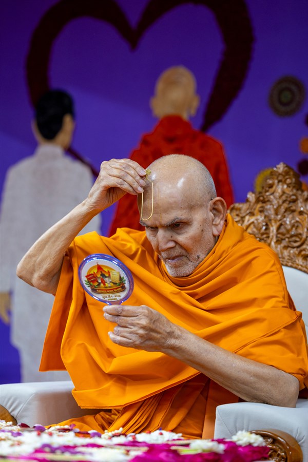 Swamishri applies a tilak on his forehead