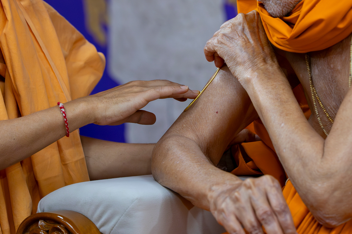 Swamishri applies a tilak on his upper arm
