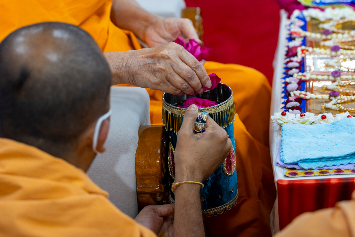 Swamishri adds flowers to the sanctified water