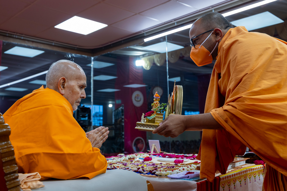 Swamishri offers thal to Shri Guru Parampara