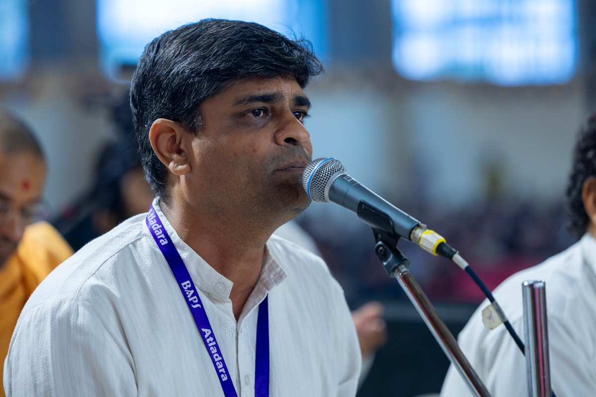 A yuvak sings a kirtan in Swamishri's daily puja