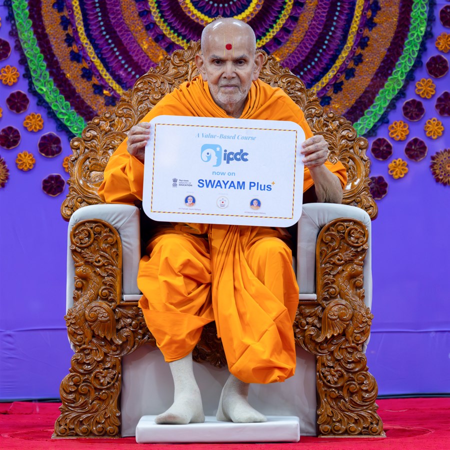 Swamishri displays a card for the value-based course 'IPDC', now available on the Swayam Plus portal of the Government of India