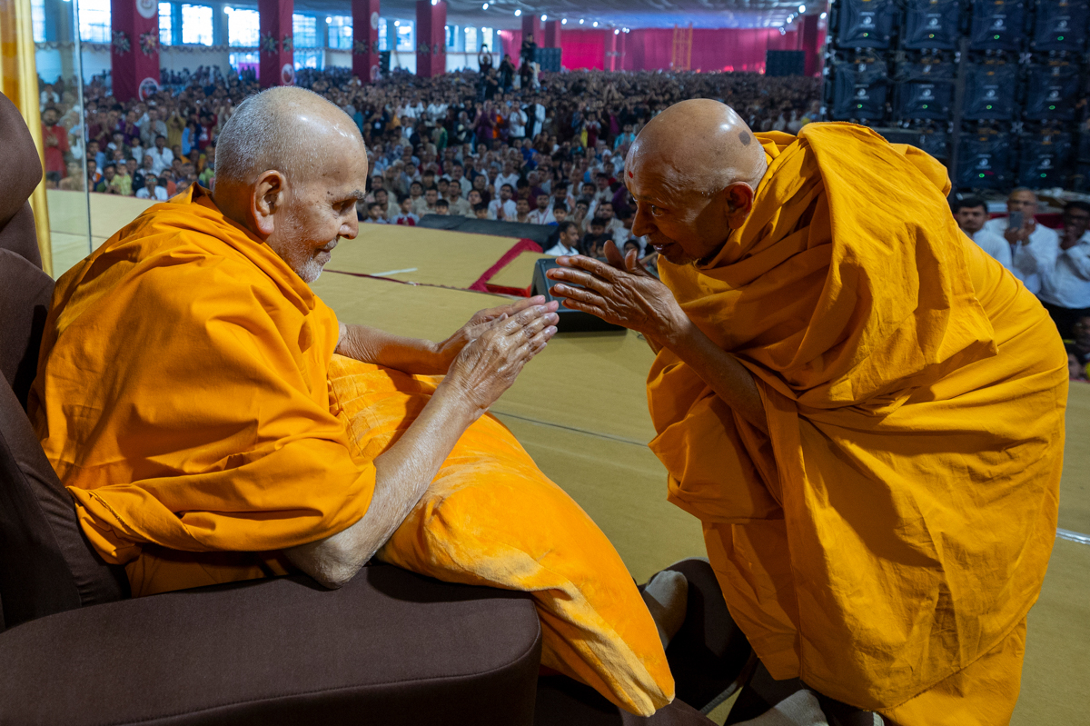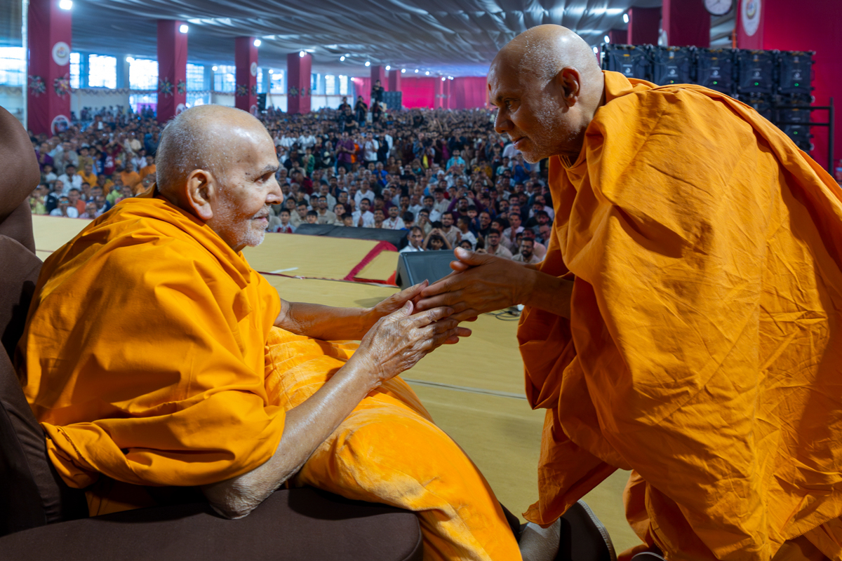 Pujya Tyagvallabh Swami greets Swamishri