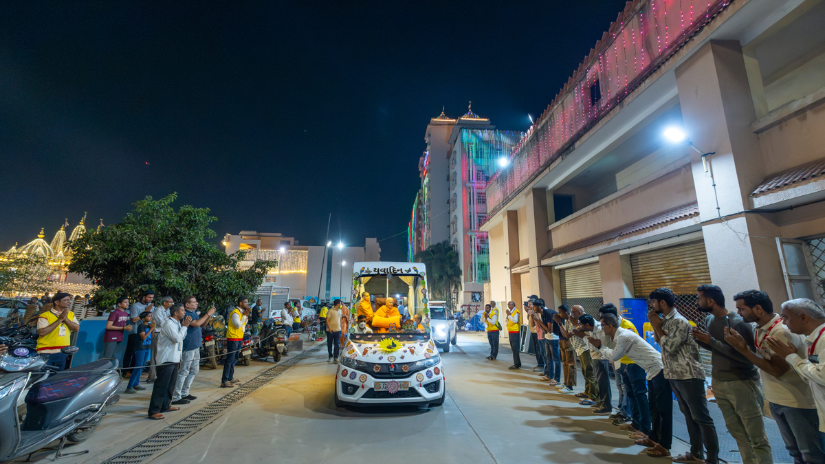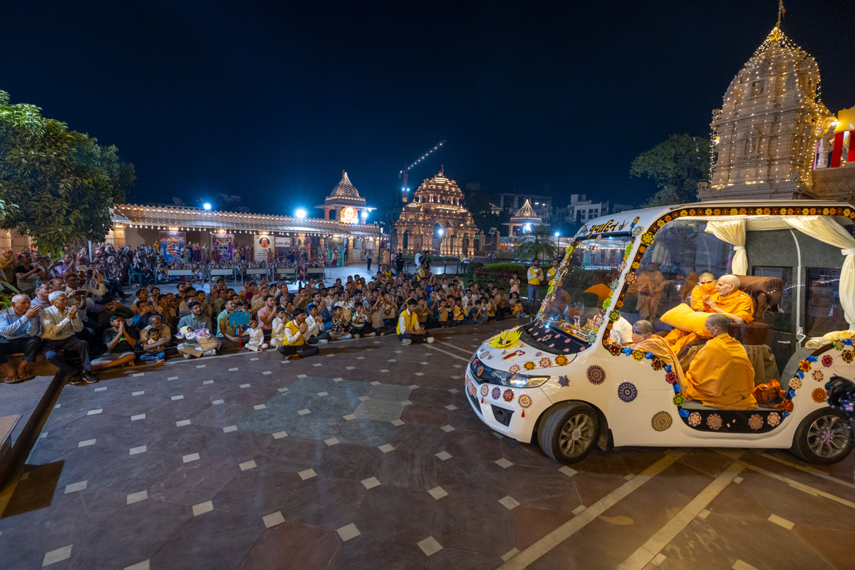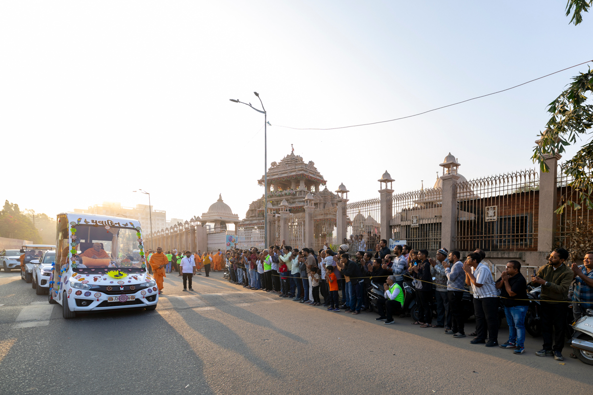 Swamishri returns to BAPS Shri Swaminarayan Mandir, Atladara (Vadodara), after his daily puja