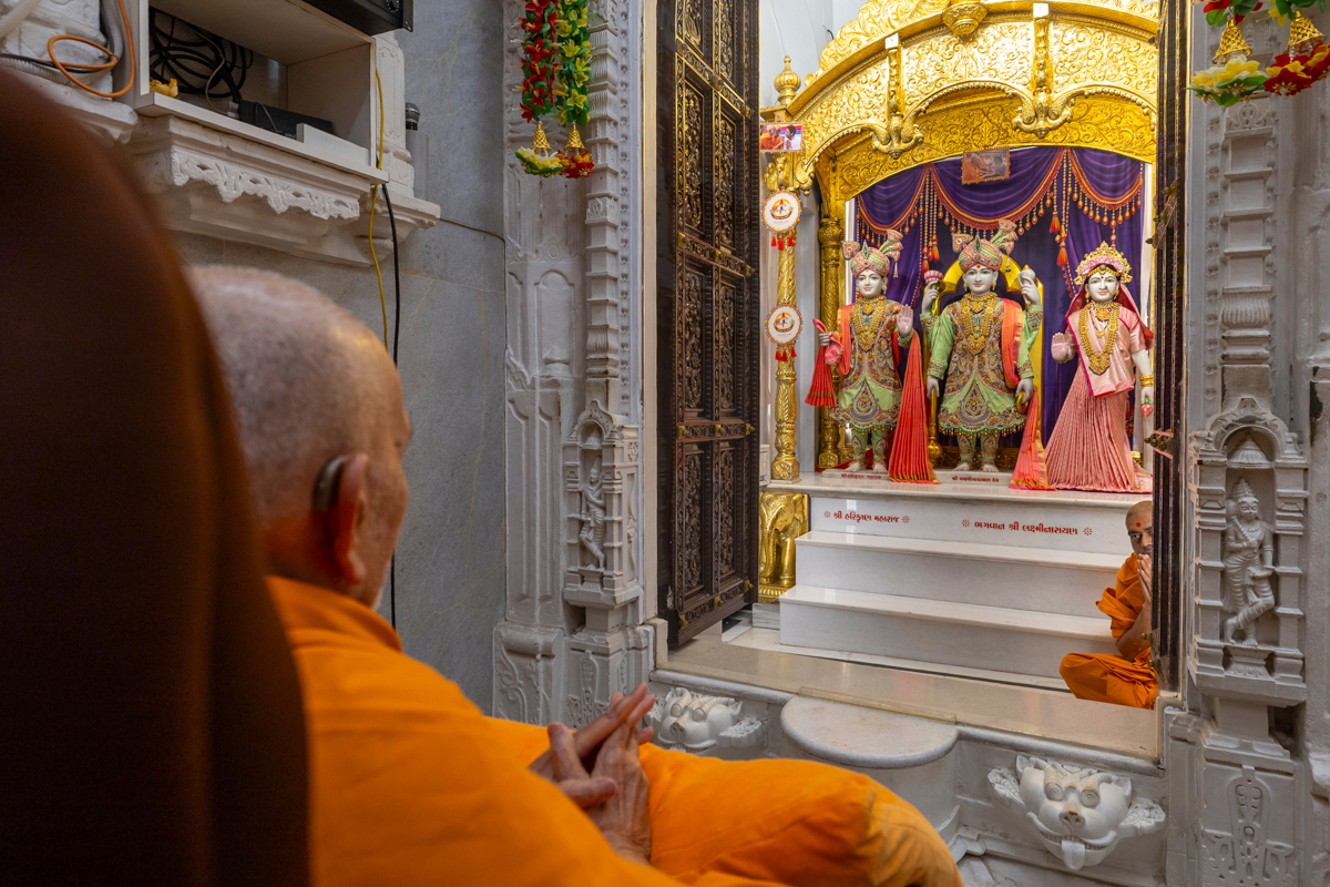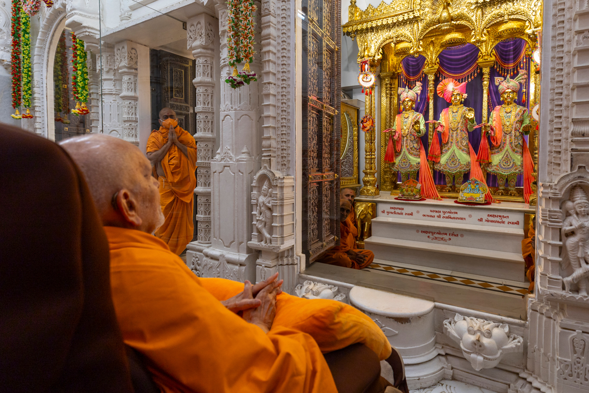 Swamishri engrossed in darshan of Shri Harikrishna Maharaj and Shri Lakshmi-Narayan Bhagwan