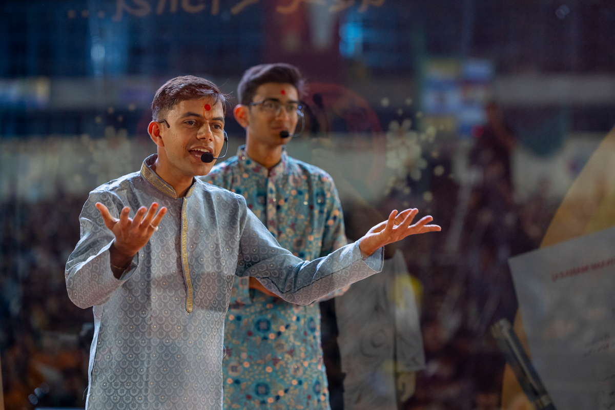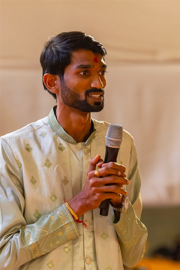 A yuvak sings a kirtan in Swamishri's puja