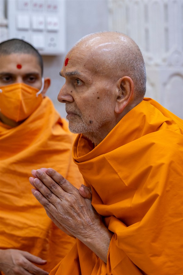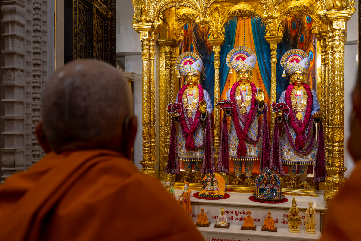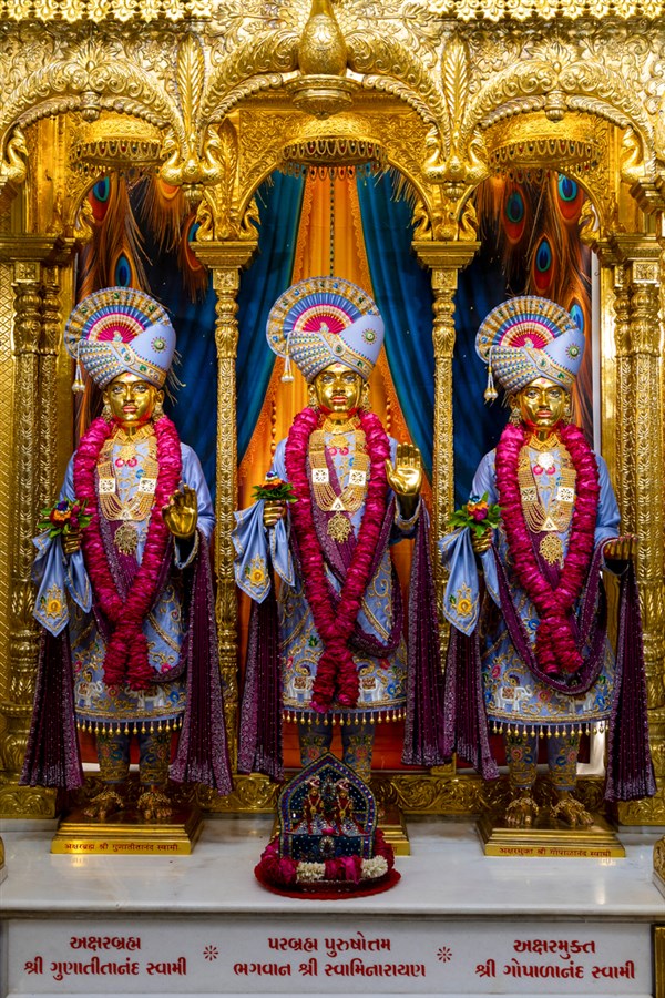 Swamishri engrossed in darshan of Bhagwan Swaminarayan, Aksharbrahma Gunatitanand Swami and Shri Gopalanand Swami
