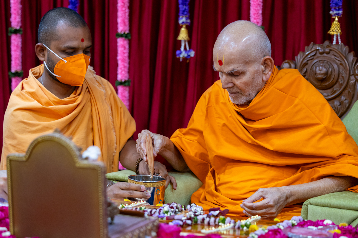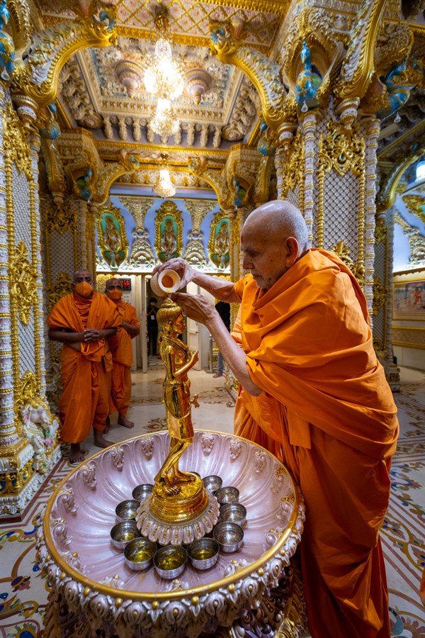 Swamishri sanctifies water with the holy relics of Bhagwan Swaminarayan and the Guru Parampara