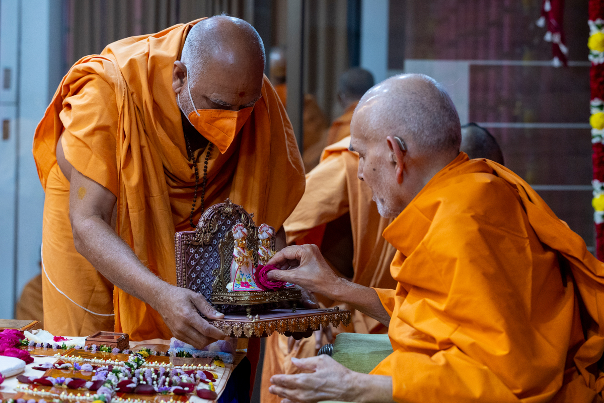 Swamishri places a flower at the feet of Shri Harikrishna Maharaj and Shri Gunatitanand Swami Maharaj