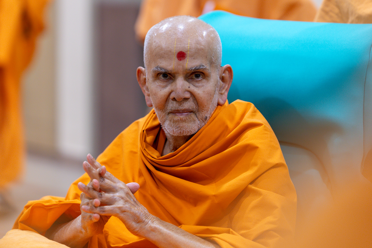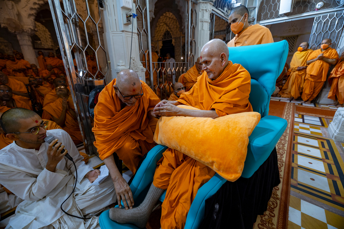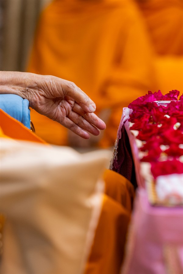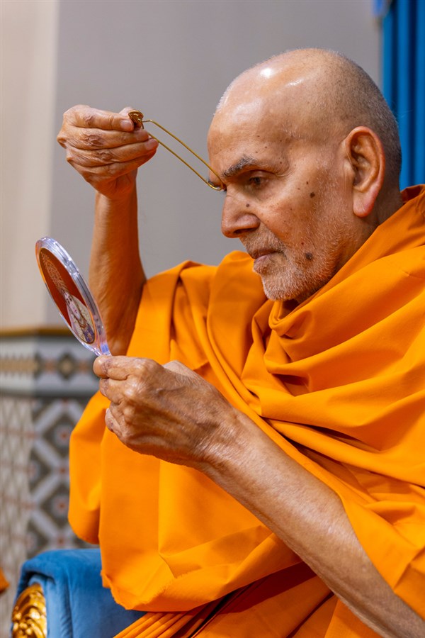 Swamishri engaged in the darshan of Brahmaswarup Pramukh Swami Maharaj