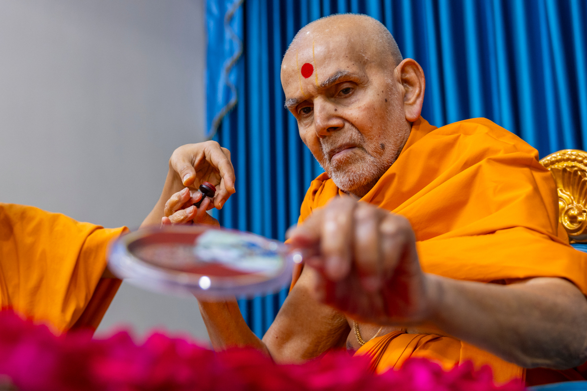 Swamishri reverently touches a stone sanctified by Aksharbrahma Gunatitanand Swami