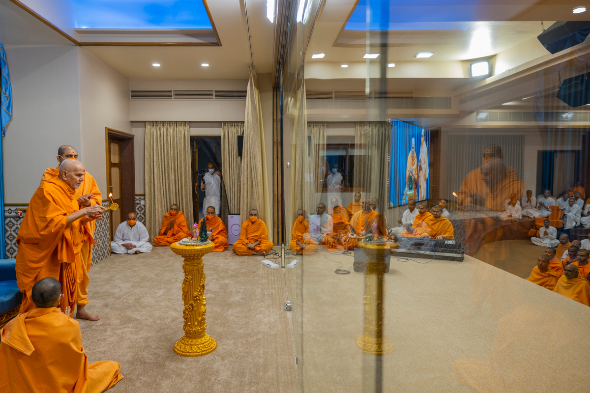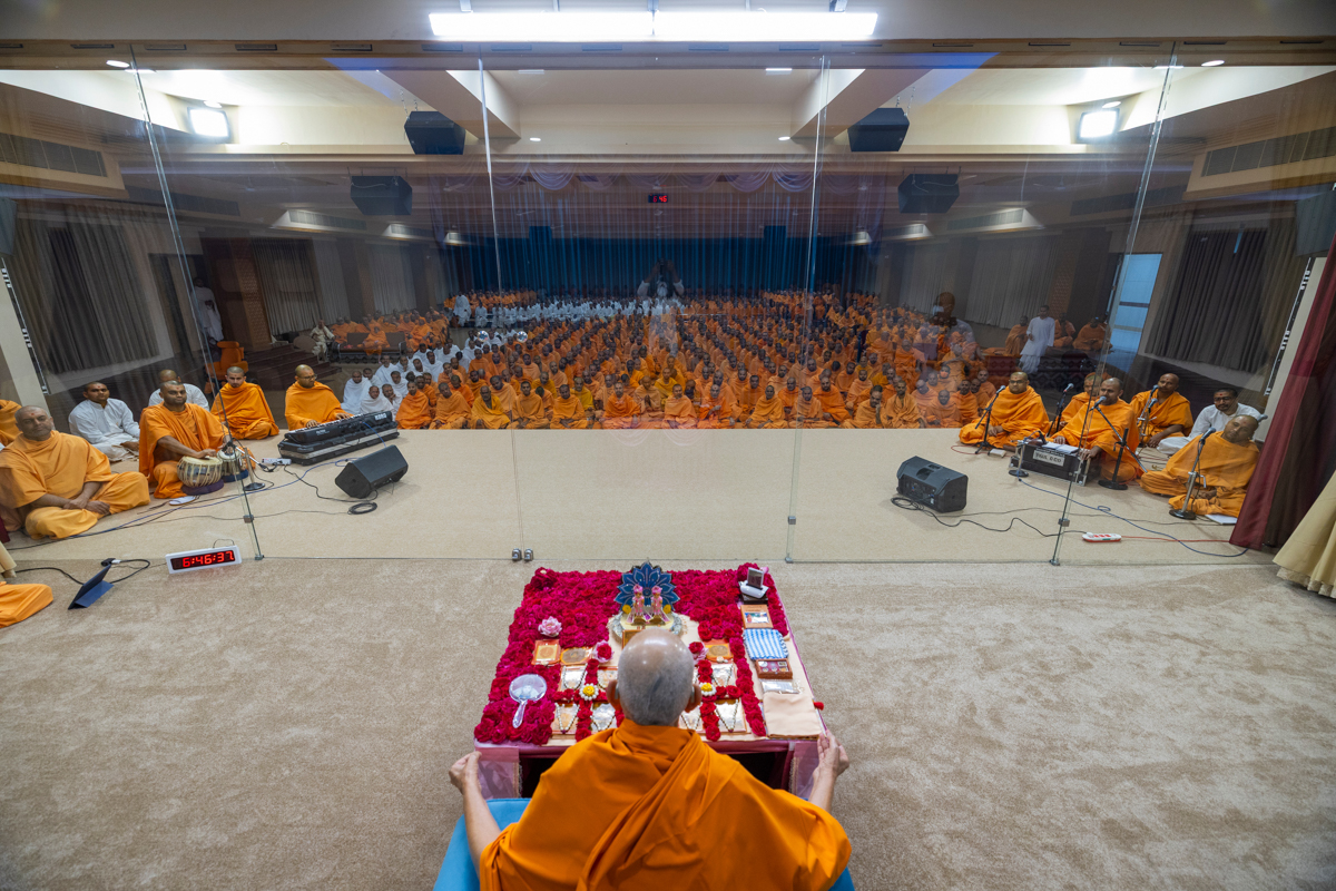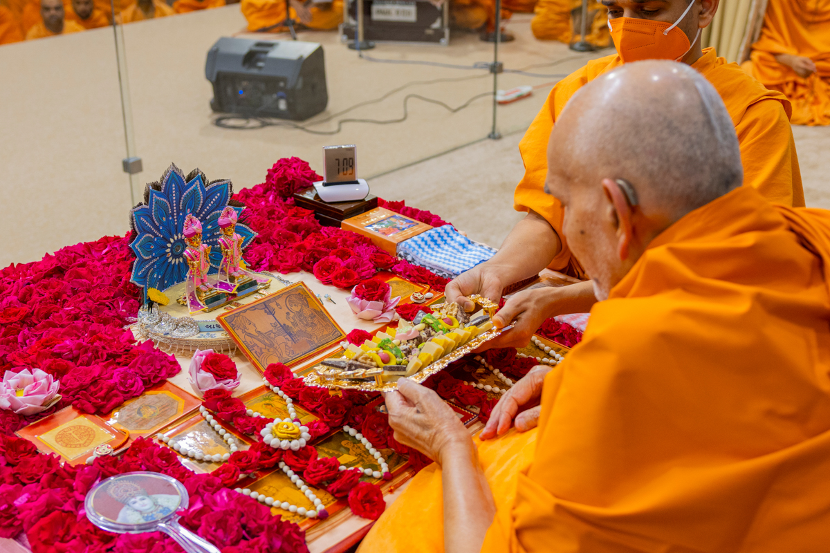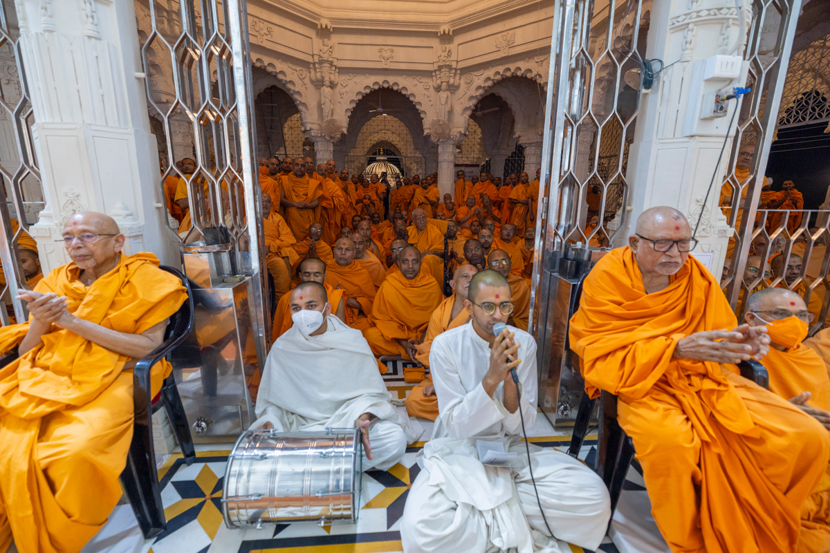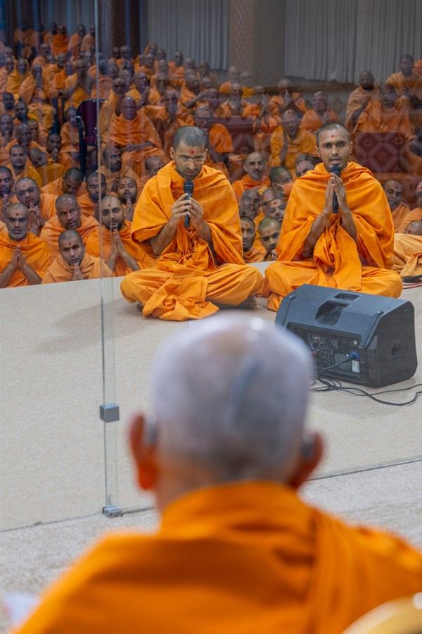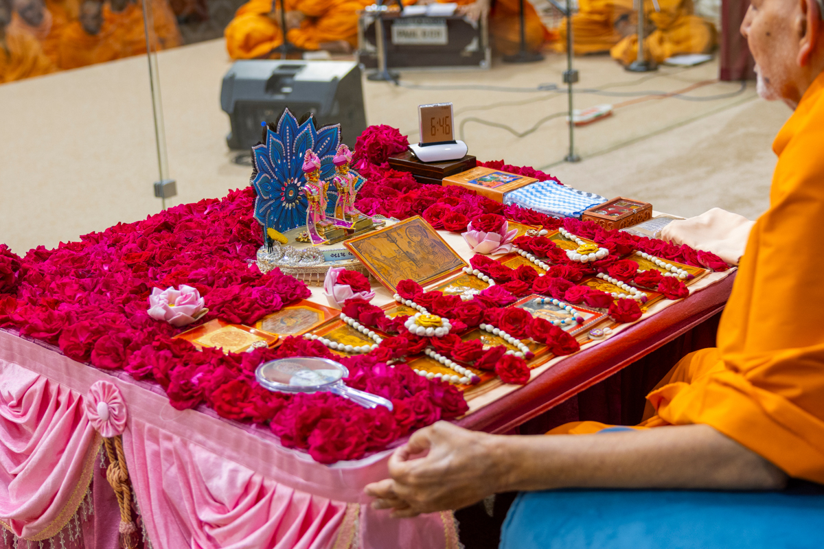 Swamis lead everyone in reciting the sadhana mantra and daily prayer in Swamishri's puja