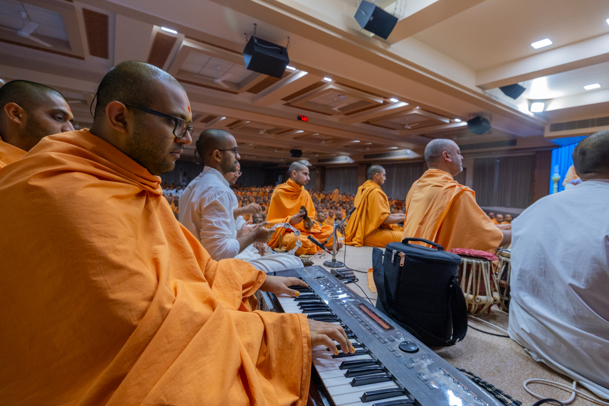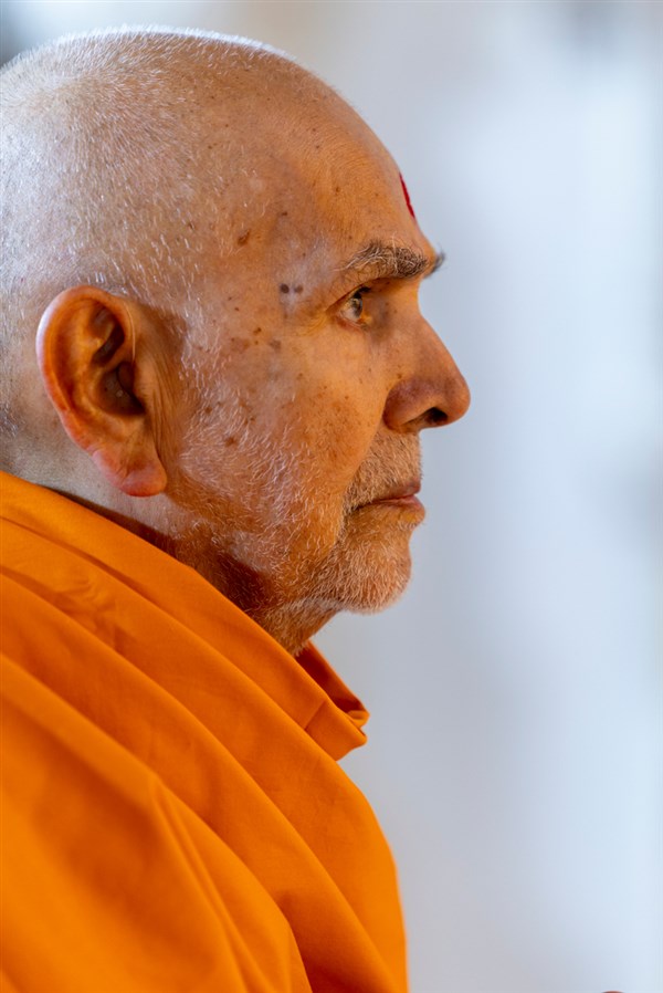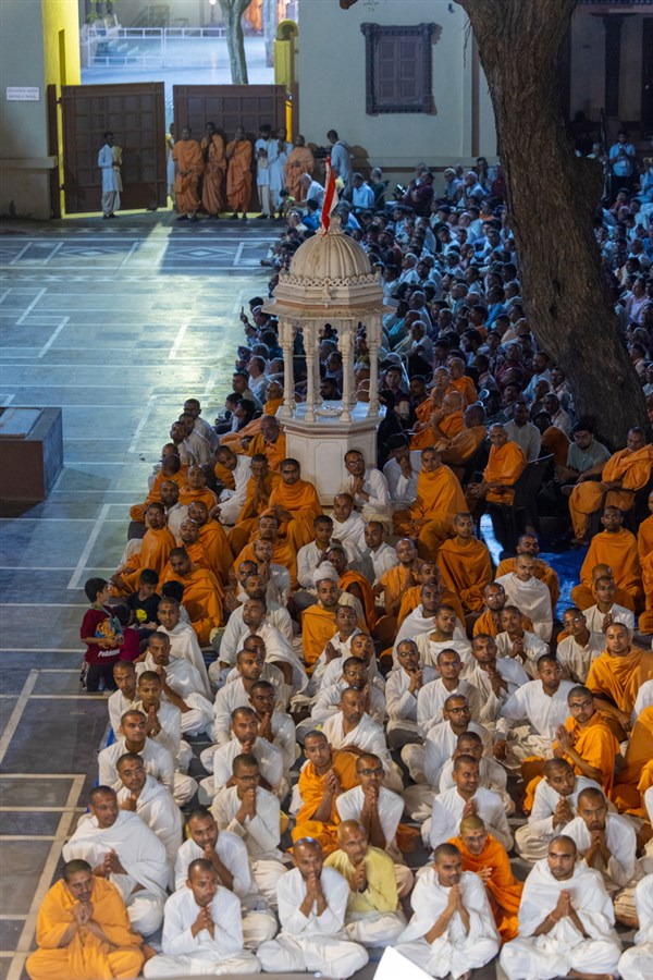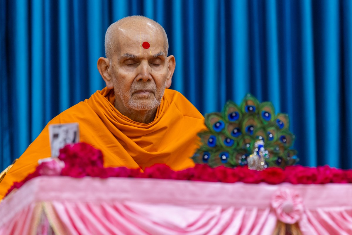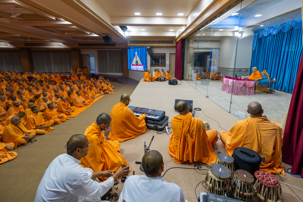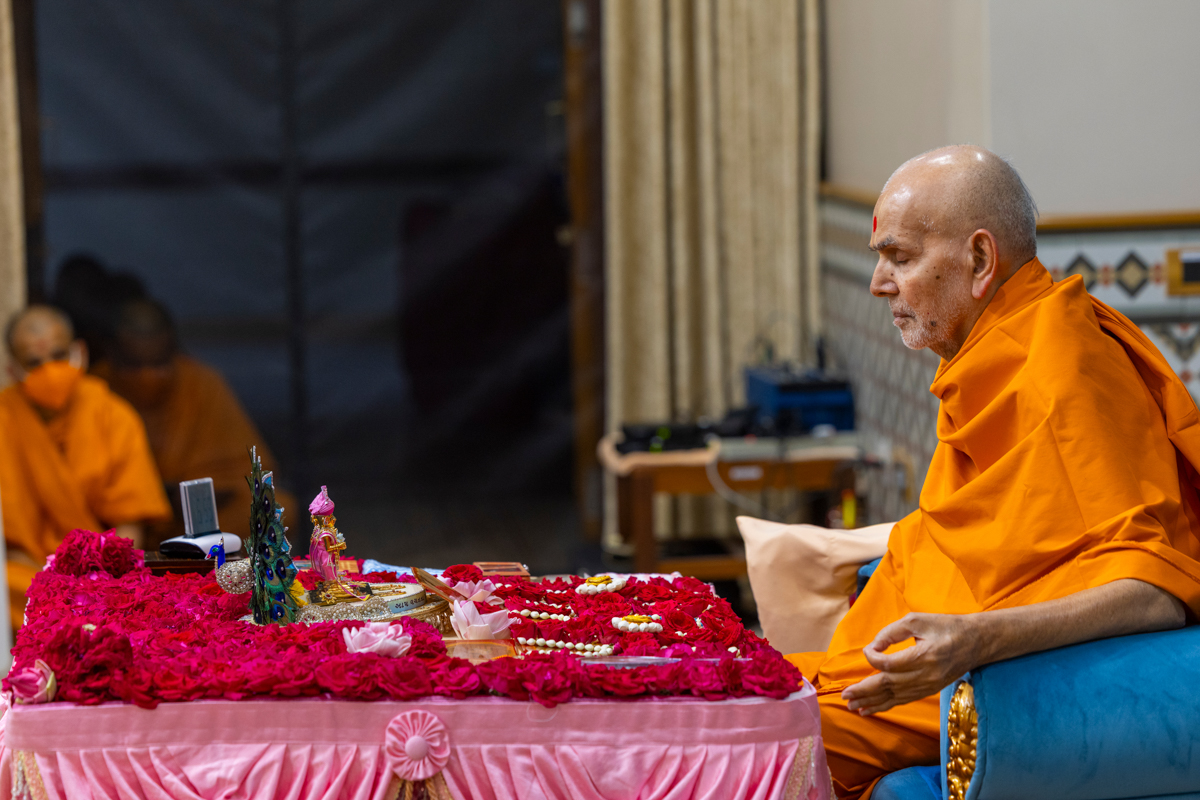 Swamis lead everyone in reciting the sadhana mantra and daily prayer in Swamishri's puja