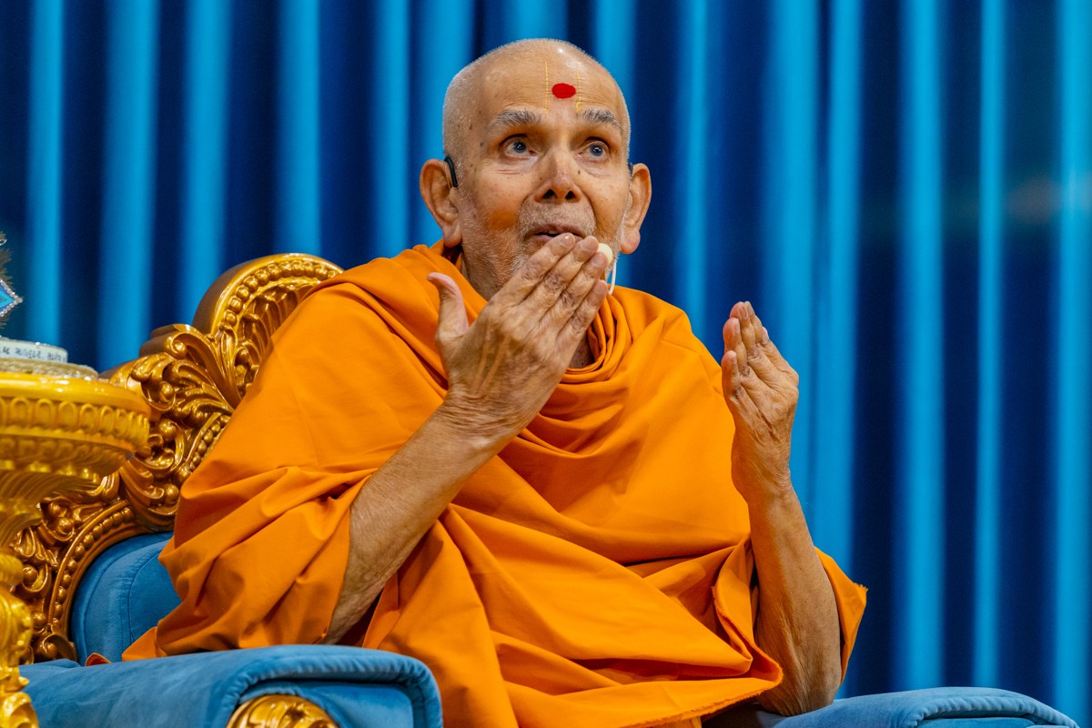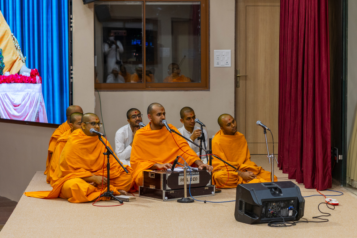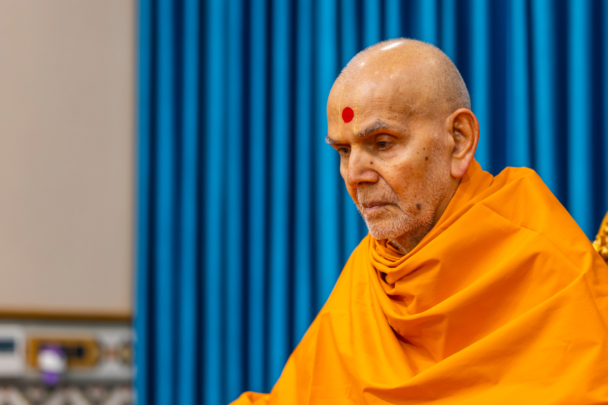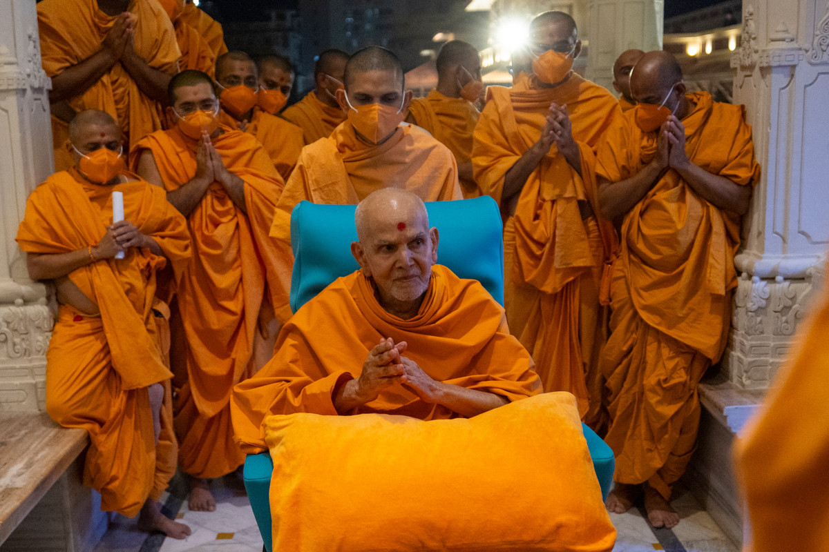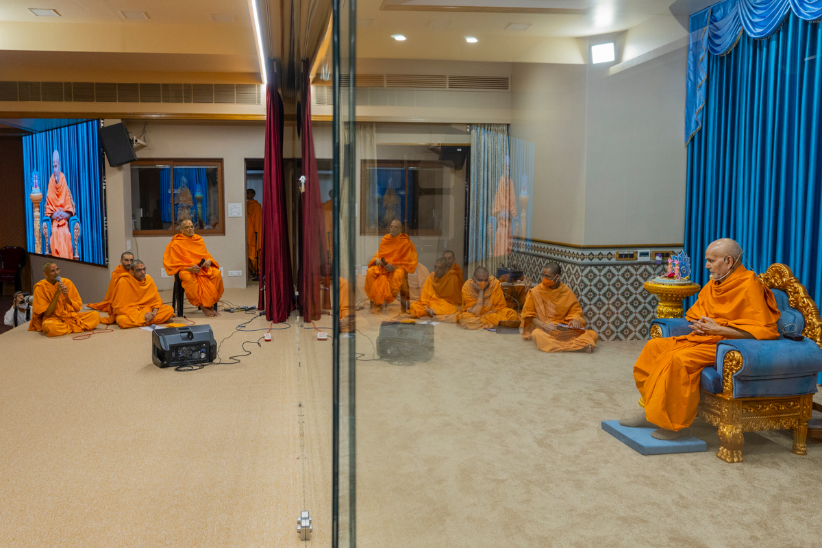 Swamis lead everyone in reciting the sadhana mantra and daily prayer in Swamishri's puja