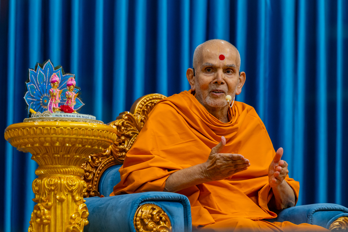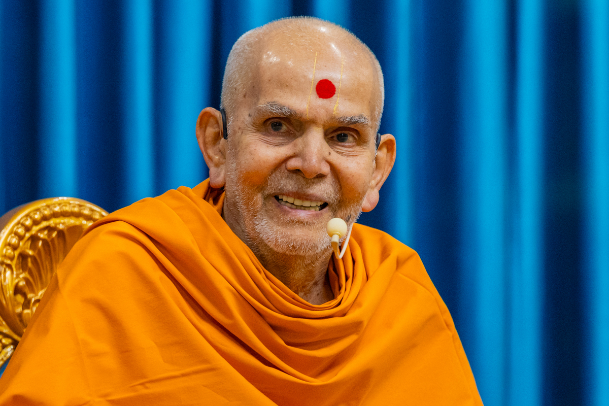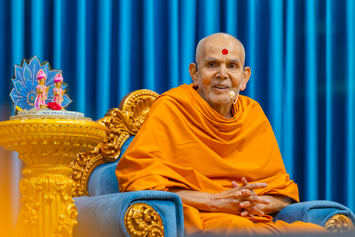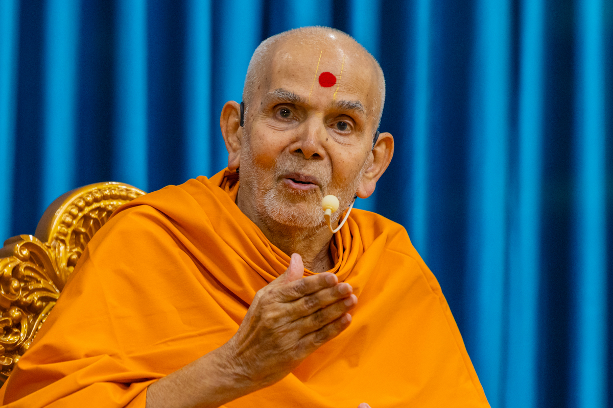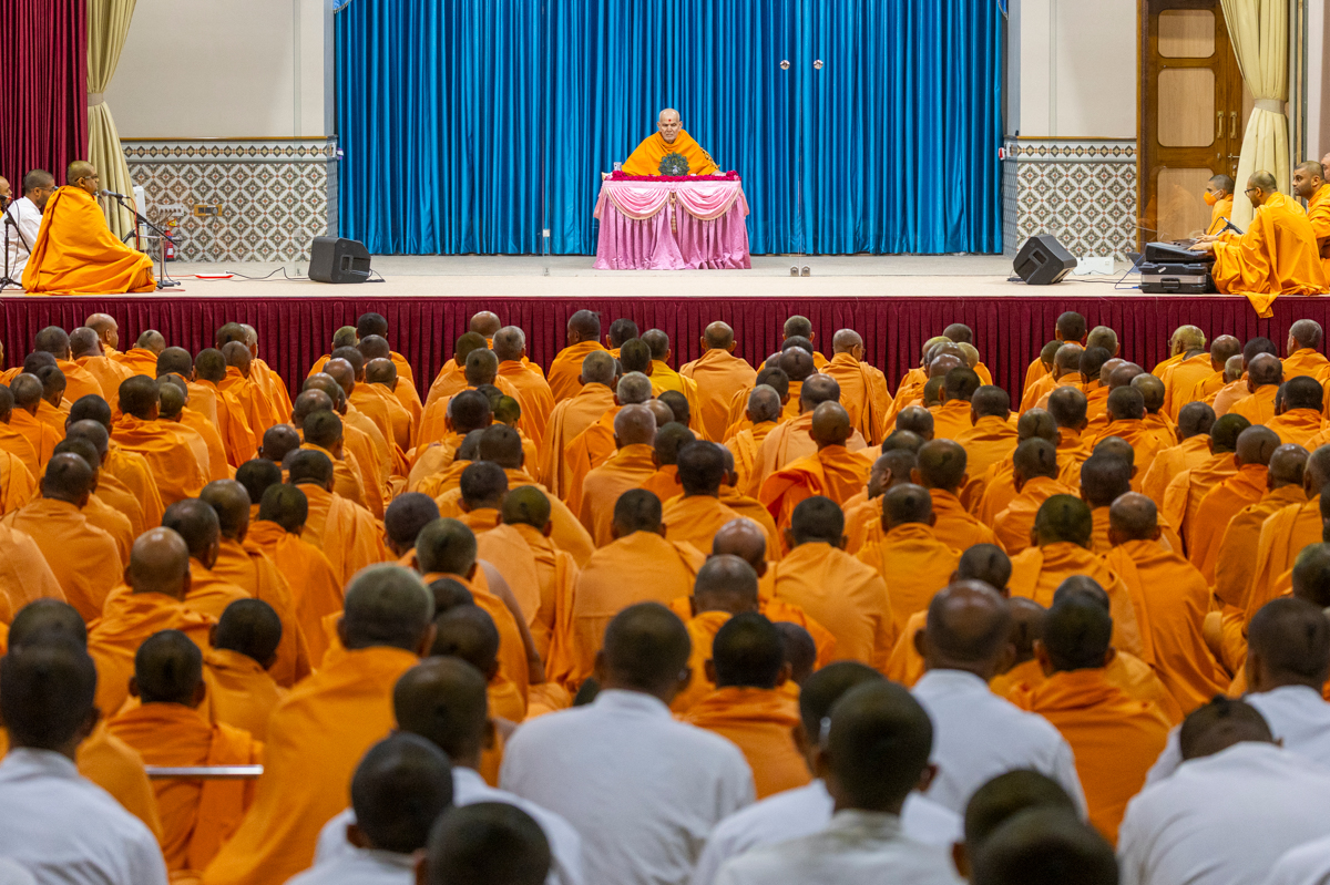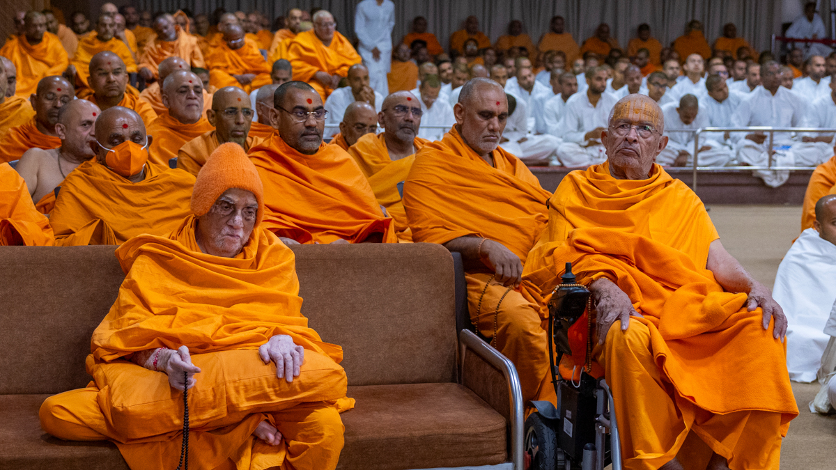 Swamis lead everyone in reciting the sadhana mantra and daily prayer in Swamishri's puja