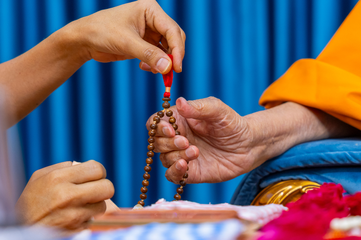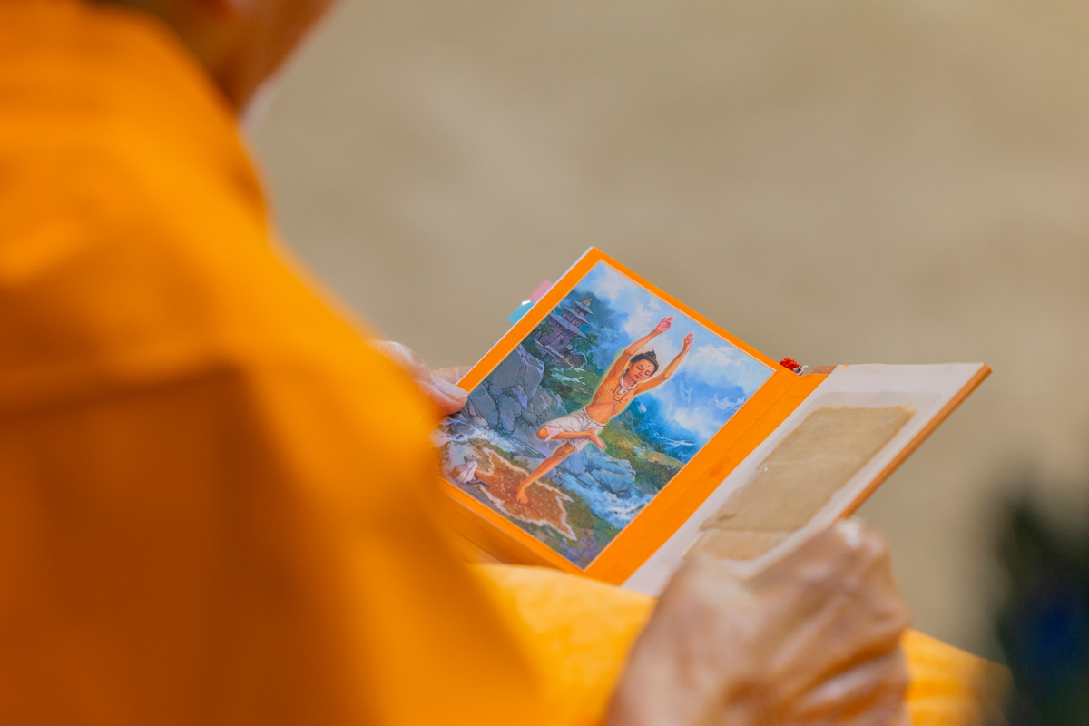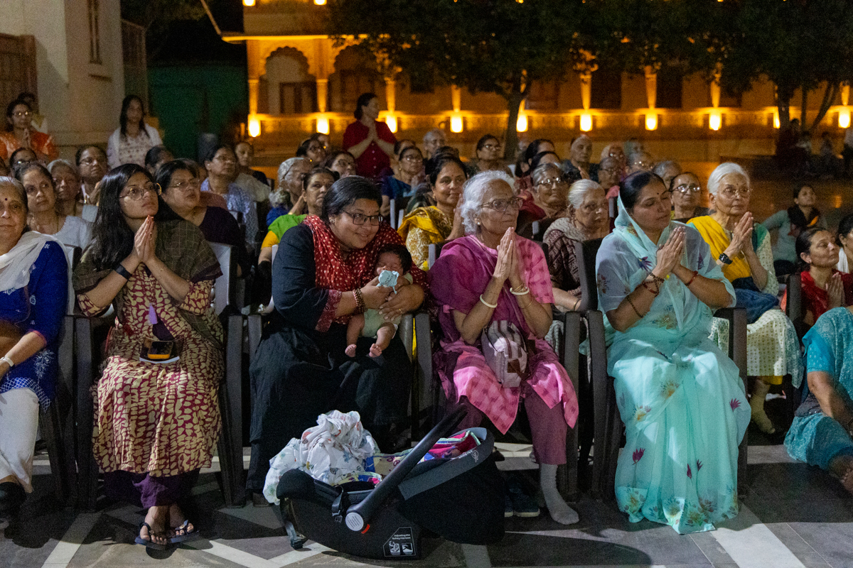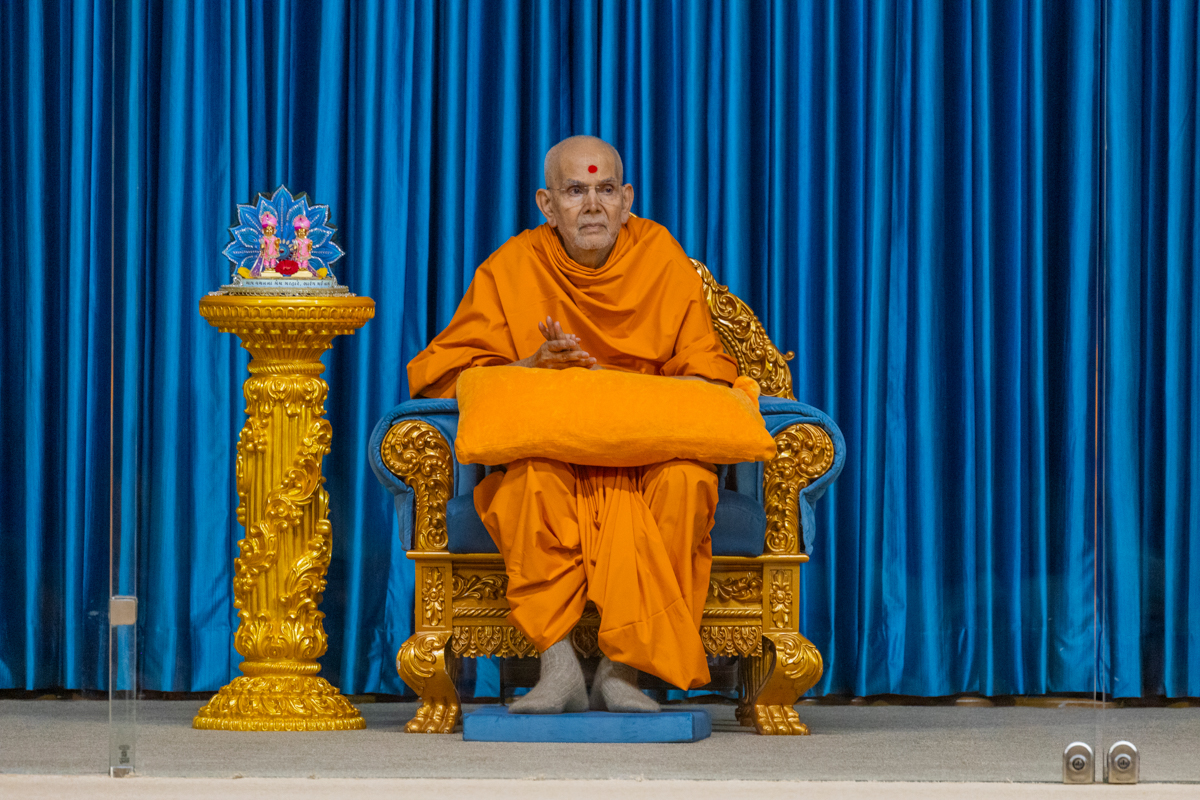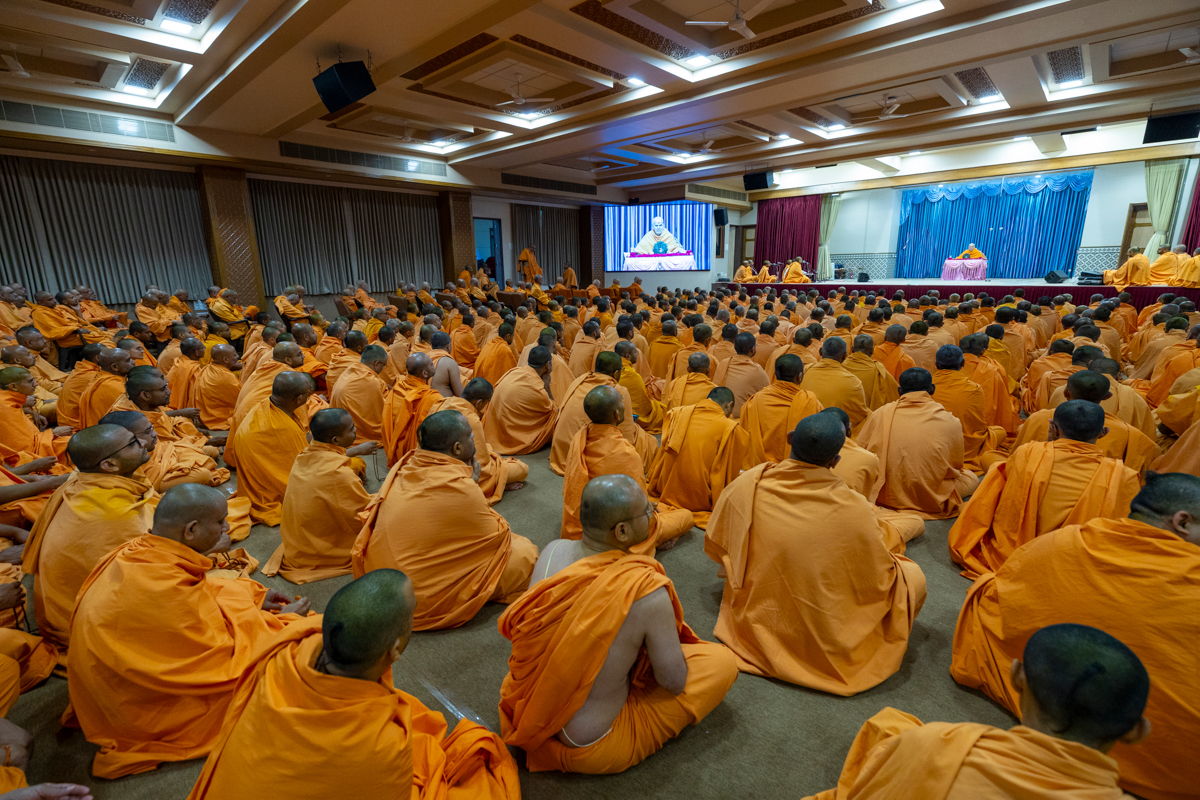 Swamis lead everyone in reciting the sadhana mantra and daily prayer in Swamishri's puja
