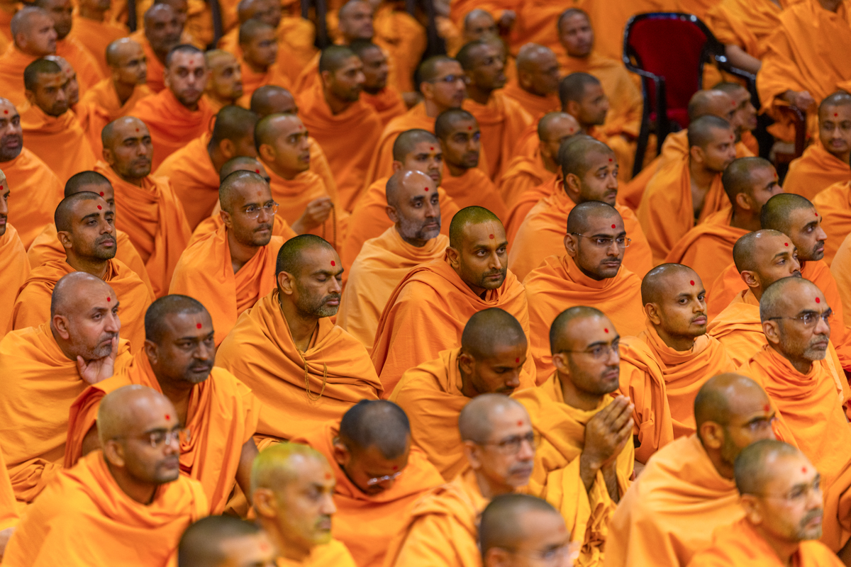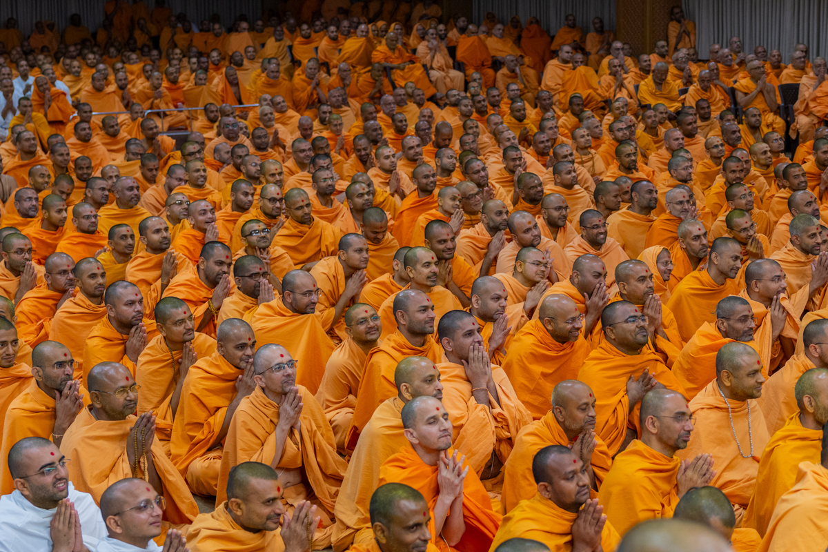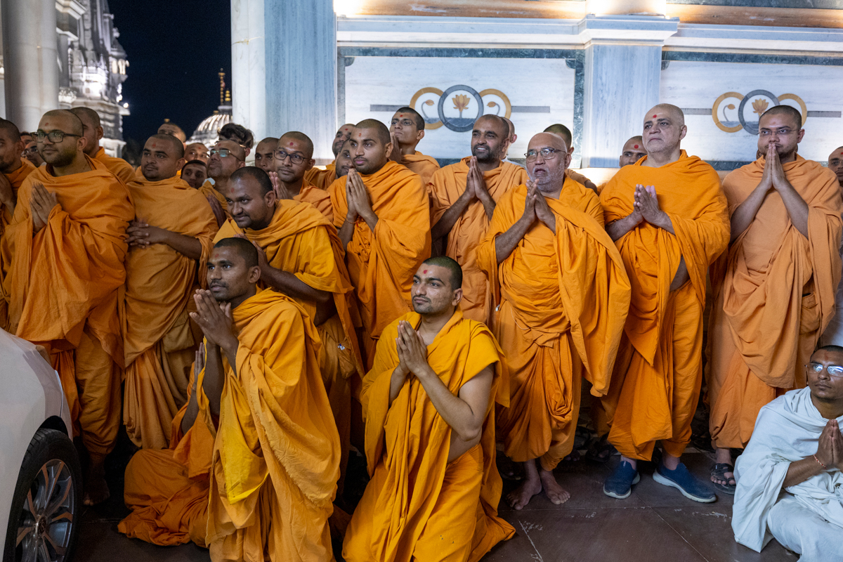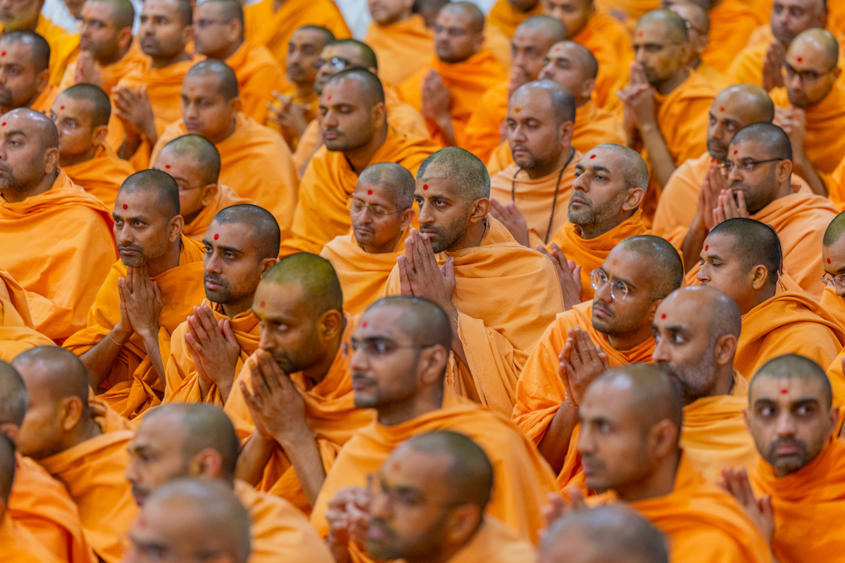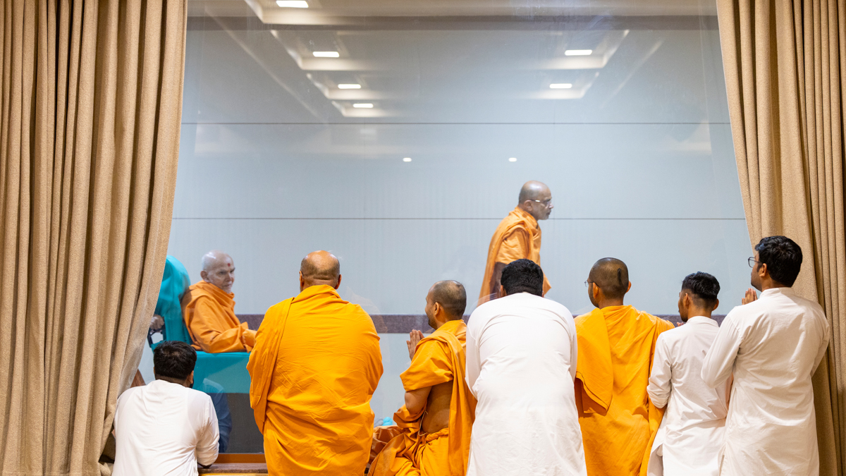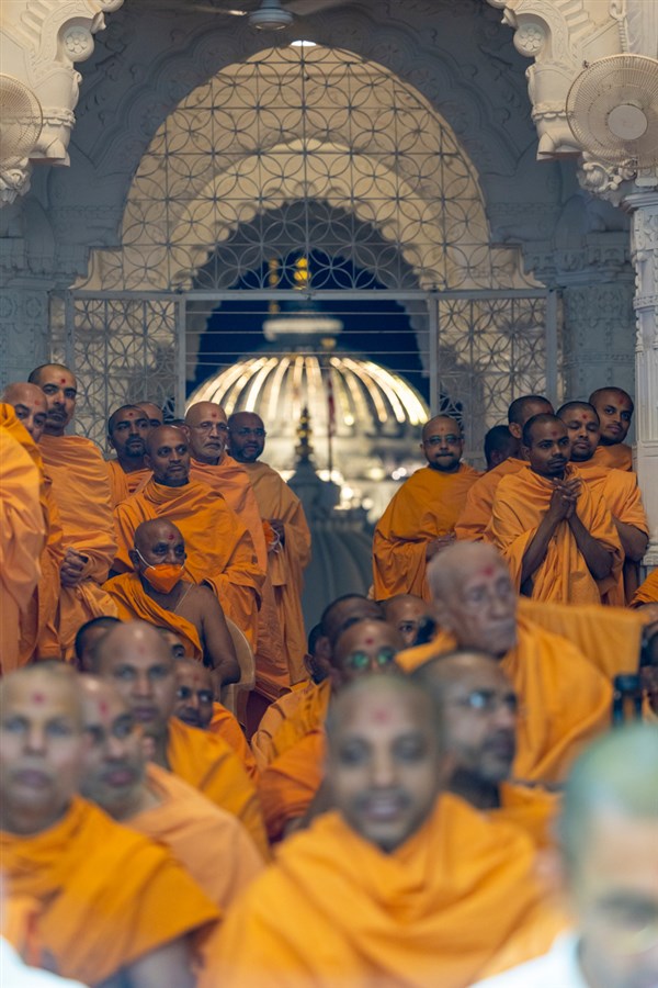 Swamis, parshads, sadhaks and devotees doing darshan of Swamishri