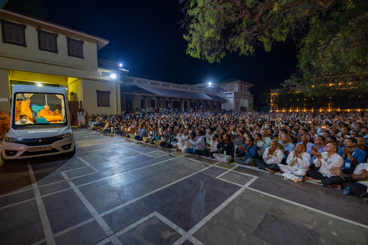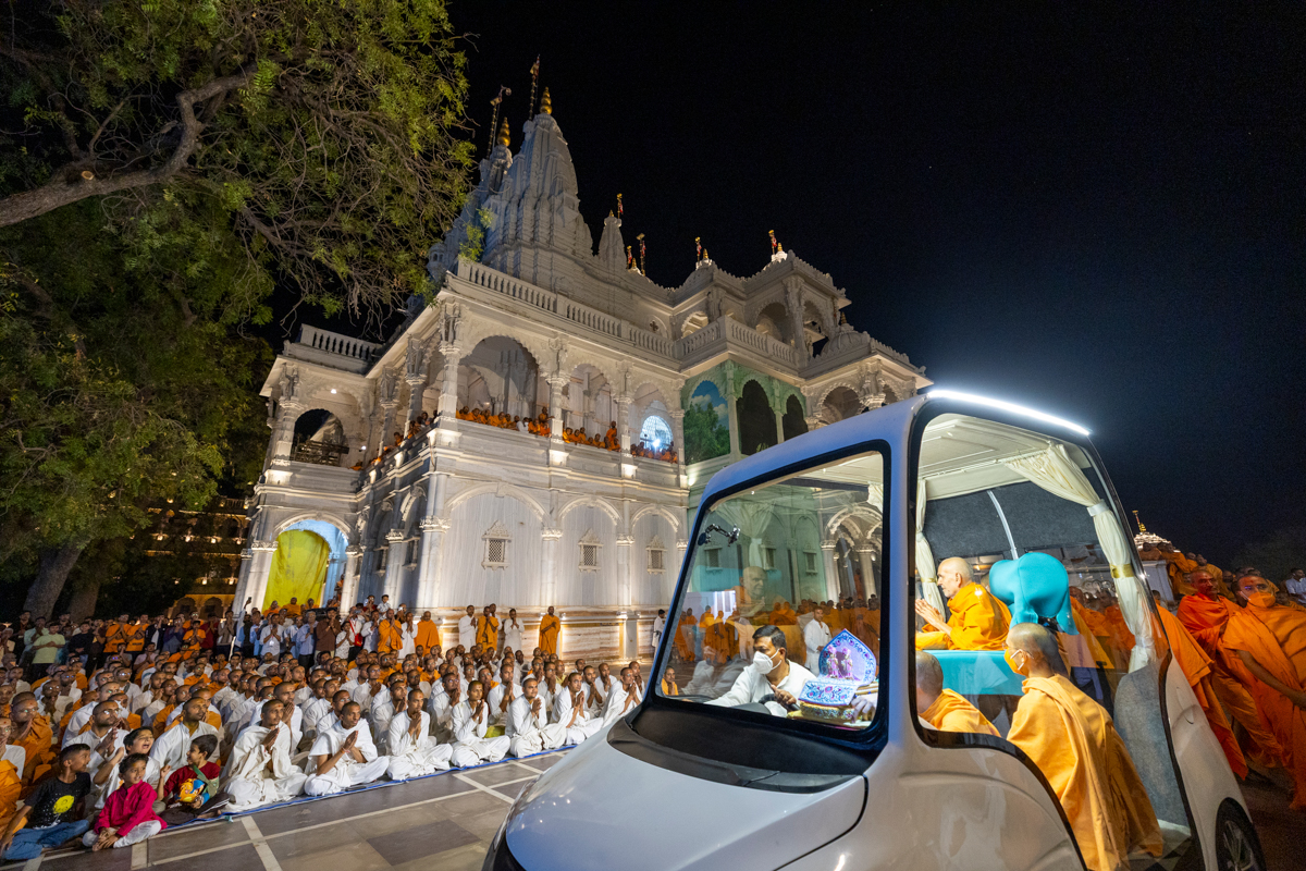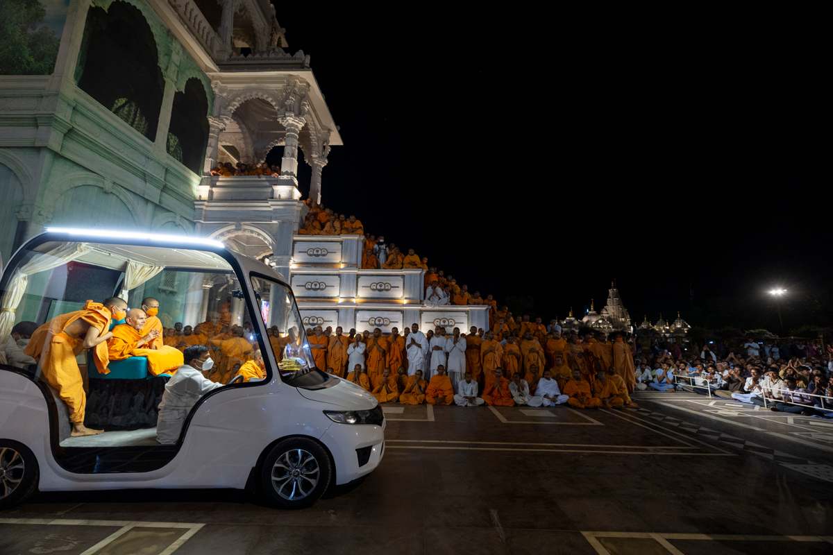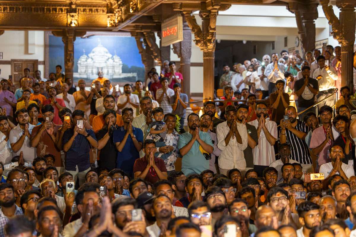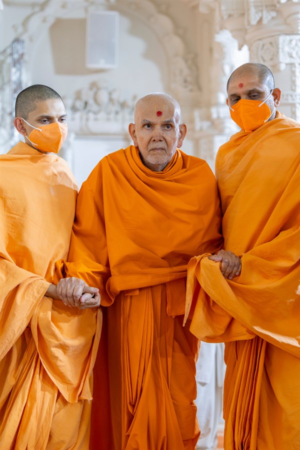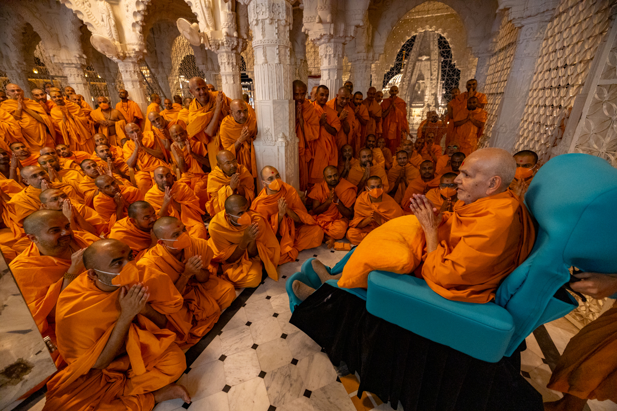 Swamis, parshads, sadhaks and devotees doing darshan of Swamishri