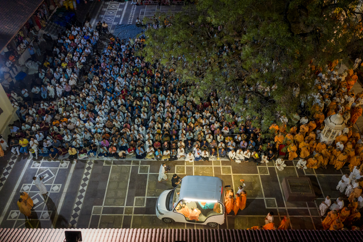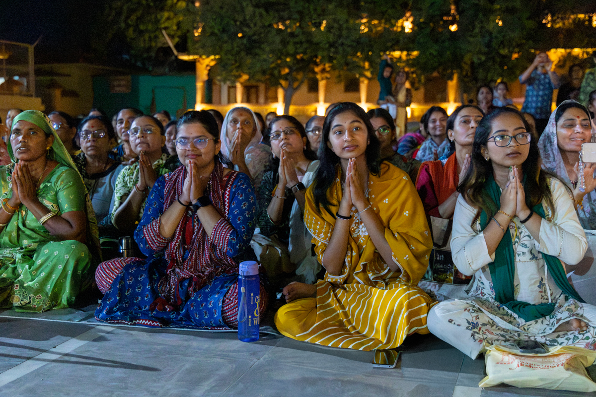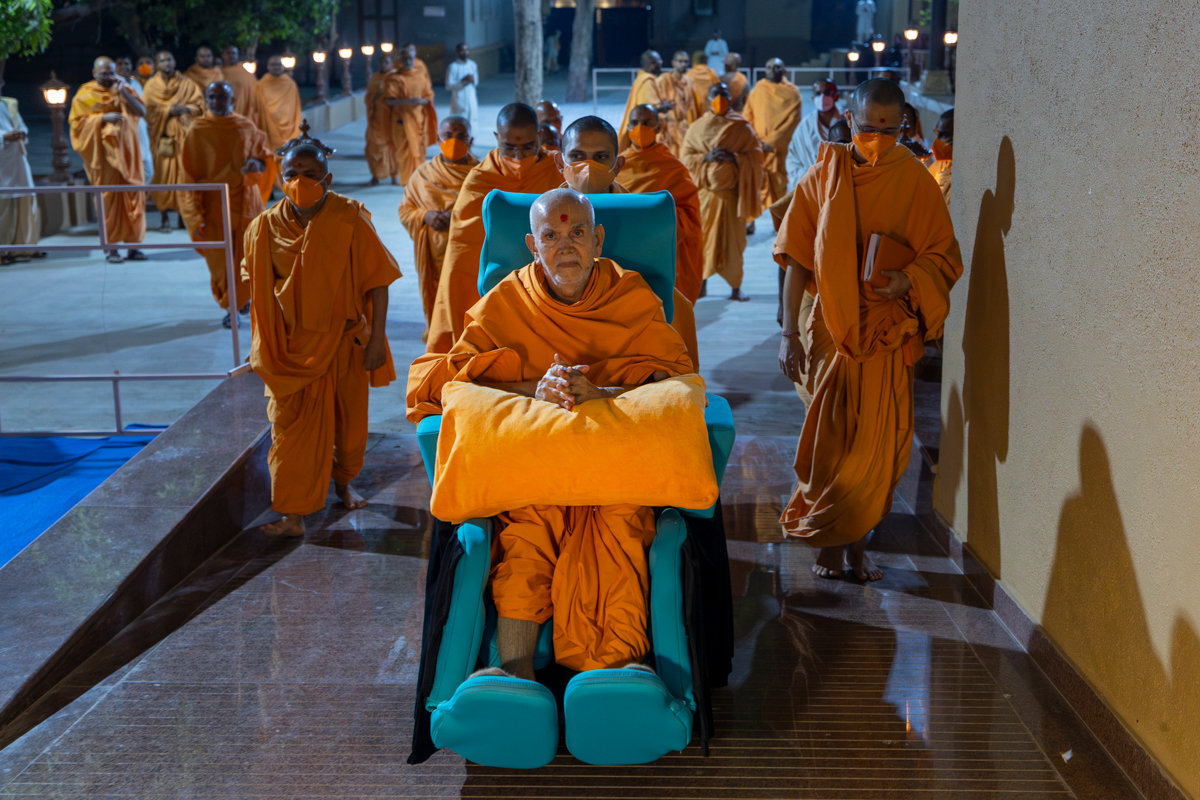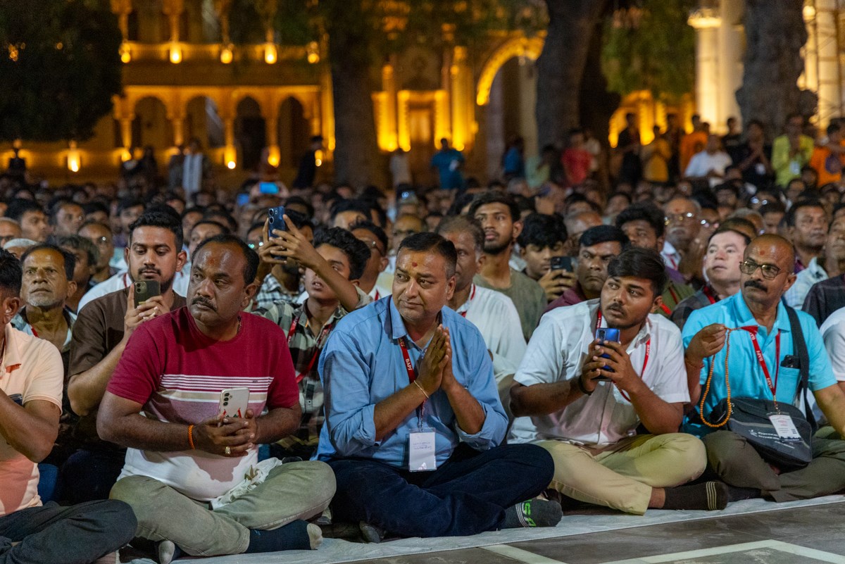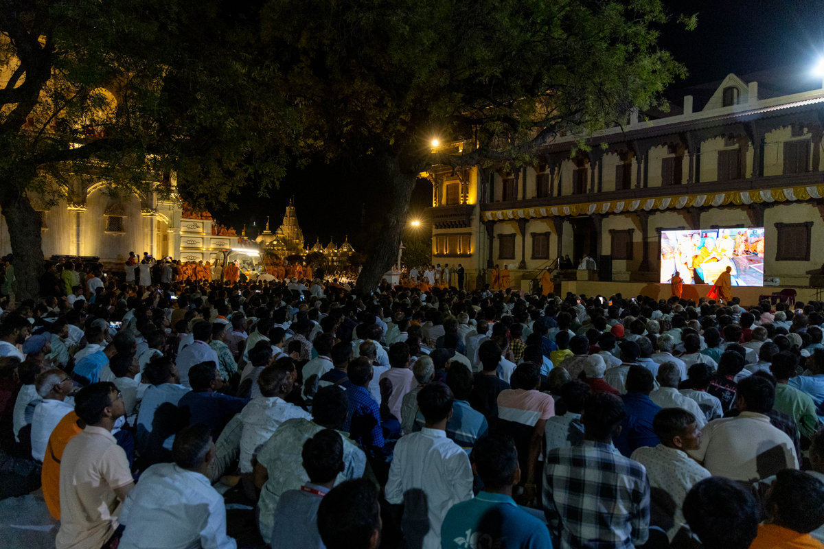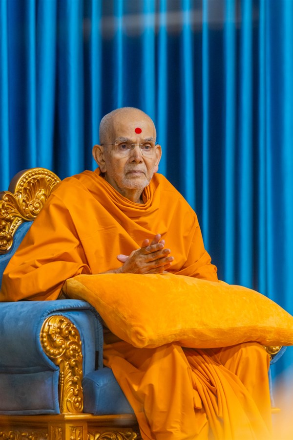 Swamis, parshads, sadhaks and devotees doing darshan of Swamishri