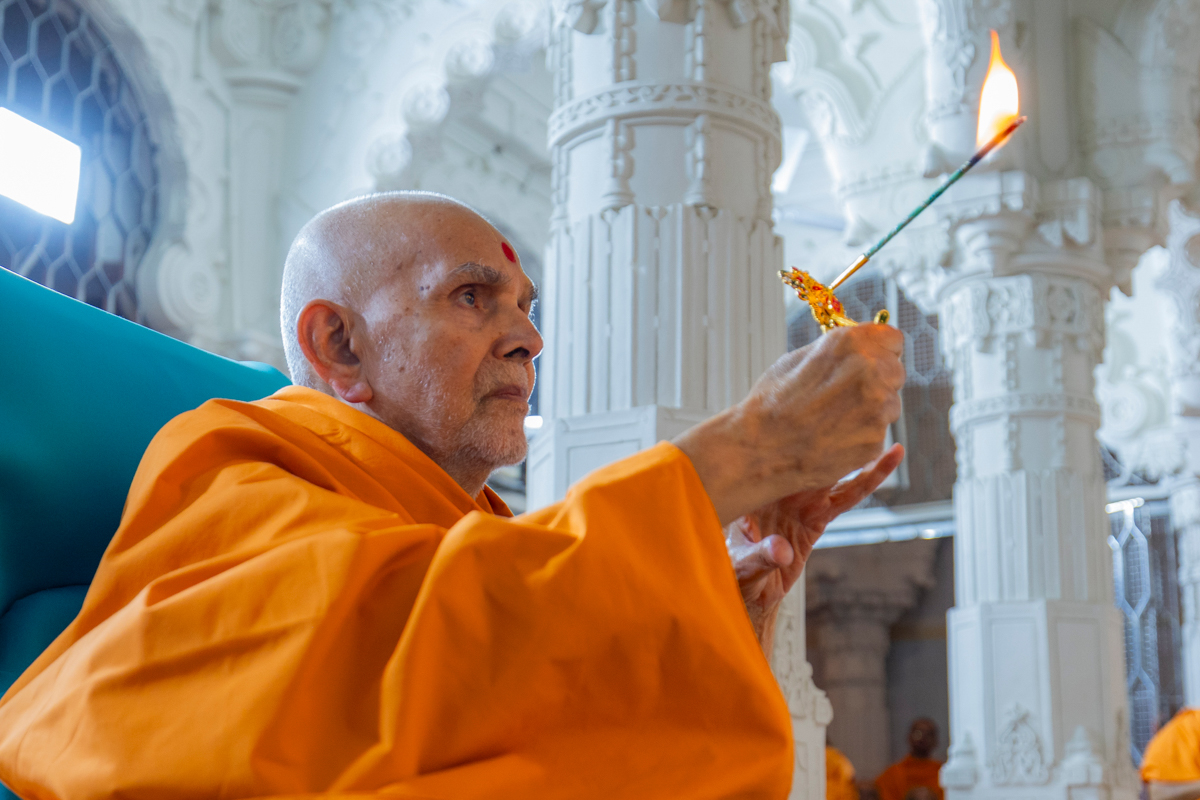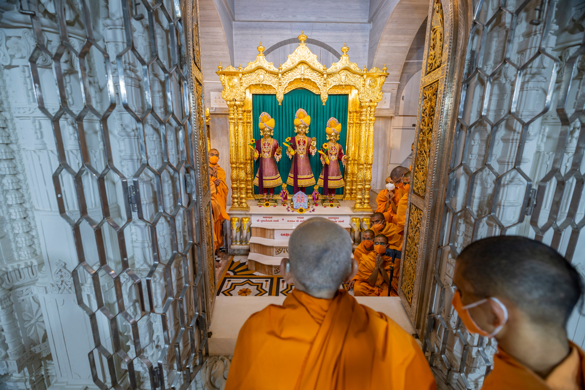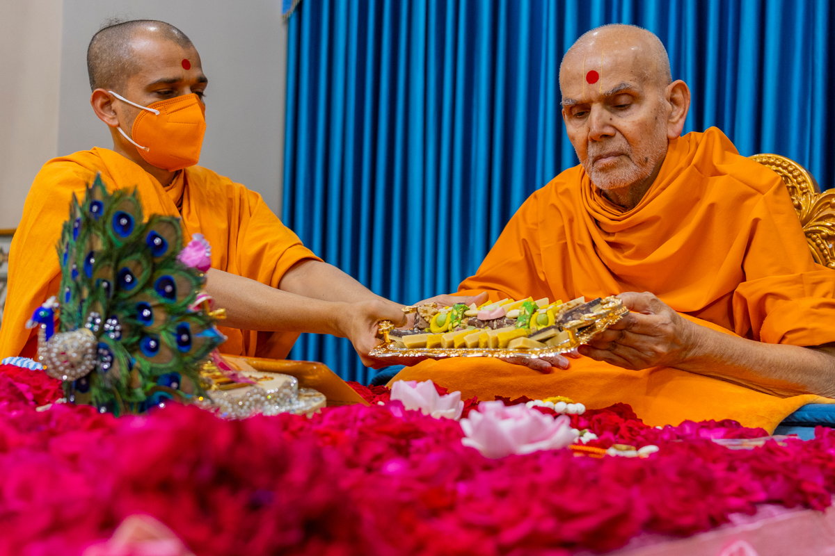 Swamishri offers thal to Shri Akshar-Purushottam Maharaj