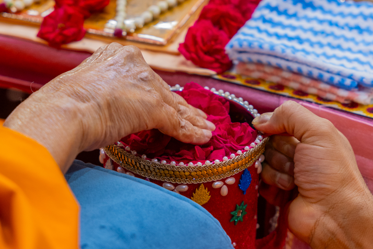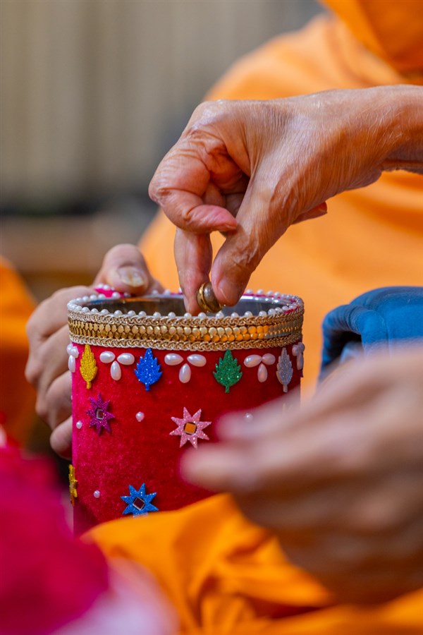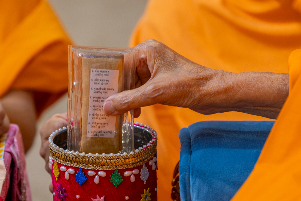 Swamishri sanctifies water with the holy relics of Bhagwan Swaminarayan and the Guru Parampara