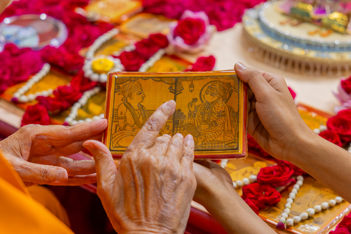 Swamis, parshads, sadhaks doing Swamishri's puja darshan