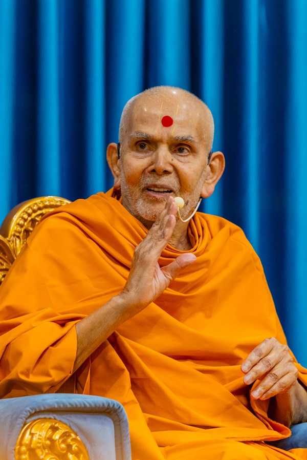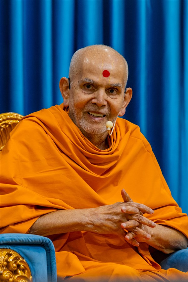 Atmatrupt Swami poses questions to Swamishri during an interactive session