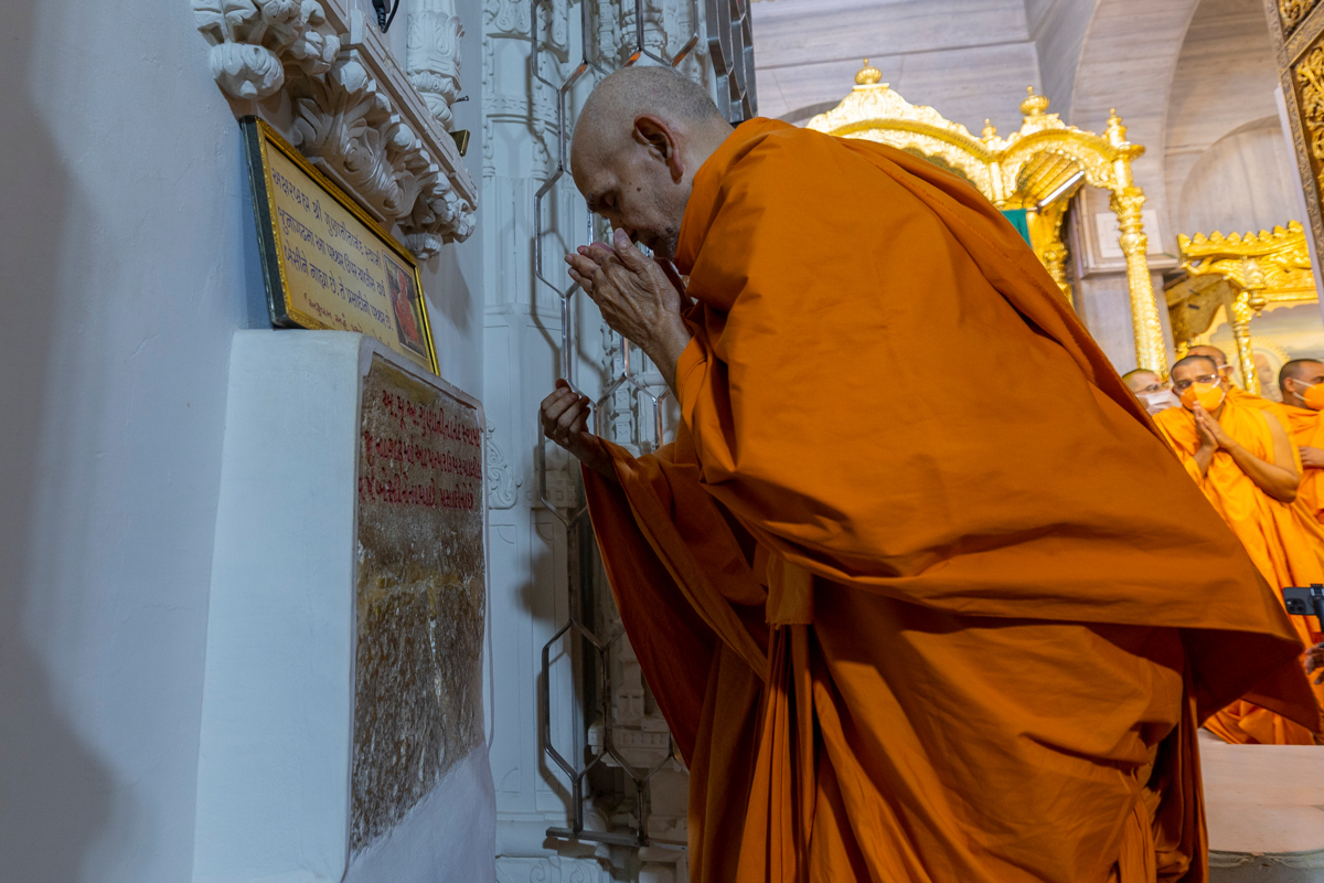 Swamishri reverently touches the holy charanarvind of Shri Akshar-Purushottam Maharaj