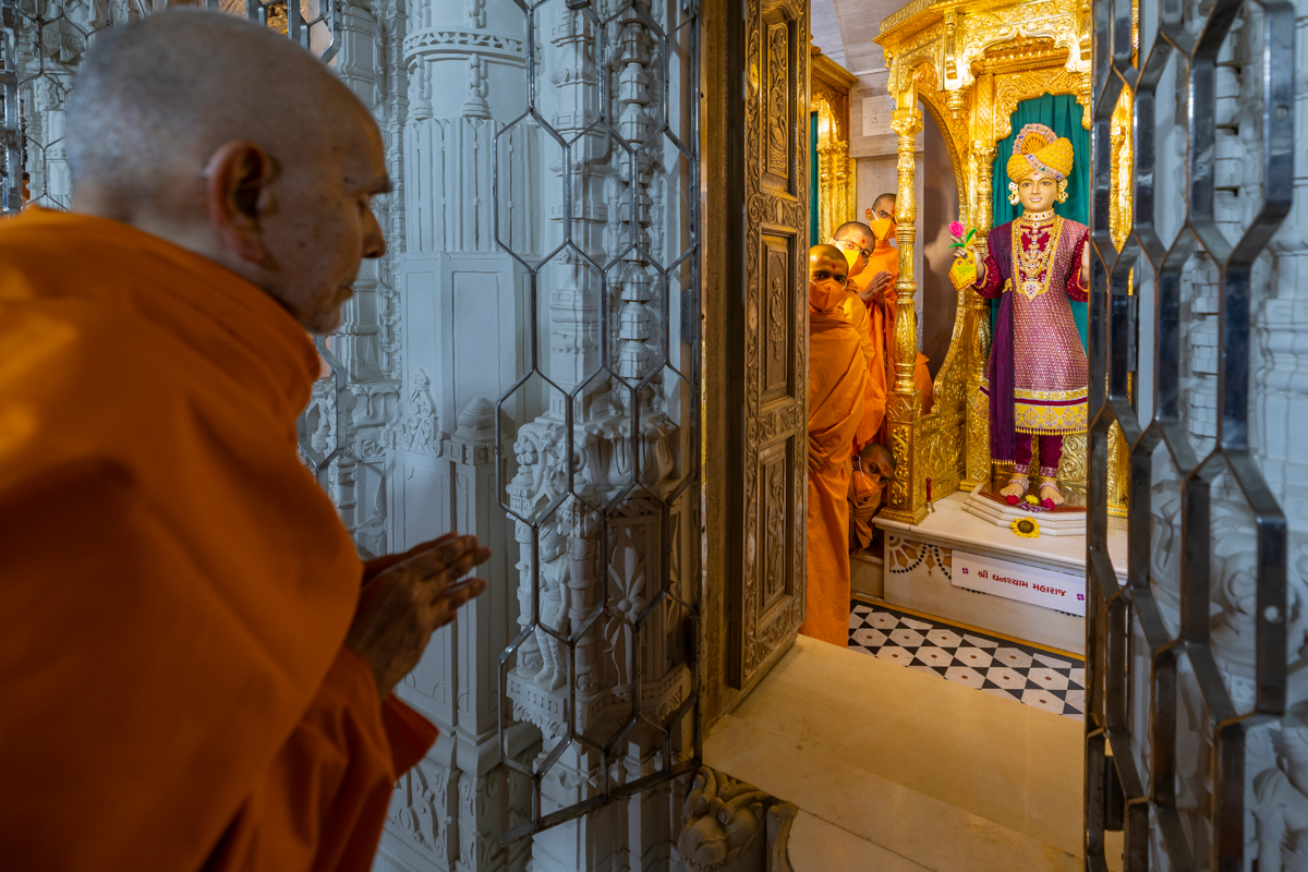 Swamishri engrossed in darshan of Bhagwan Swaminarayan, Aksharbrahma Gunatitanand Swami and Shri Gopalanand Swami