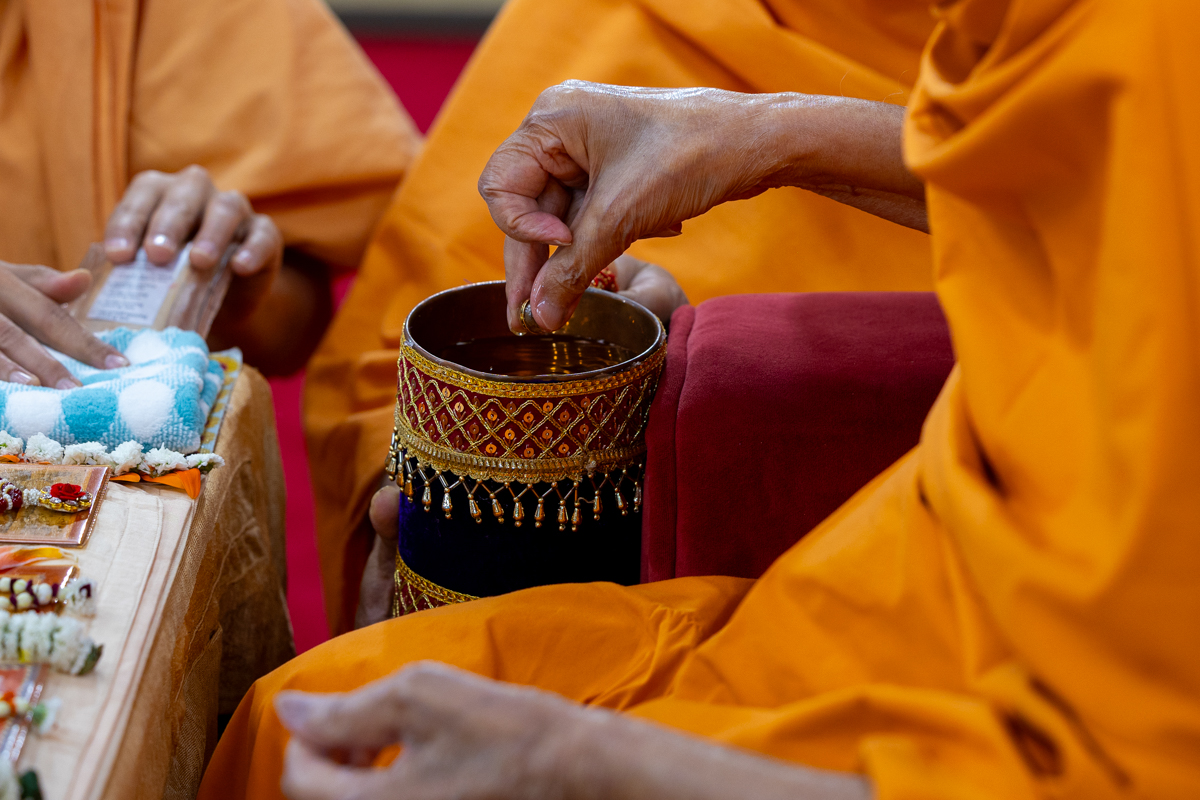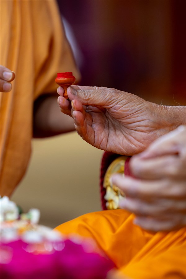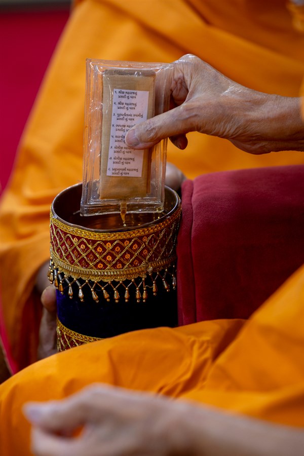 Swamishri sanctifies water with the holy relics of Bhagwan Swaminarayan and the Guru Parampara