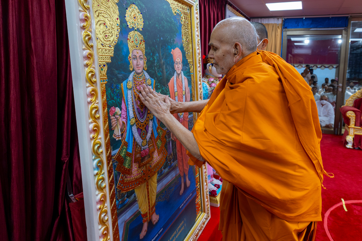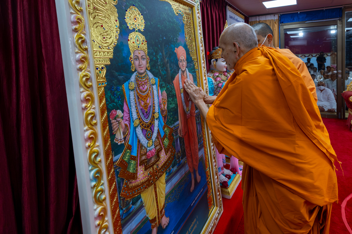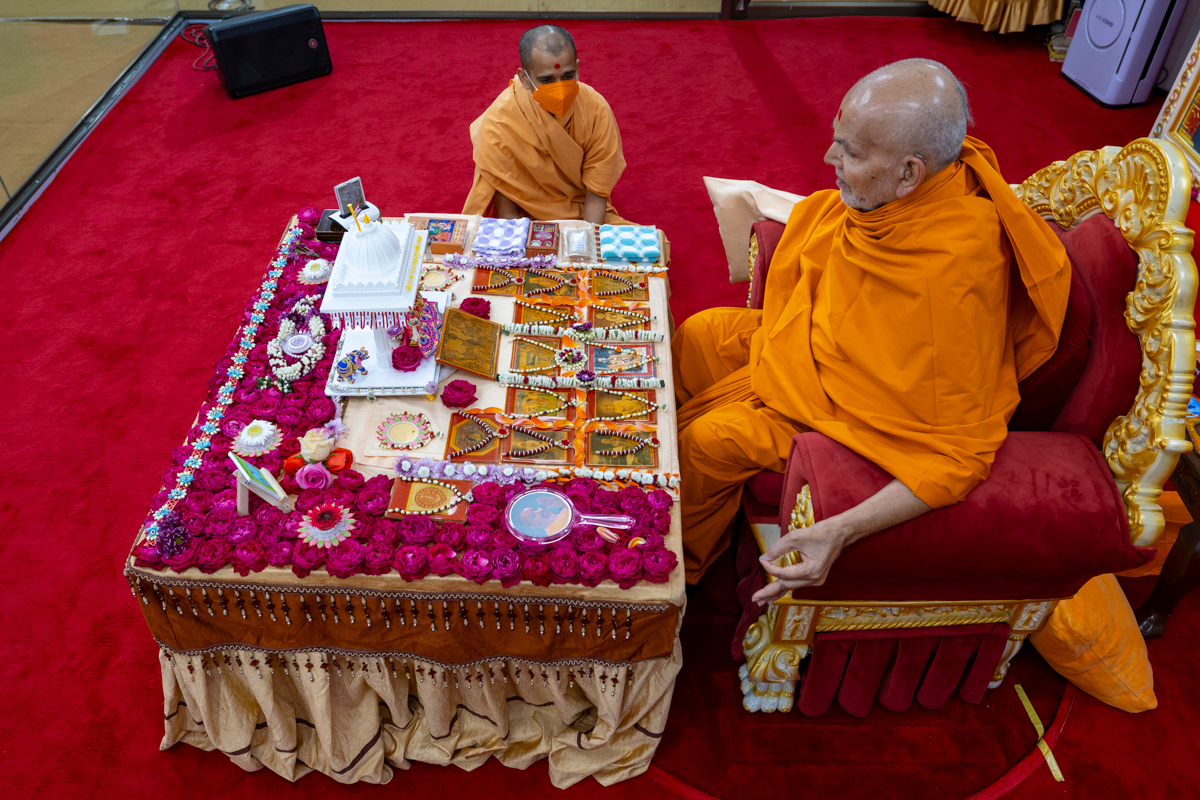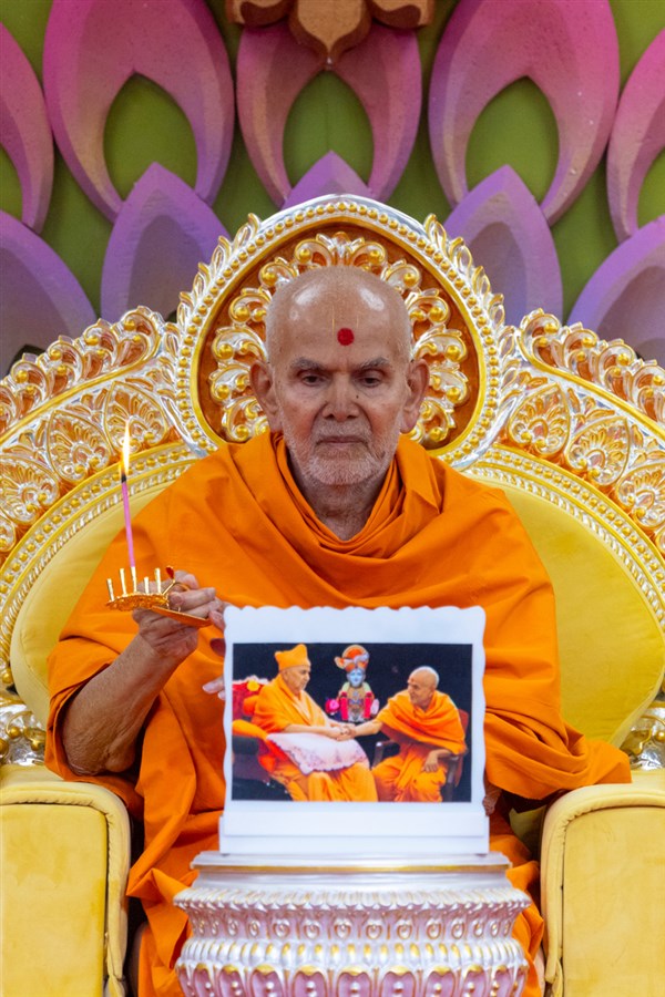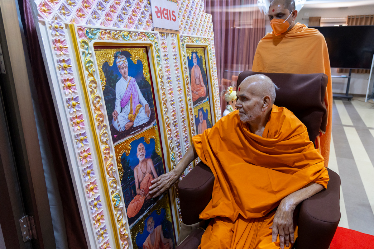 Swamishri engrossed in darshan of Shri Harikrishna Maharaj and Shri Gunatitanand Swami Maharaj