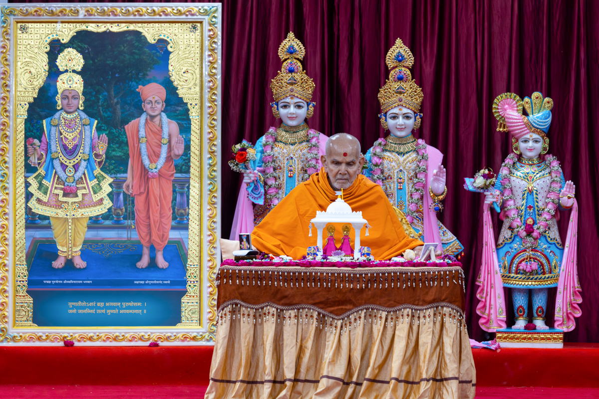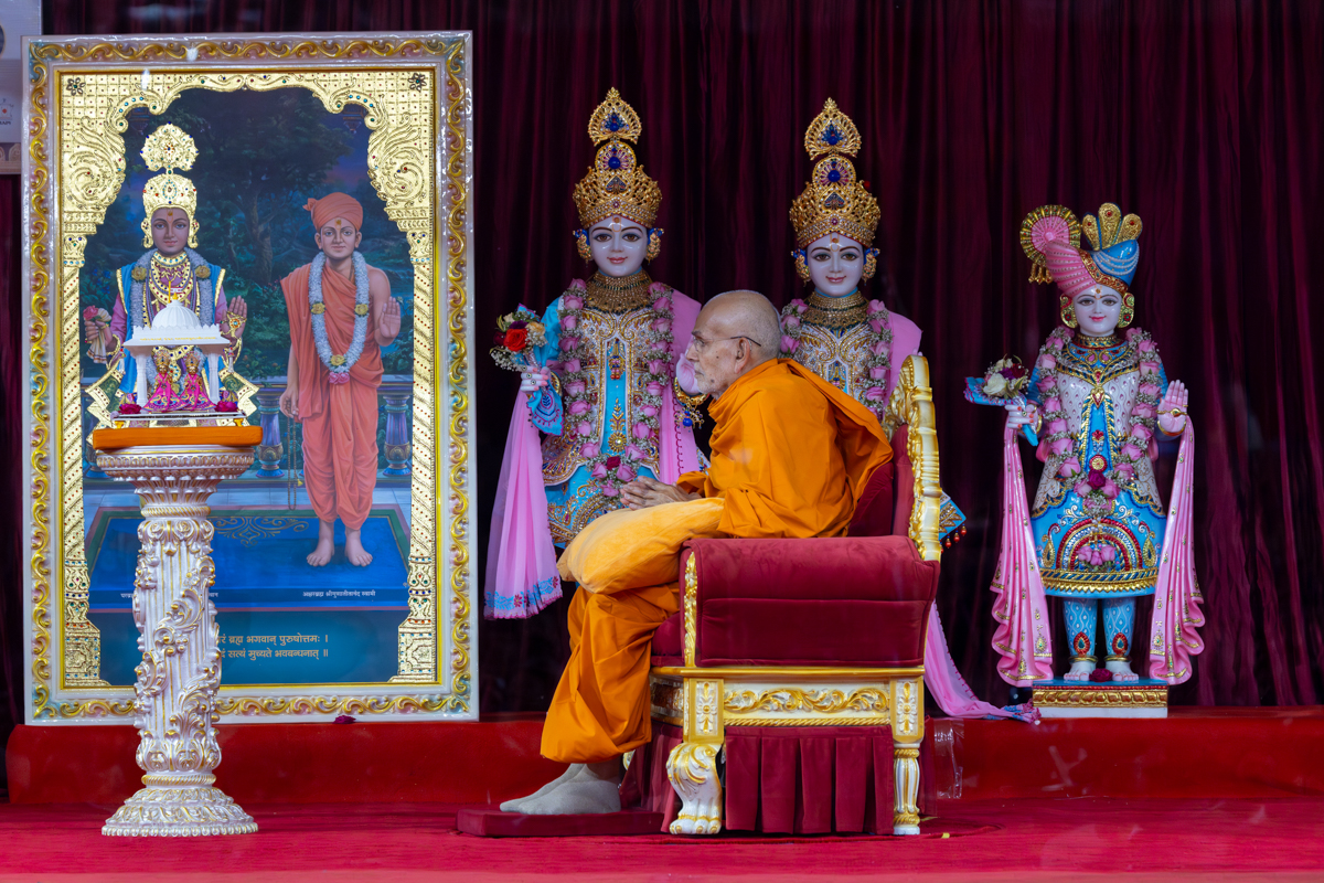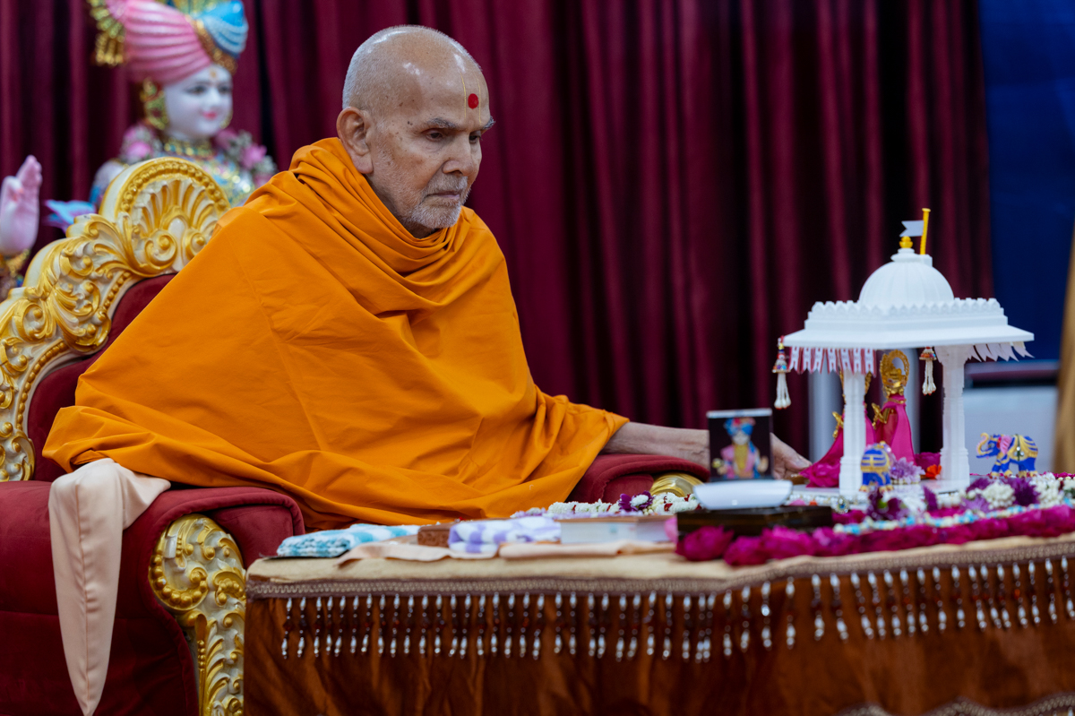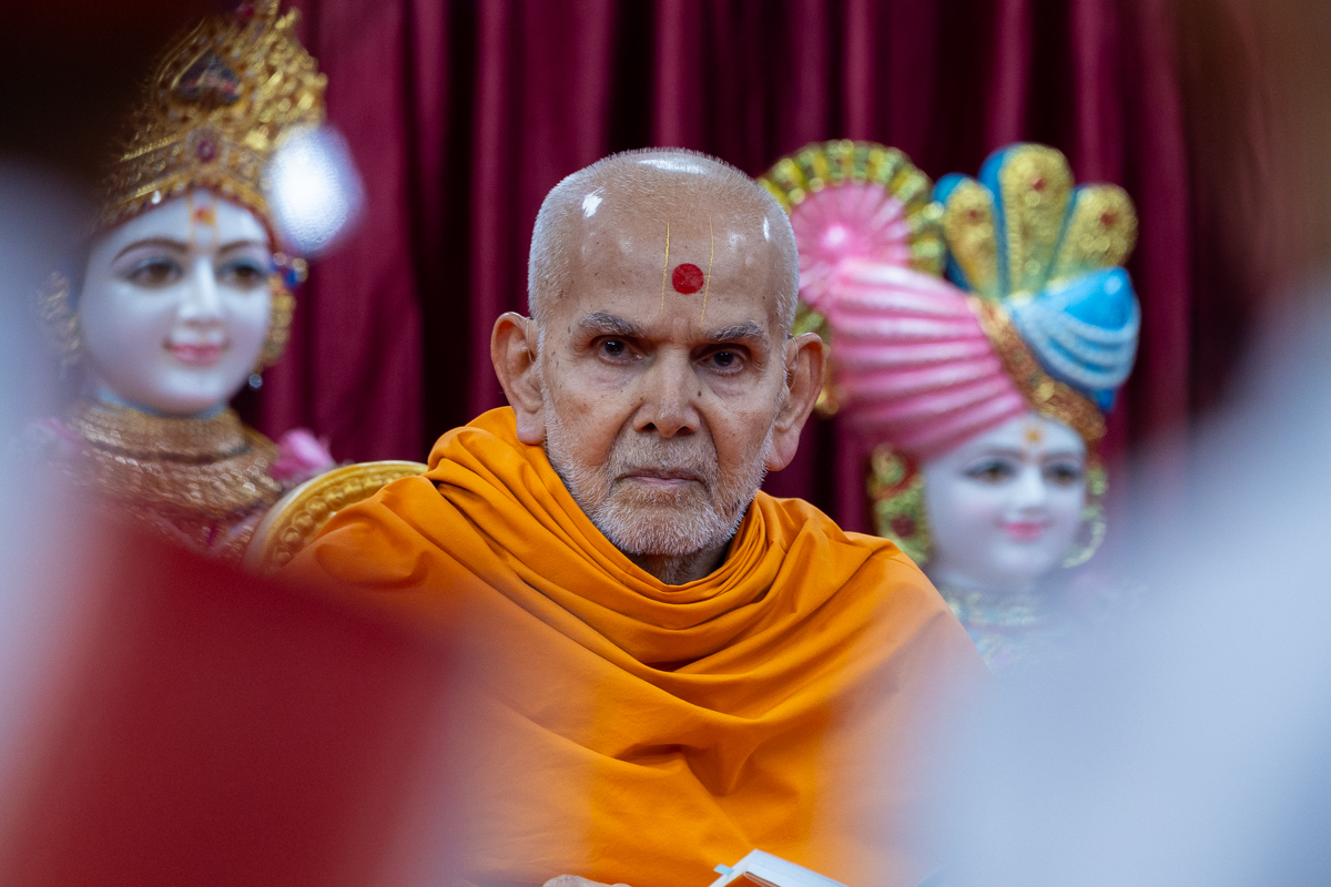 Swamishri engrossed in darshan of Shri Harikrishna Maharaj and Shri Gunatitanand Swami Maharaj