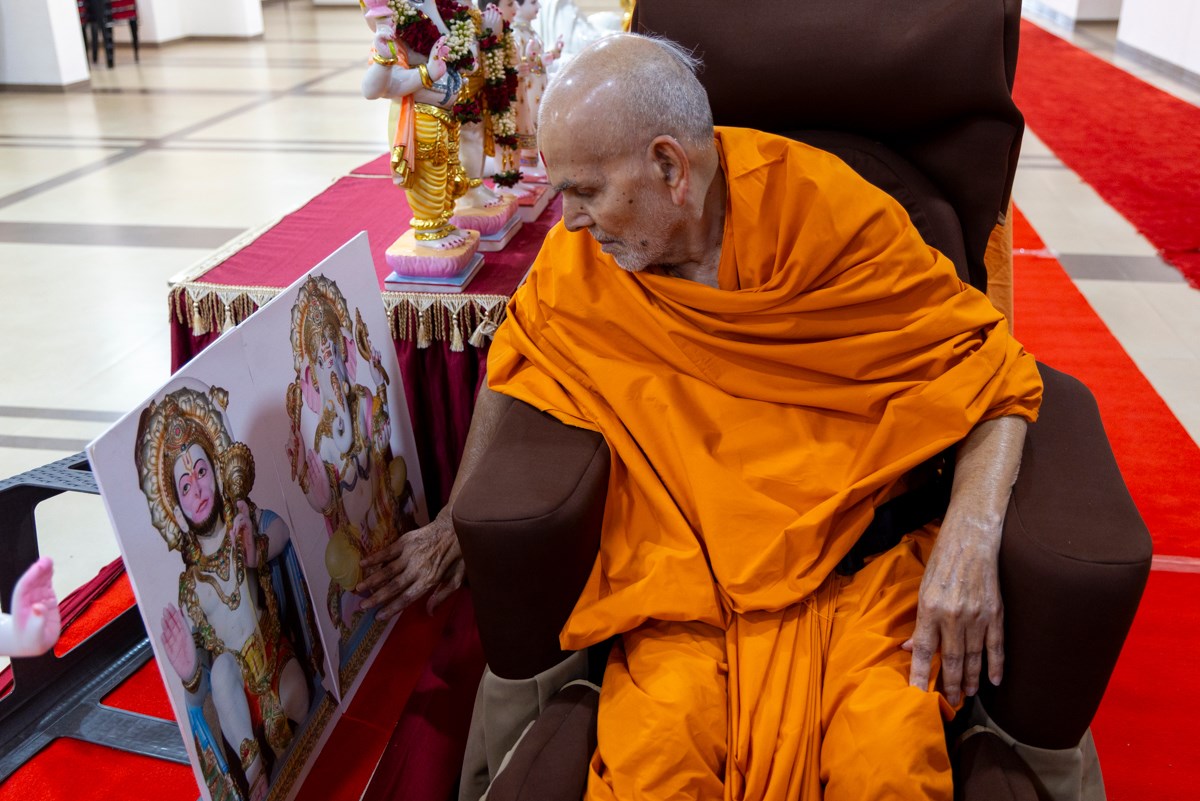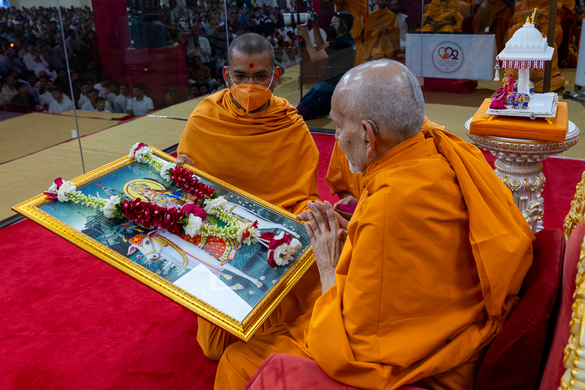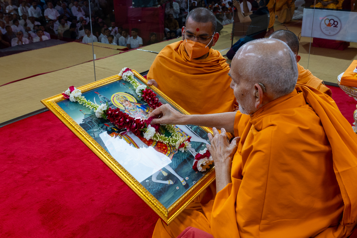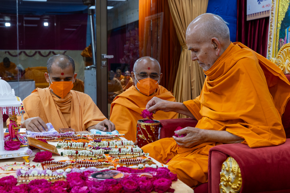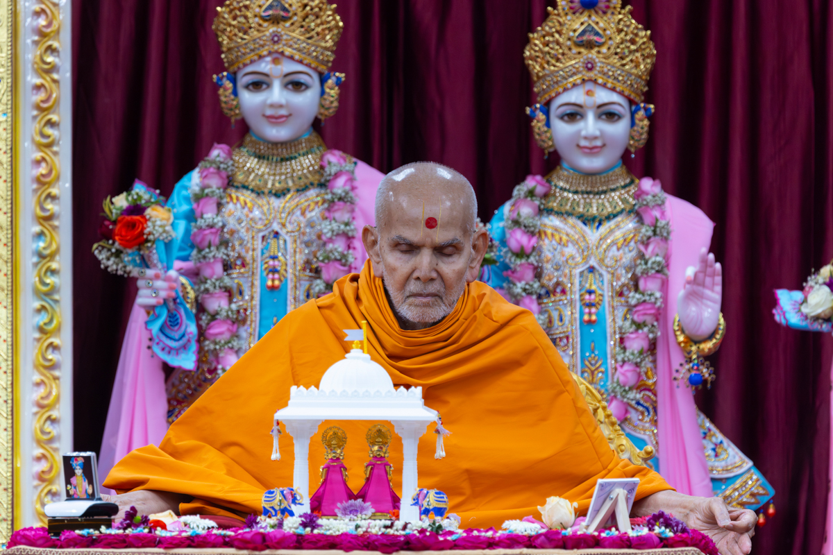 Swamishri engrossed in darshan of Shri Harikrishna Maharaj and Shri Gunatitanand Swami Maharaj