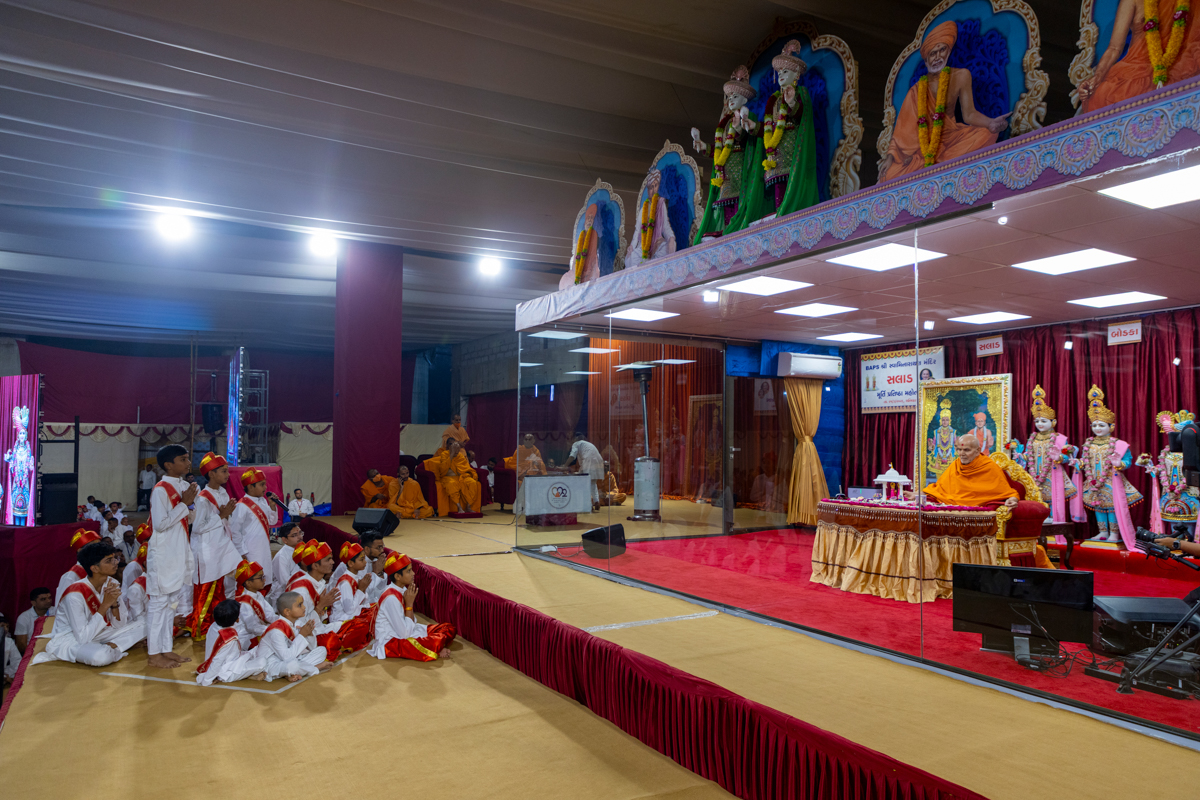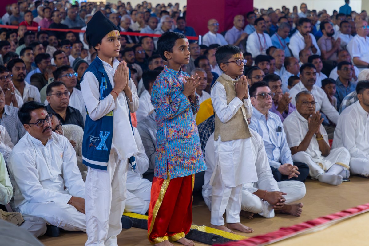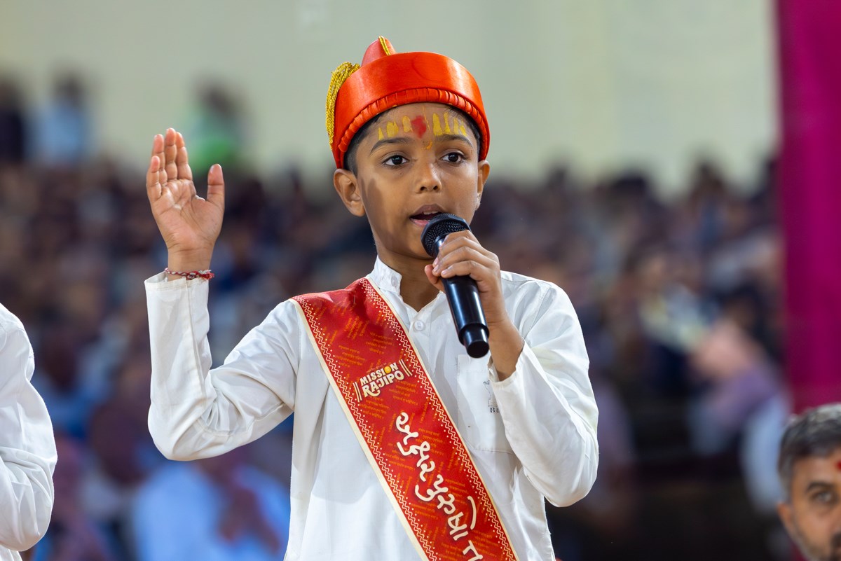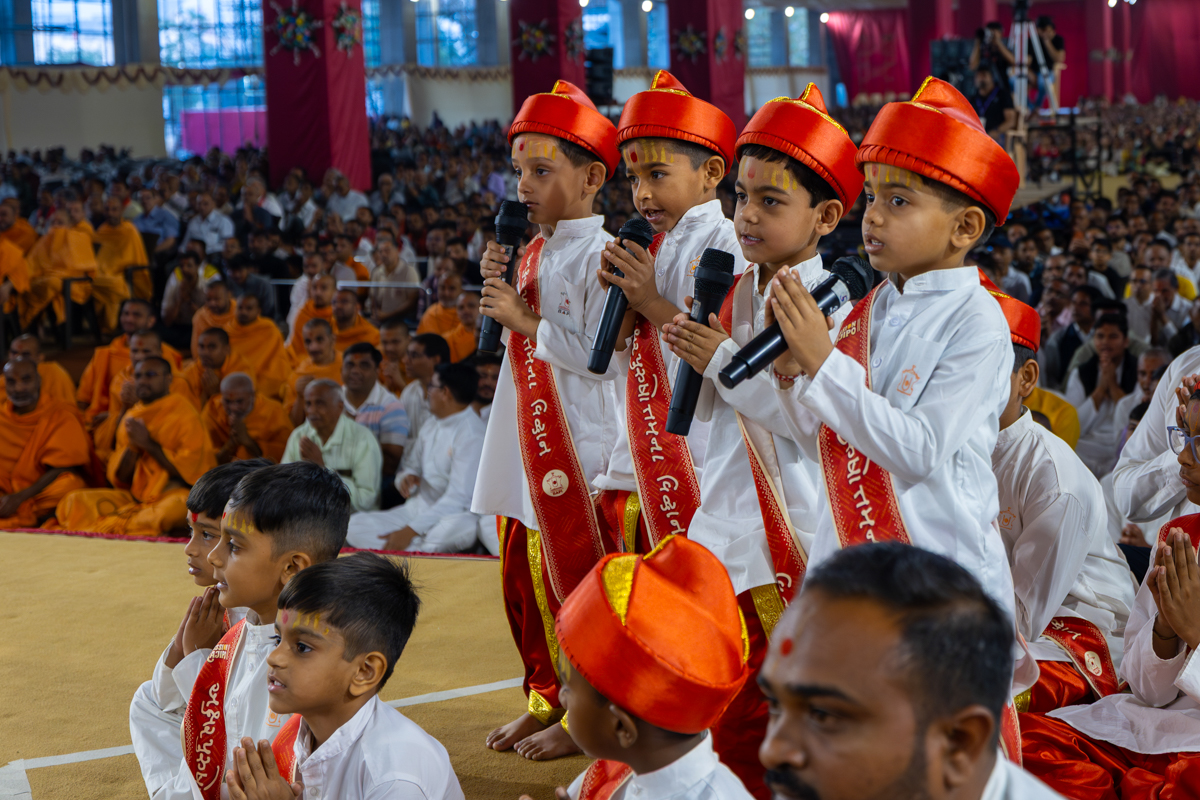 Balaks lead everyone in reciting the sadhana mantra and daily prayer in Swamishri's puja