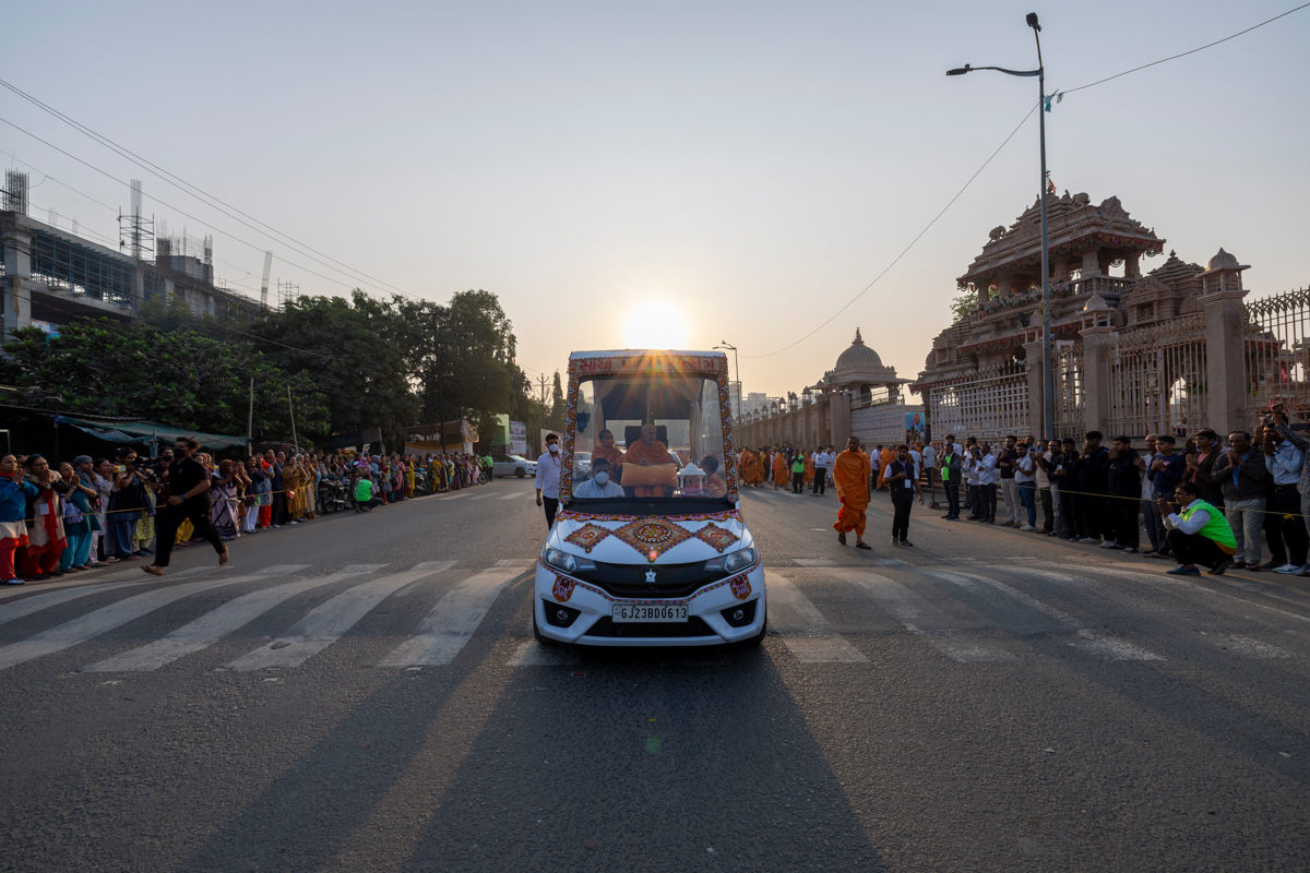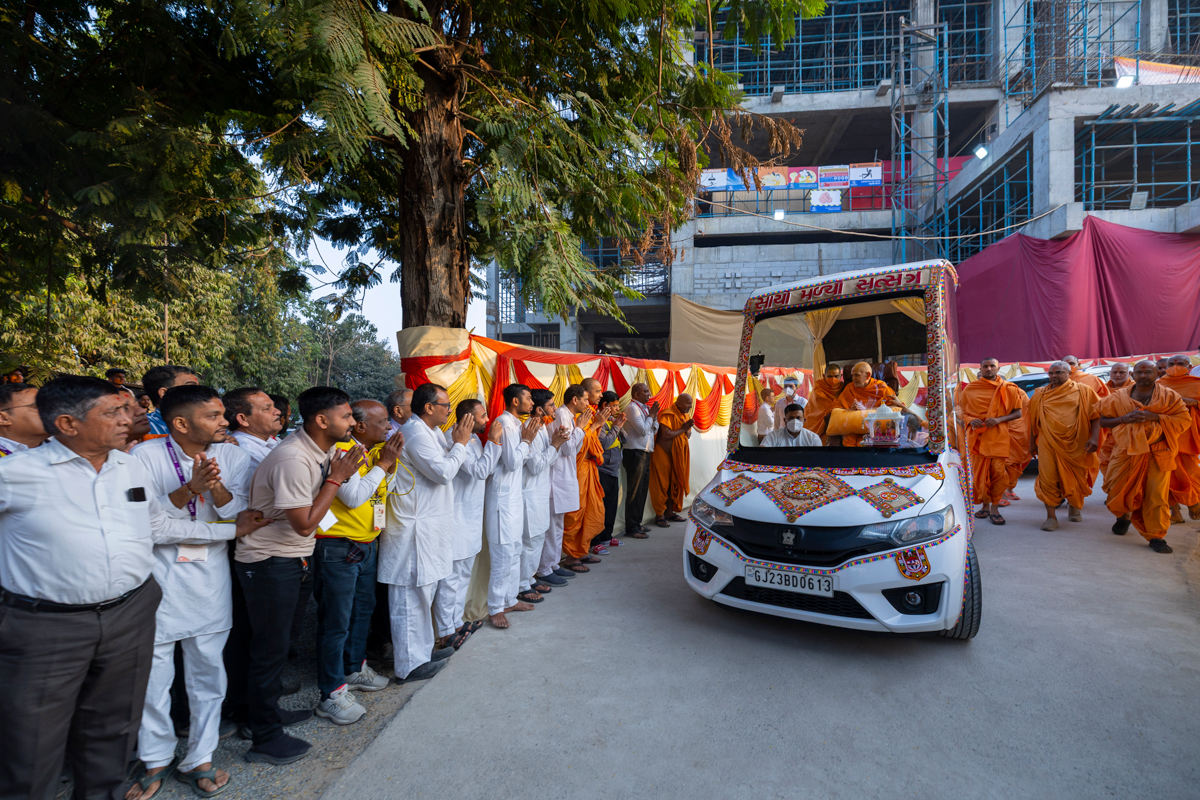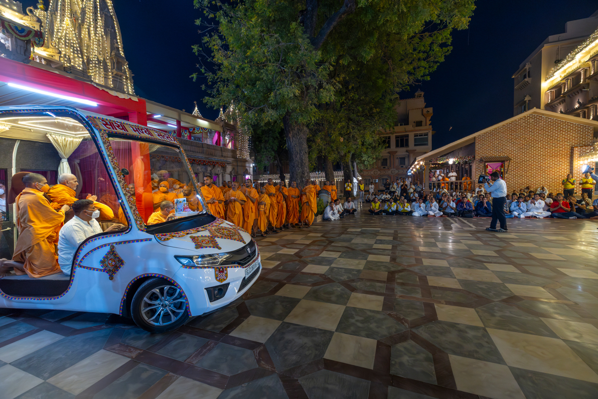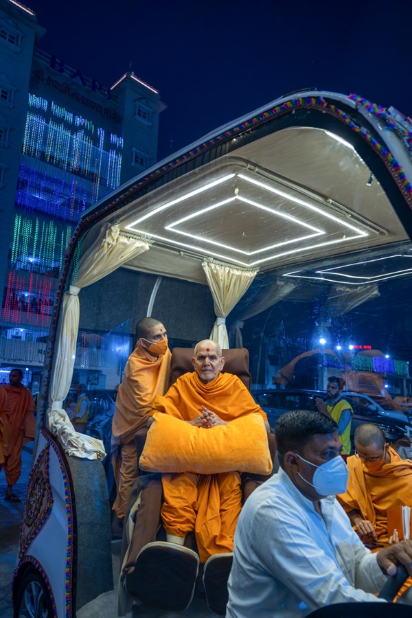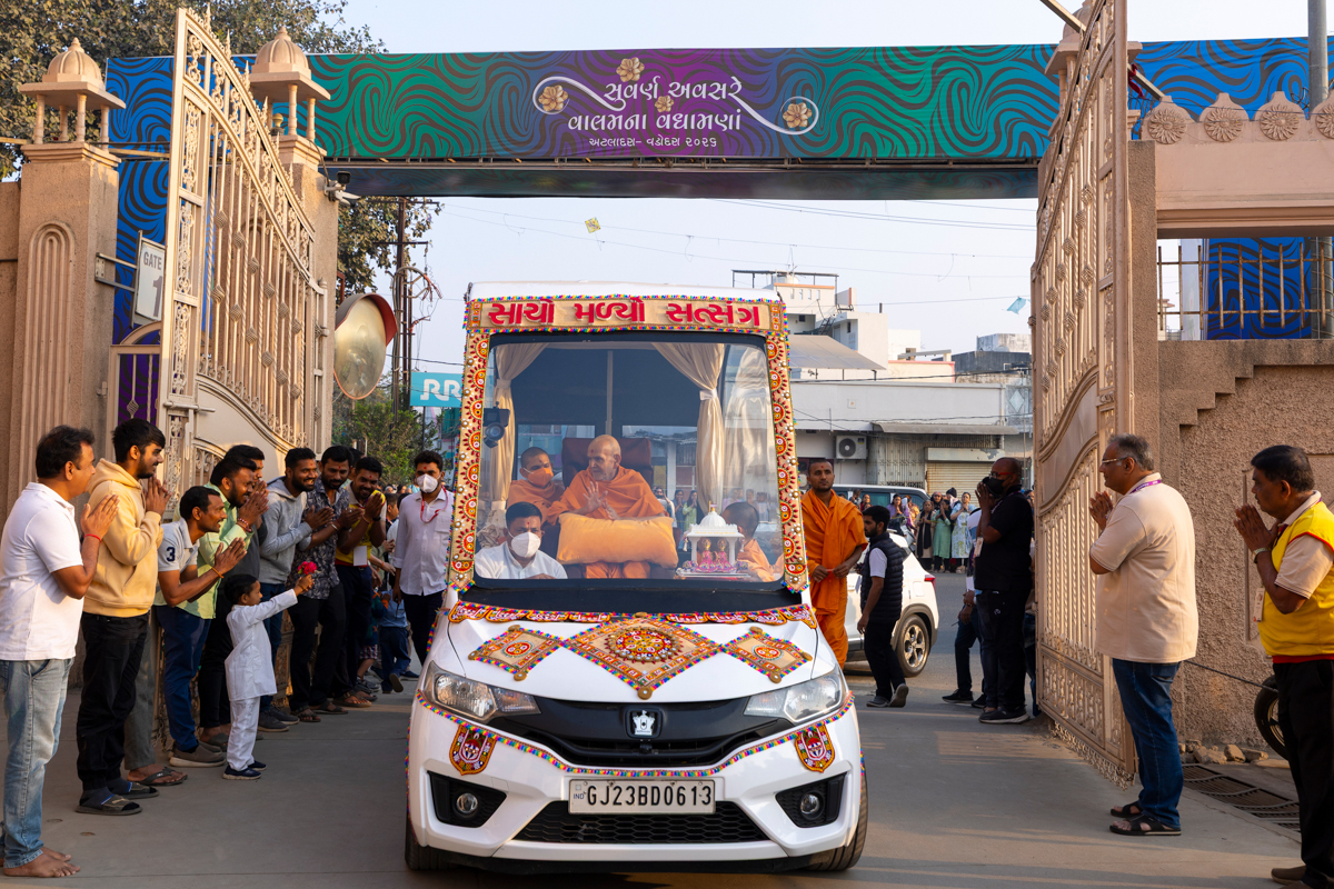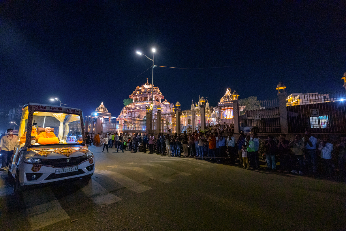 Swamishri returns to BAPS Shri Swaminarayan Mandir, Atladara (Vadodara), after his daily puja