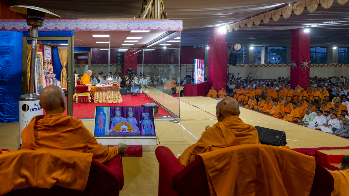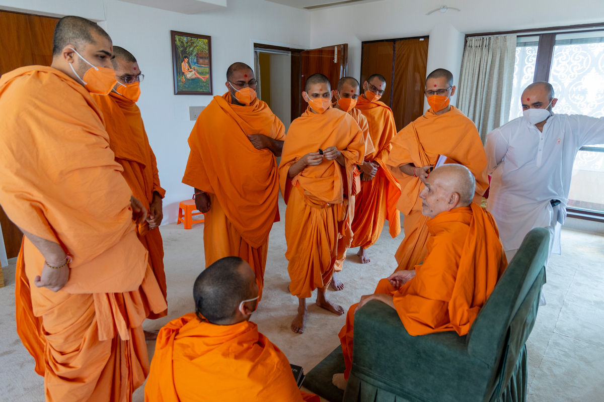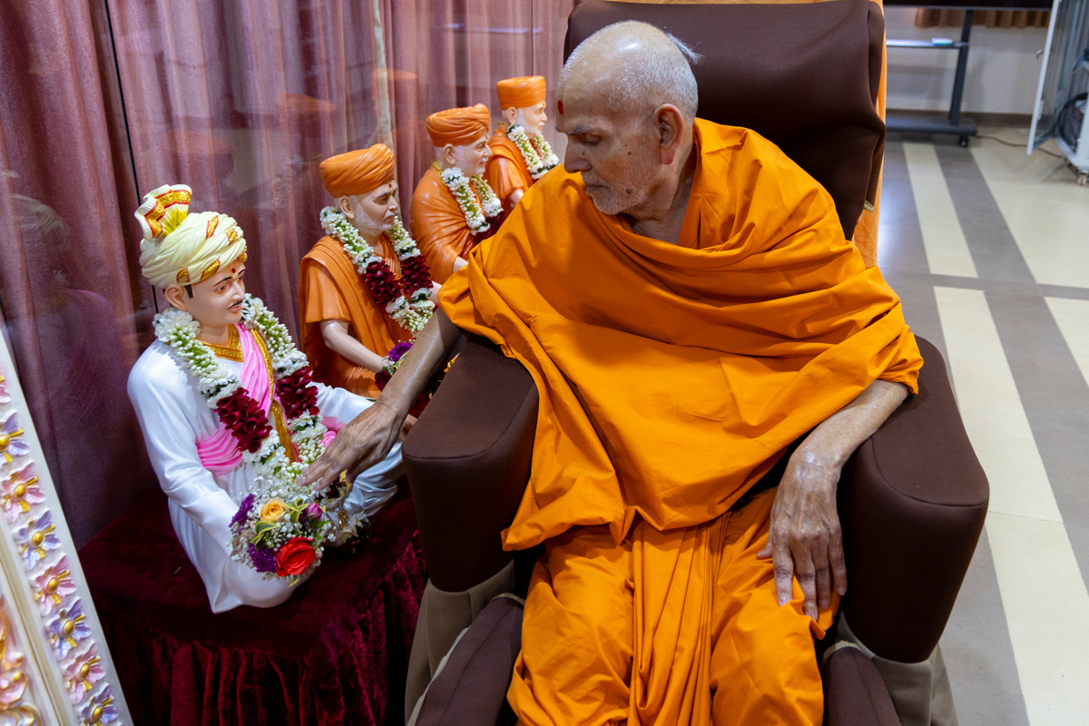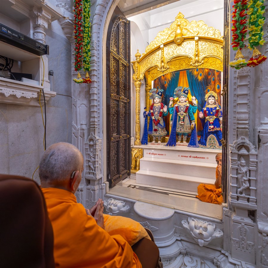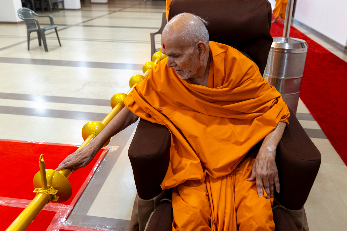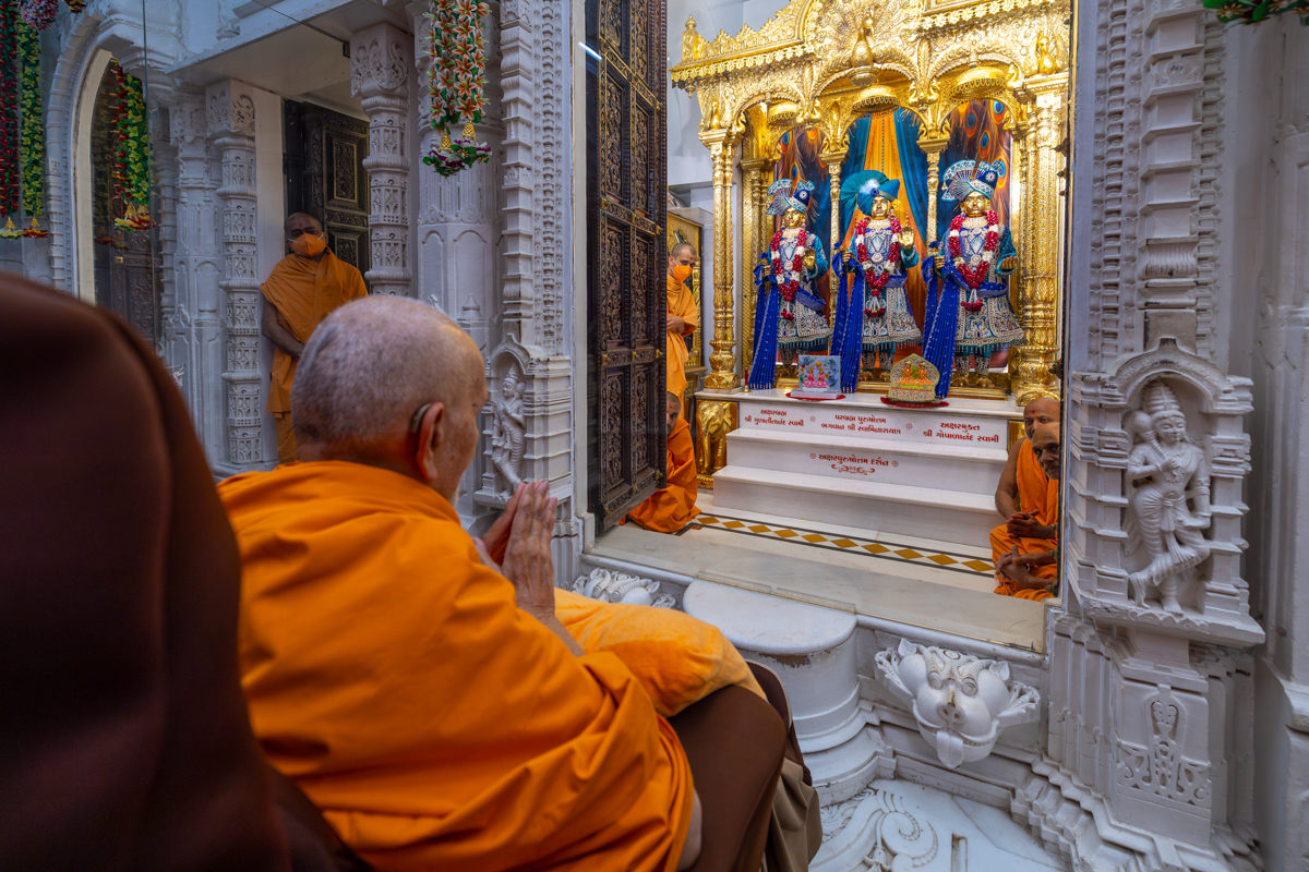 Swamishri returns to BAPS Shri Swaminarayan Mandir, Atladara (Vadodara), after his daily puja