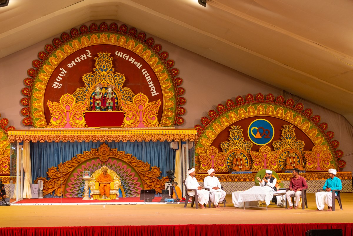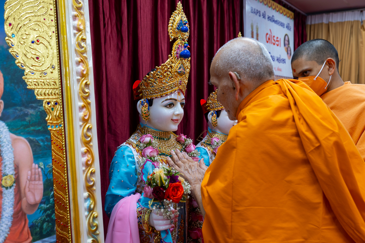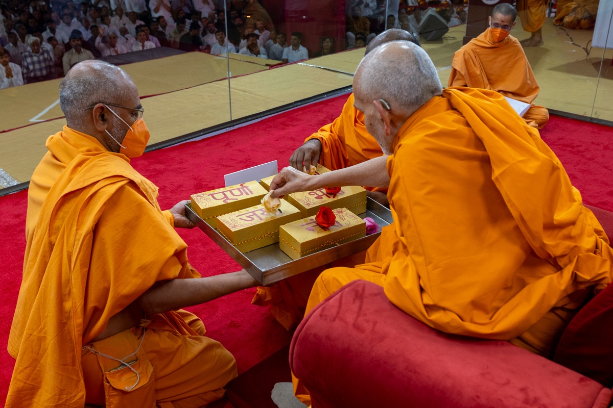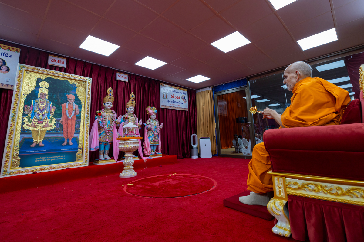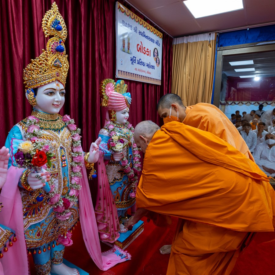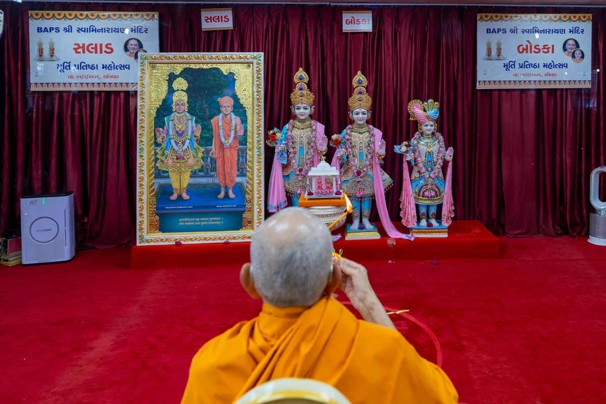 Swamishri performs the murti-pratishtha rituals for the new BAPS Shri Swaminarayan Mandirs in Salad and Bodka, India