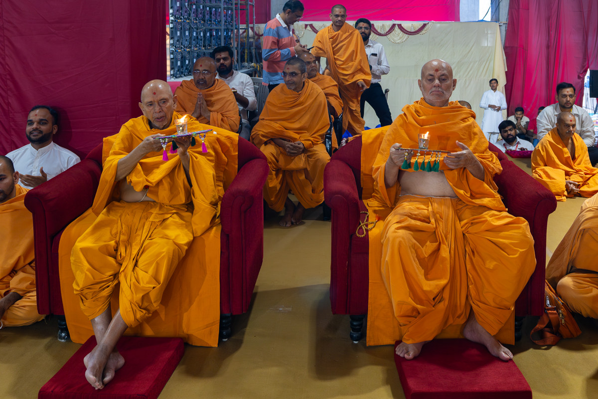 Pujya Tyagvallabh Swami and Pujya Viveksagar Swami perform the arti