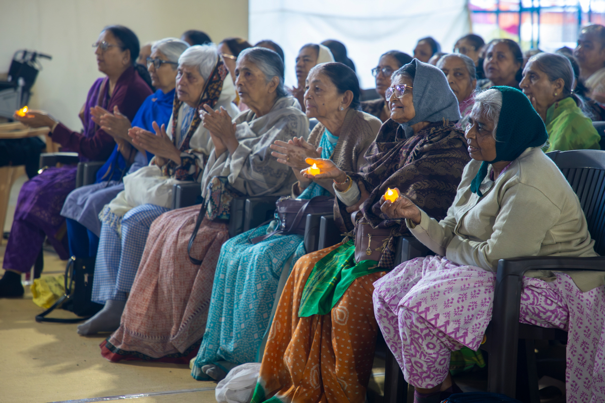 Senior swamis, swamis and devotees doing Swamishri's puja darshan