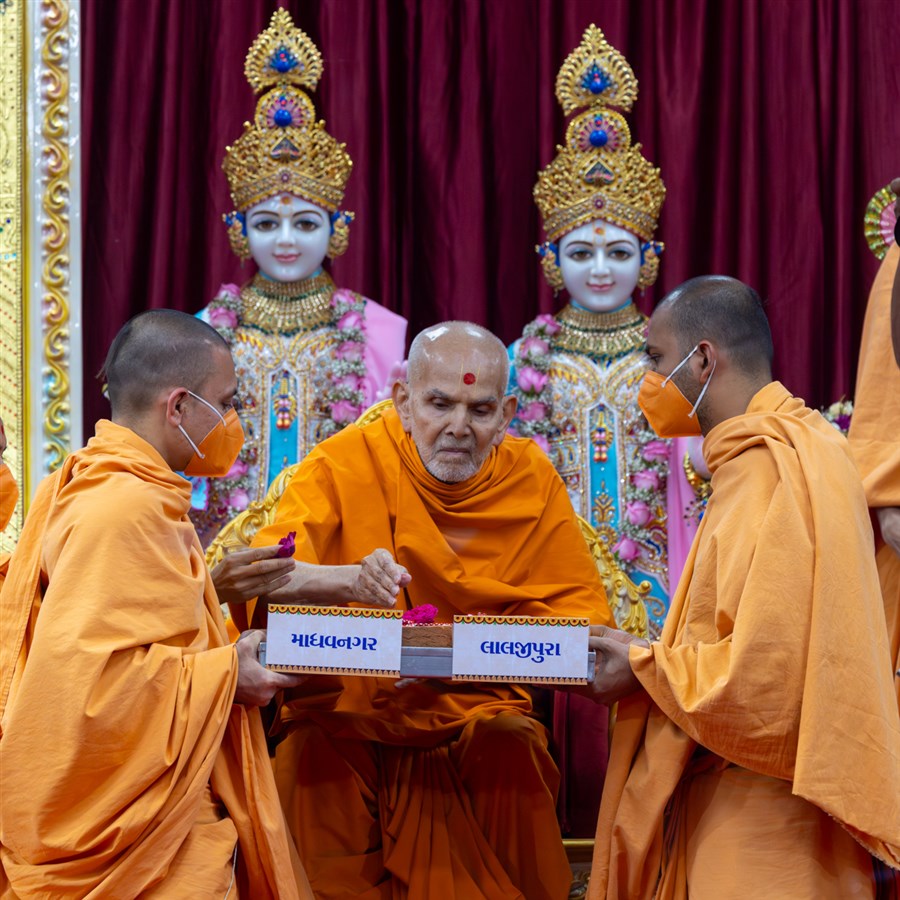 Swamishri sanctifies bricks to start construction at BAPS Shri Swaminarayan Mandirs in Madhavnagar and Laljipura, India