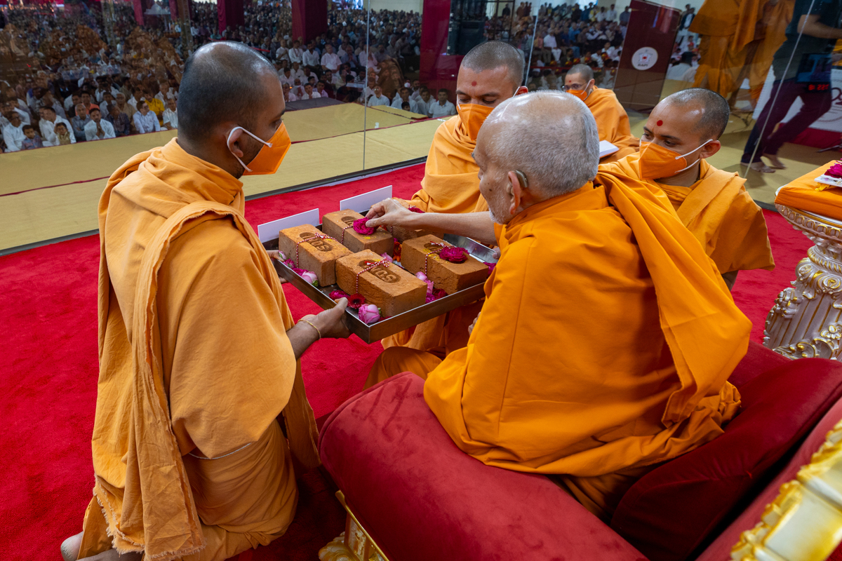 Swamishri sanctifies bricks for the Shri Umiya Dham, Tarsali, Vadodara
