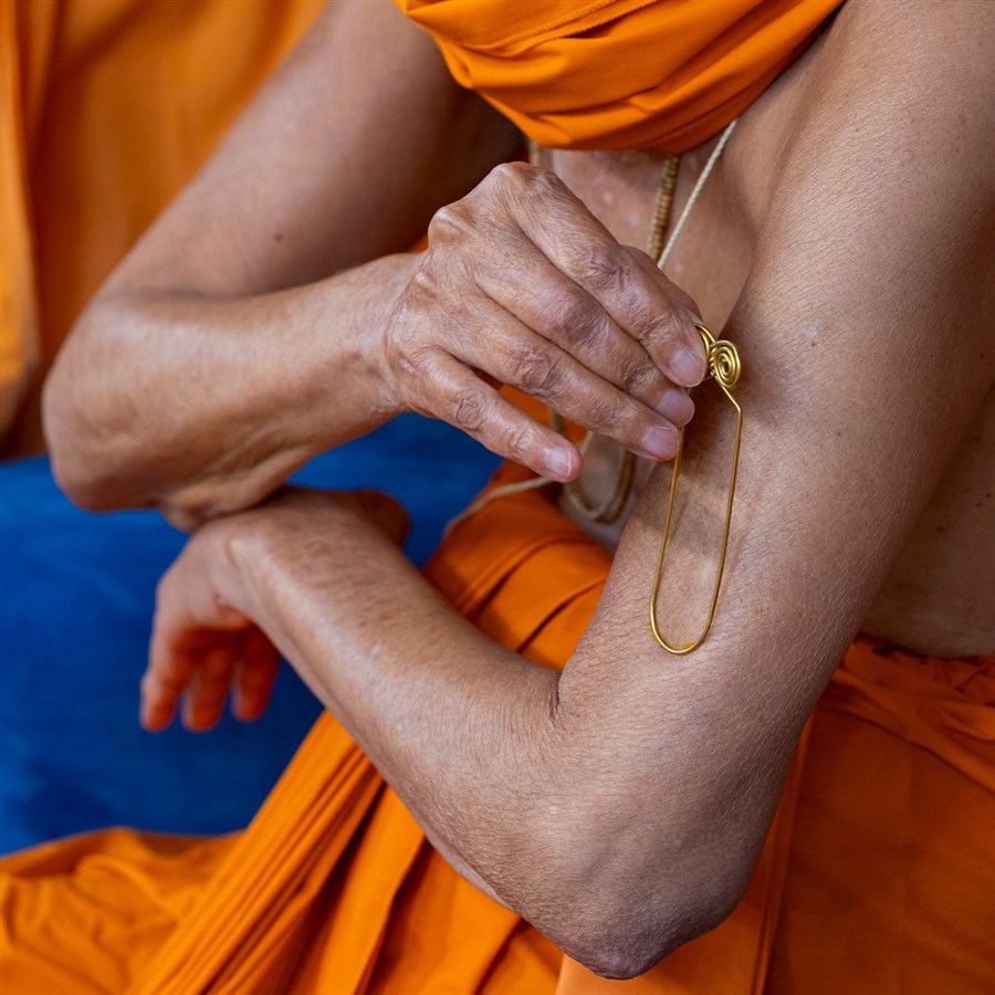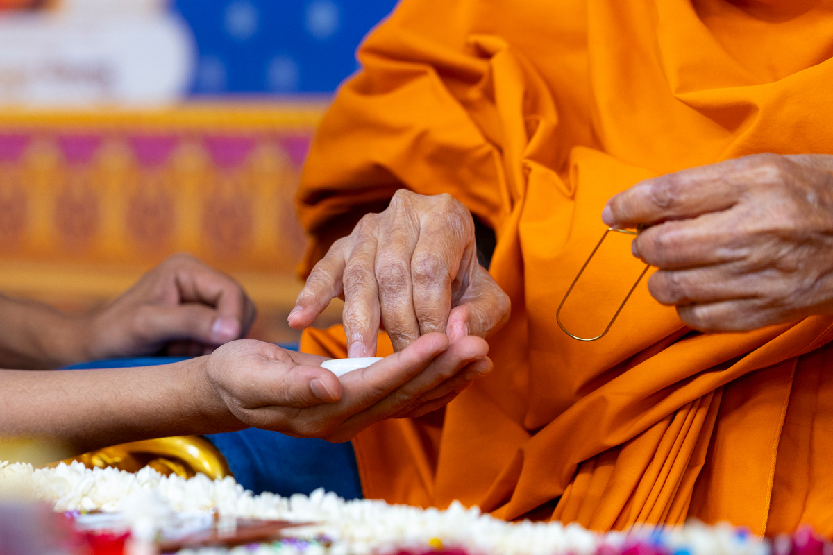 Swamishri applies a tilak on his upper arm